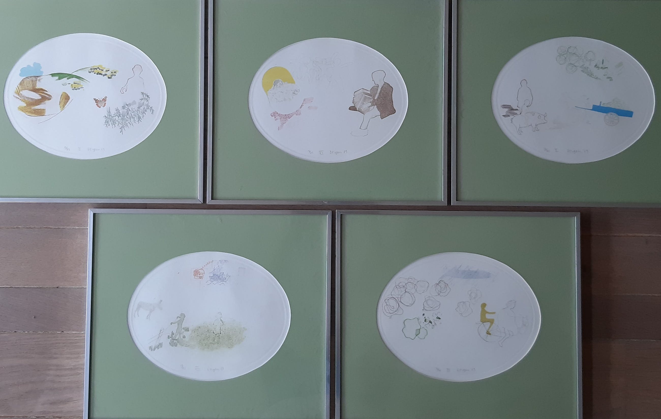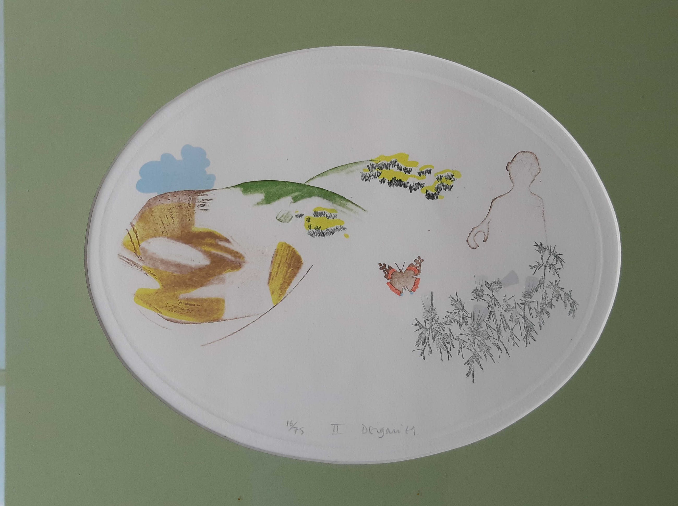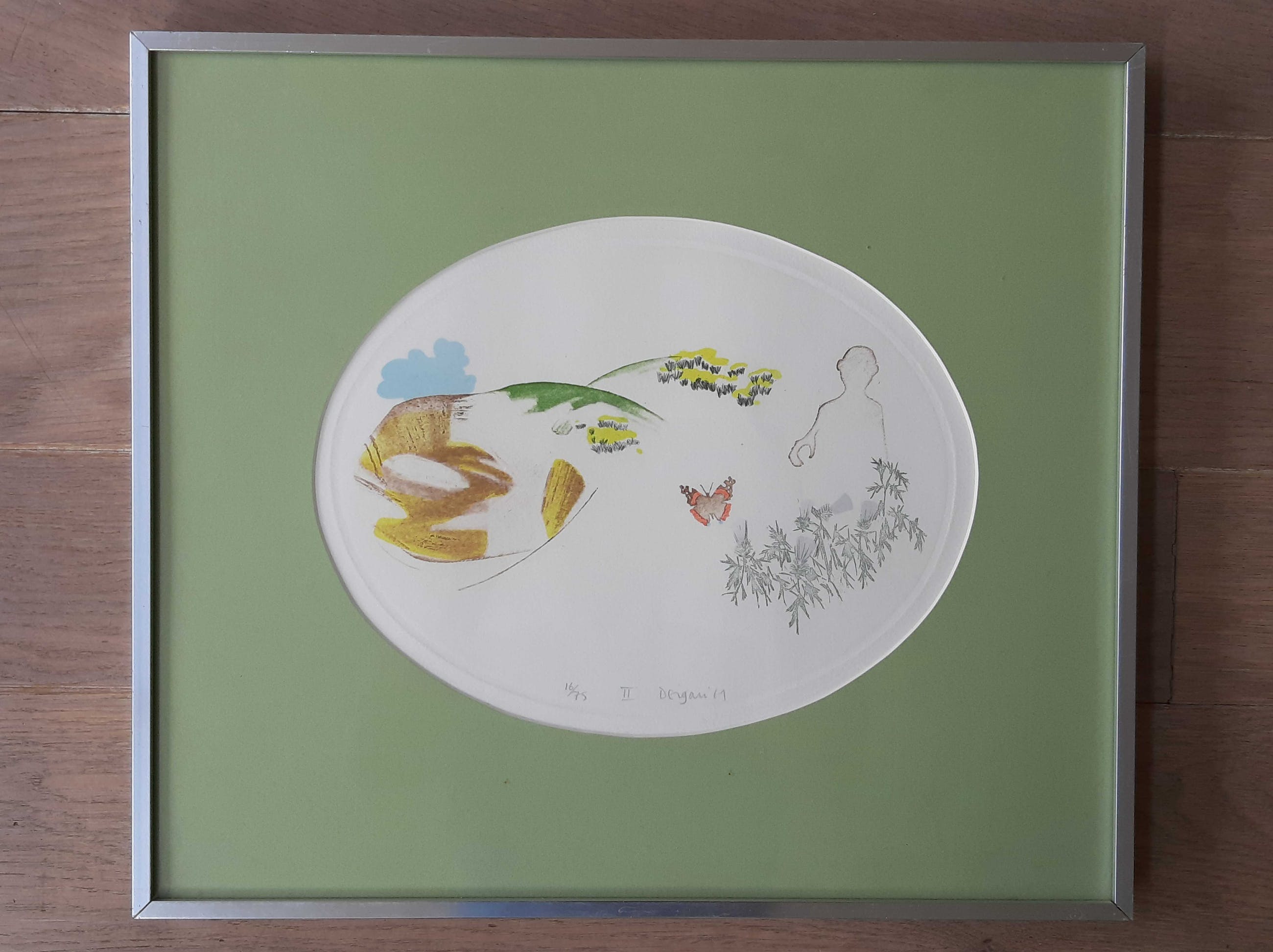 Bijzondere aquatint etsen van Anthony Deigan (1949). Zeer bekende kleurenetsen uit 1989 met een oplage van slechts 75 stuks in een fraaie lijst. Het betreft hier de series I, II, III, VI en VIII, allen genummerd (16/75) en gesigneerd. In een galerie in New York werden deze tot voor kort nog aangeboden voor $250,= per stuk.