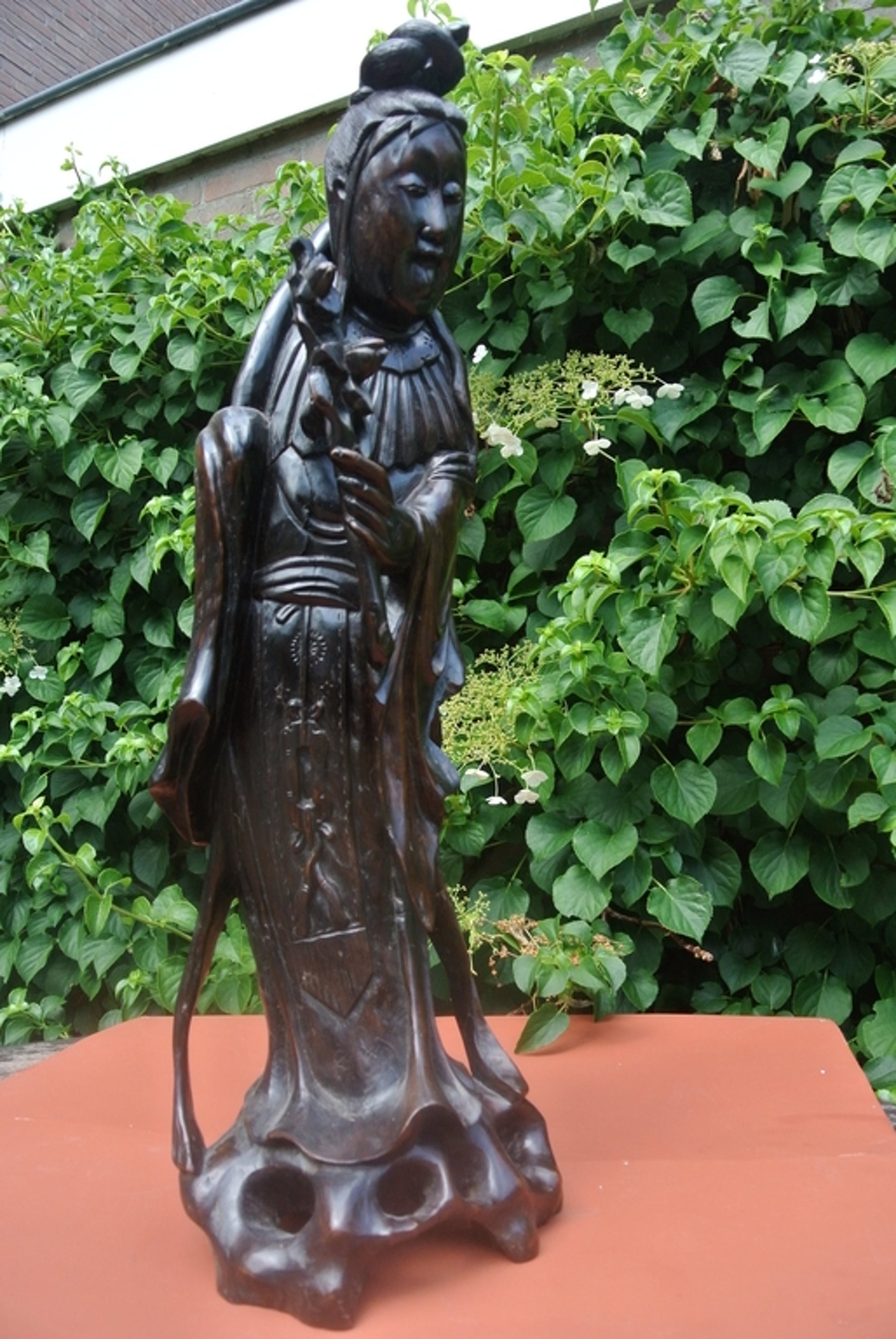 Dit prachtige hardhouten beeld stamt uit de 19e eeuw, is 67.5 cm hoog en is zeer kundig rondom gesneden. De maten van de voet zijn 22 x 18 cm. Het beeld weegt ruim 5800 gram.
