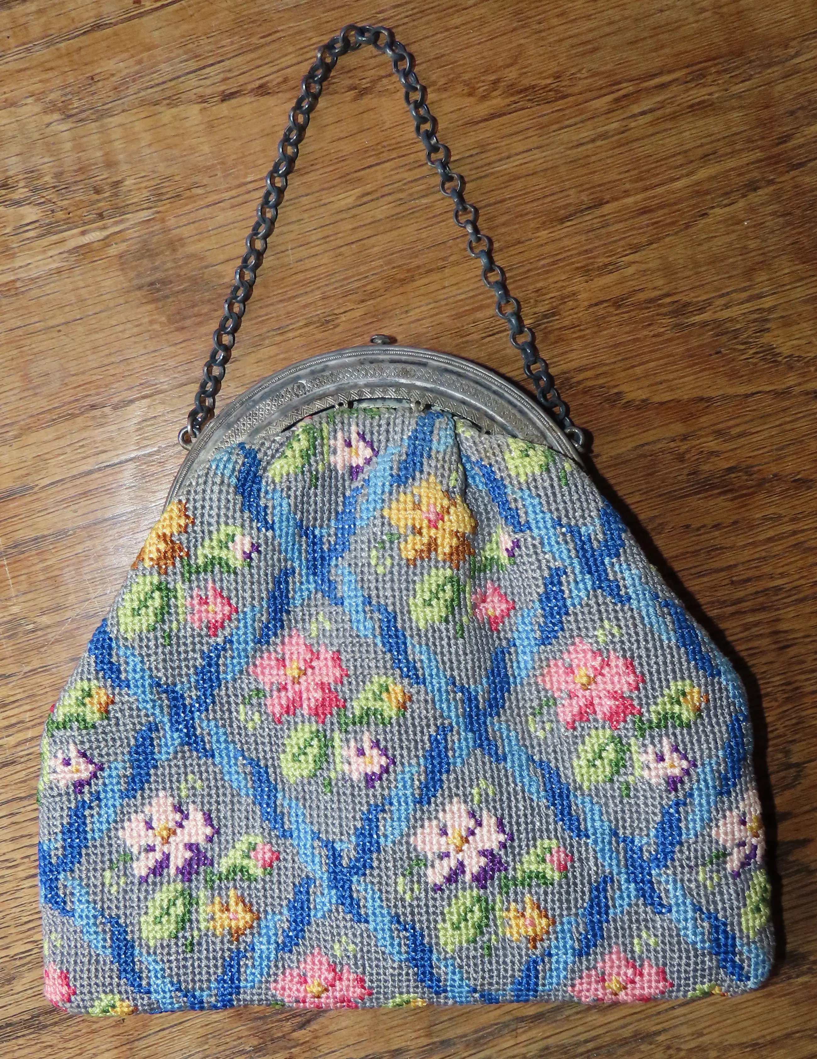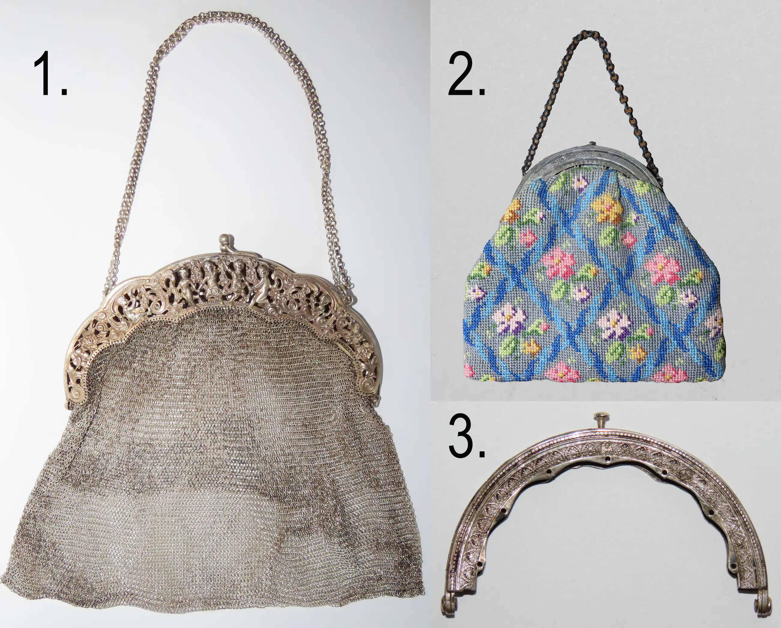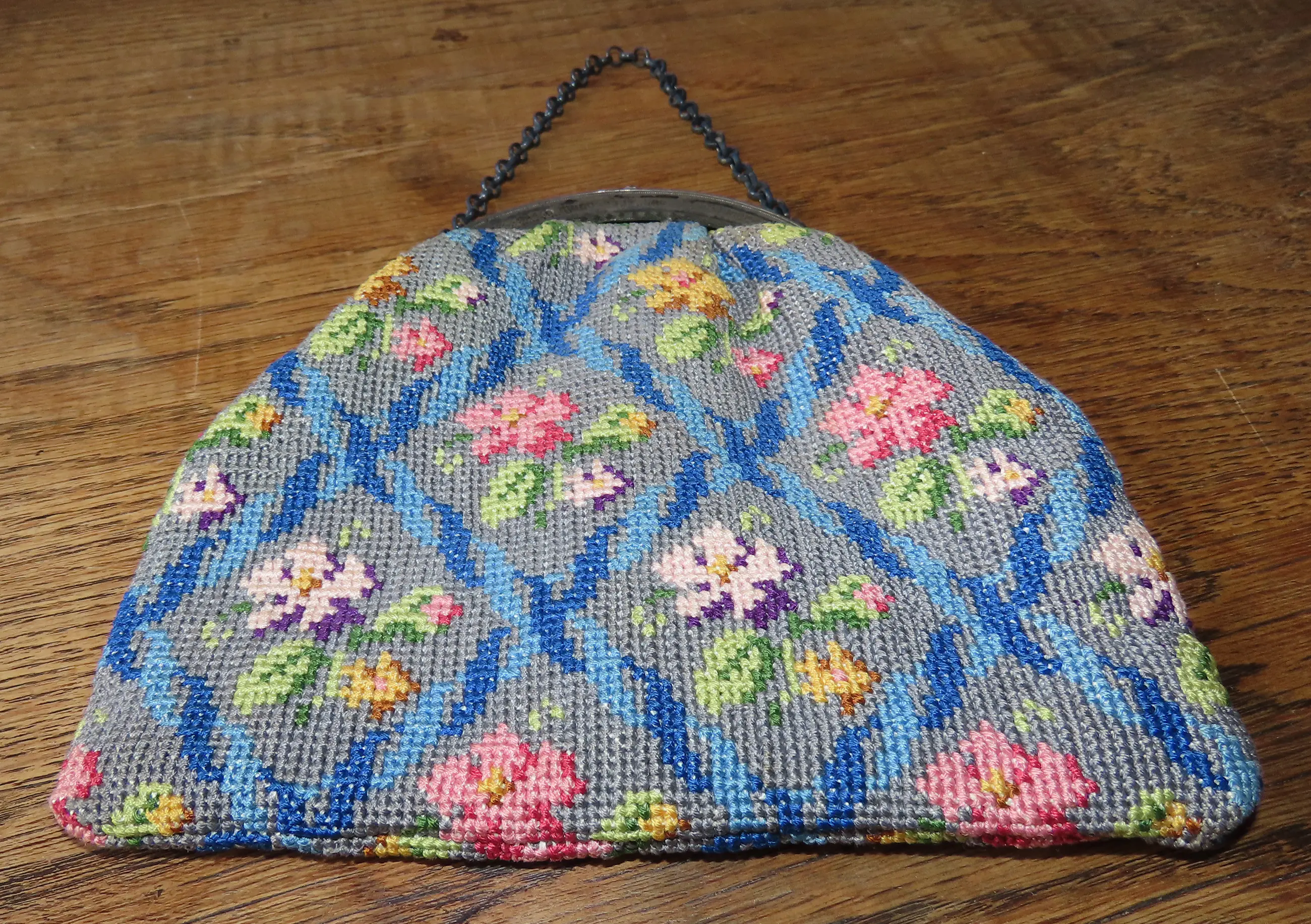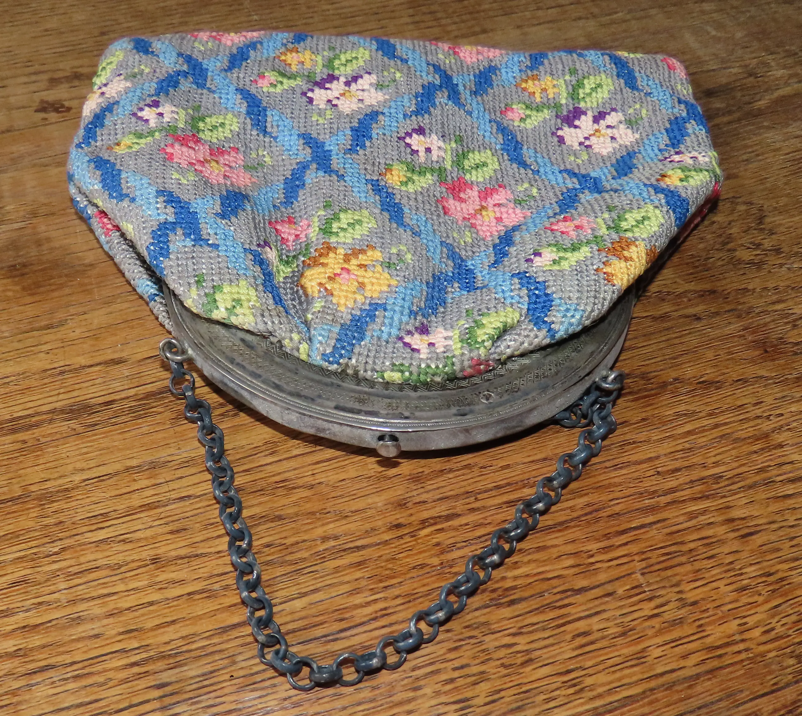Antieke zilveren beugeltas, geborduurd tasje zilveren beugel, losse antieke beursbeugel