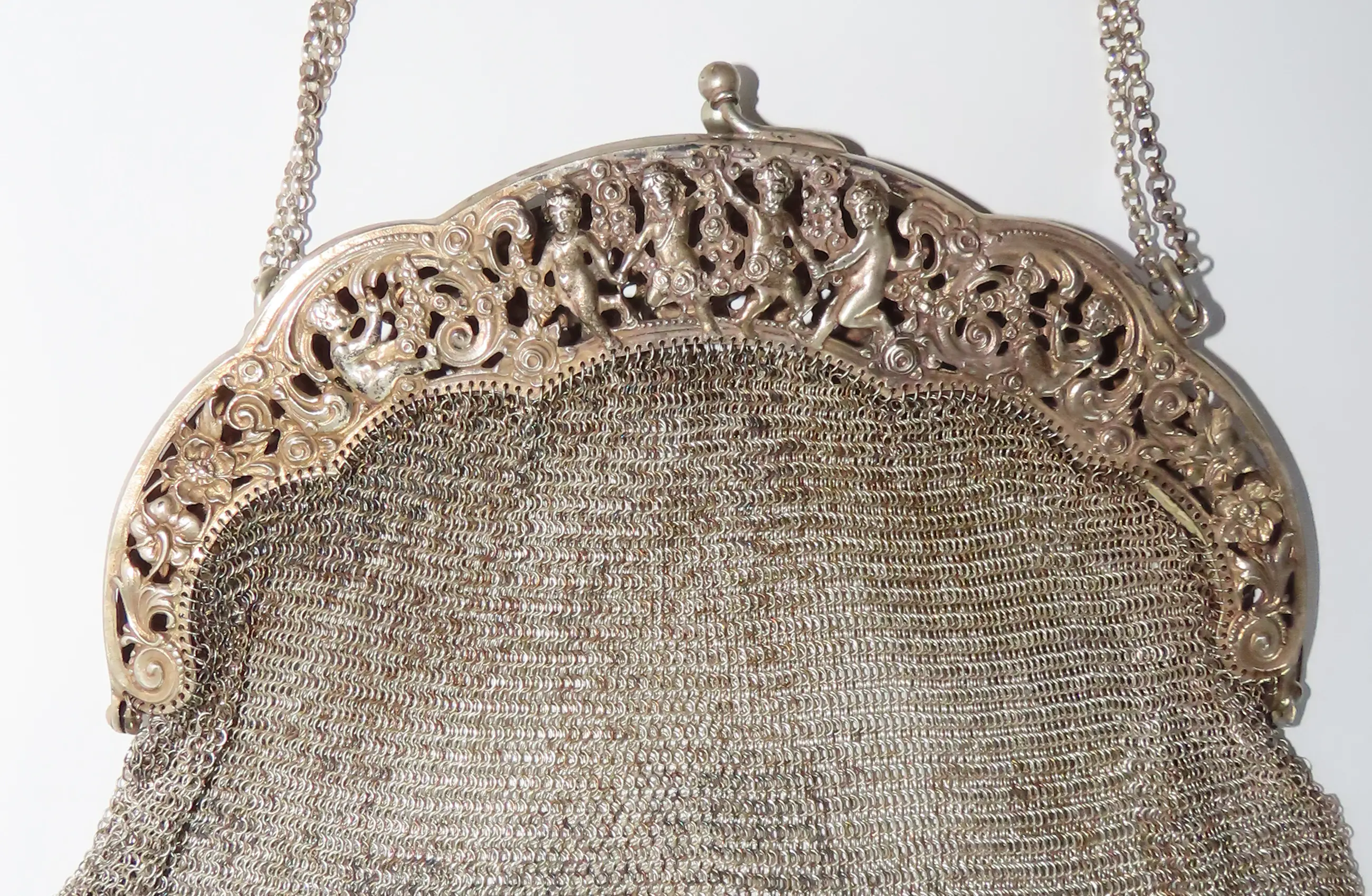 Antieke zilveren beugeltas, beugel rijkelijk gedecoreerd