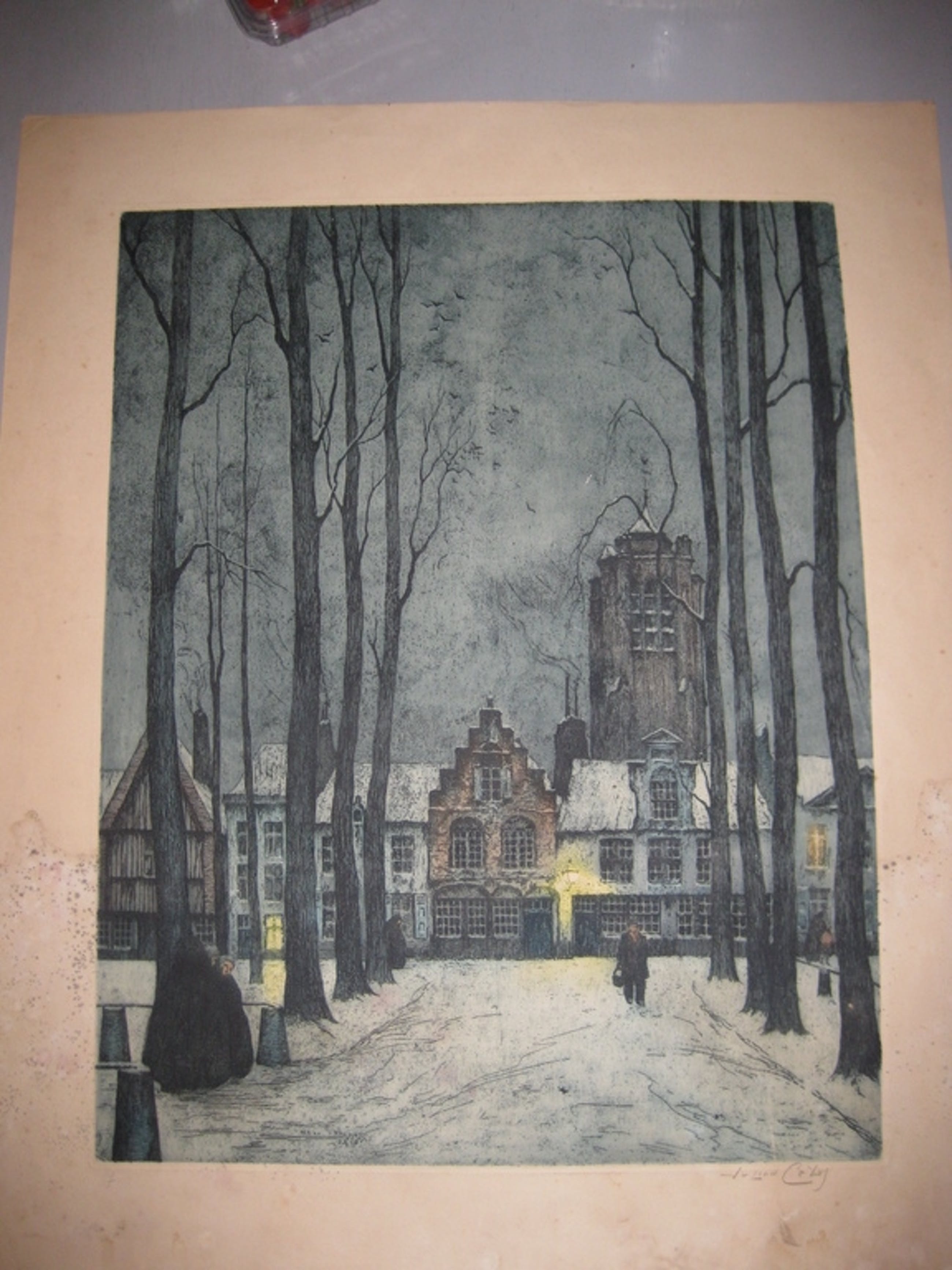 Voor schilderijen en ander ingelijst werk geldt het volgende: bij verzending kan ik geen garanties geven op het heel overkomen van het glas van een lijst, wel zal ik mijn uiterste best doen het werk zo goed mogeljik te verpakken. Kleine gebreken aan de lijst in de vorm van stootplekjes en krassen vermeld ik niet.
