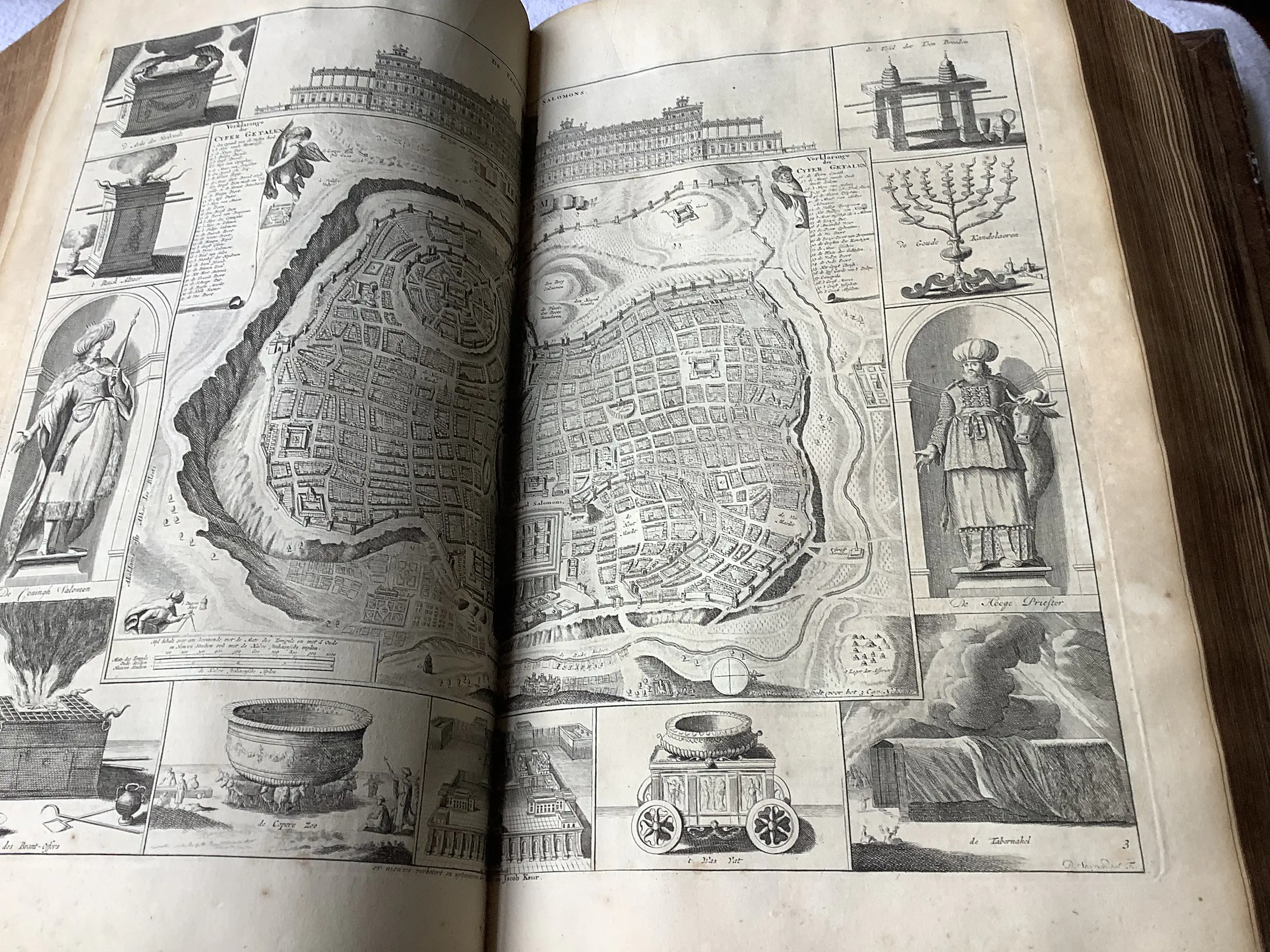 Statenbijbel uit 1729. Deze editie is prachtig gebonden in varkensleer, voorzien van authentieke koperen hoekstukken en sloten. De bijbel werd uitgegeven door de gerenommeerde drukkers Pieter en Jacob Keur en is volledig intact en in goede staat bewaard gebleven. Deze uitgave is voorzien van de originele kaarten waaronder een fraaie wereldkaart en naast andere kaarten ook een kaart van Jeruzalem met een beschrijving ervan. Dit is een waardevolle en prachtig bewaarde Staenbijbel uit 1729.