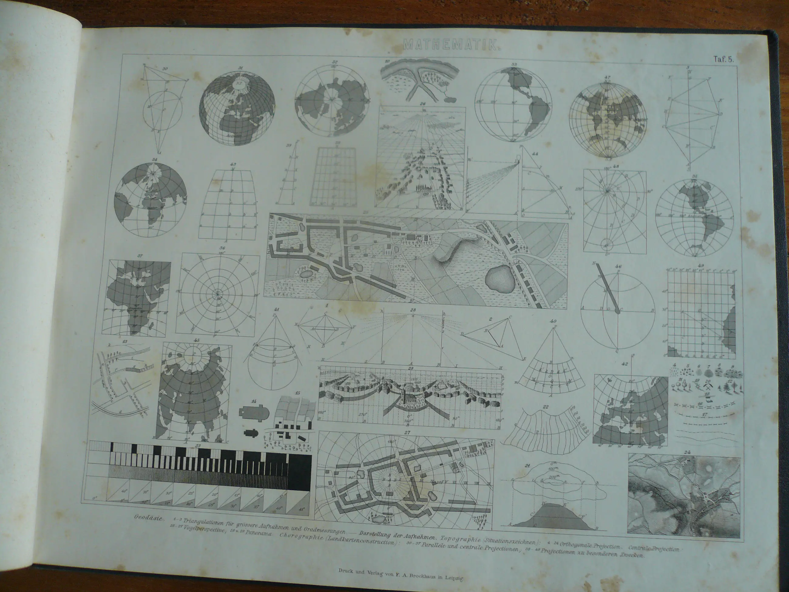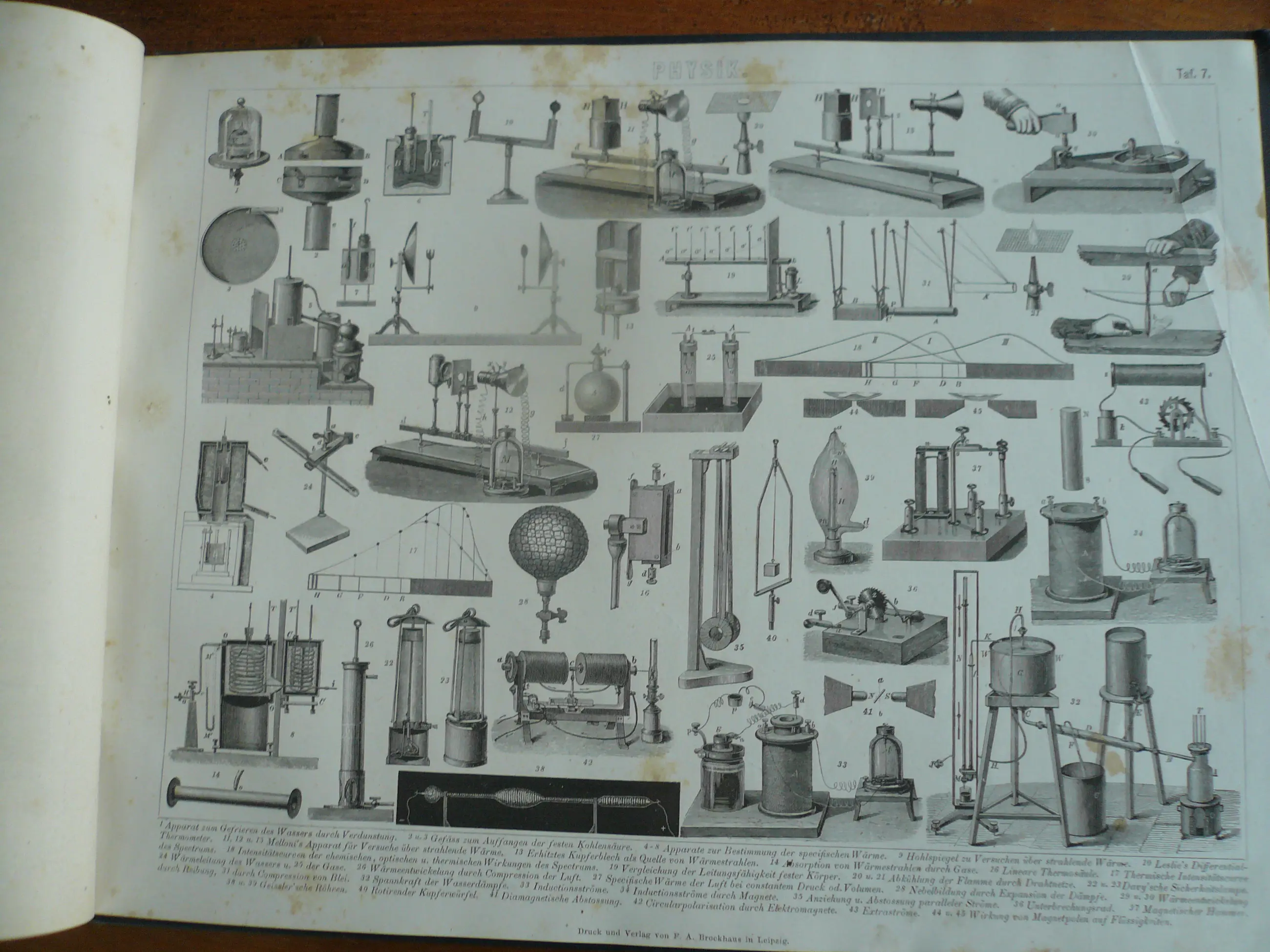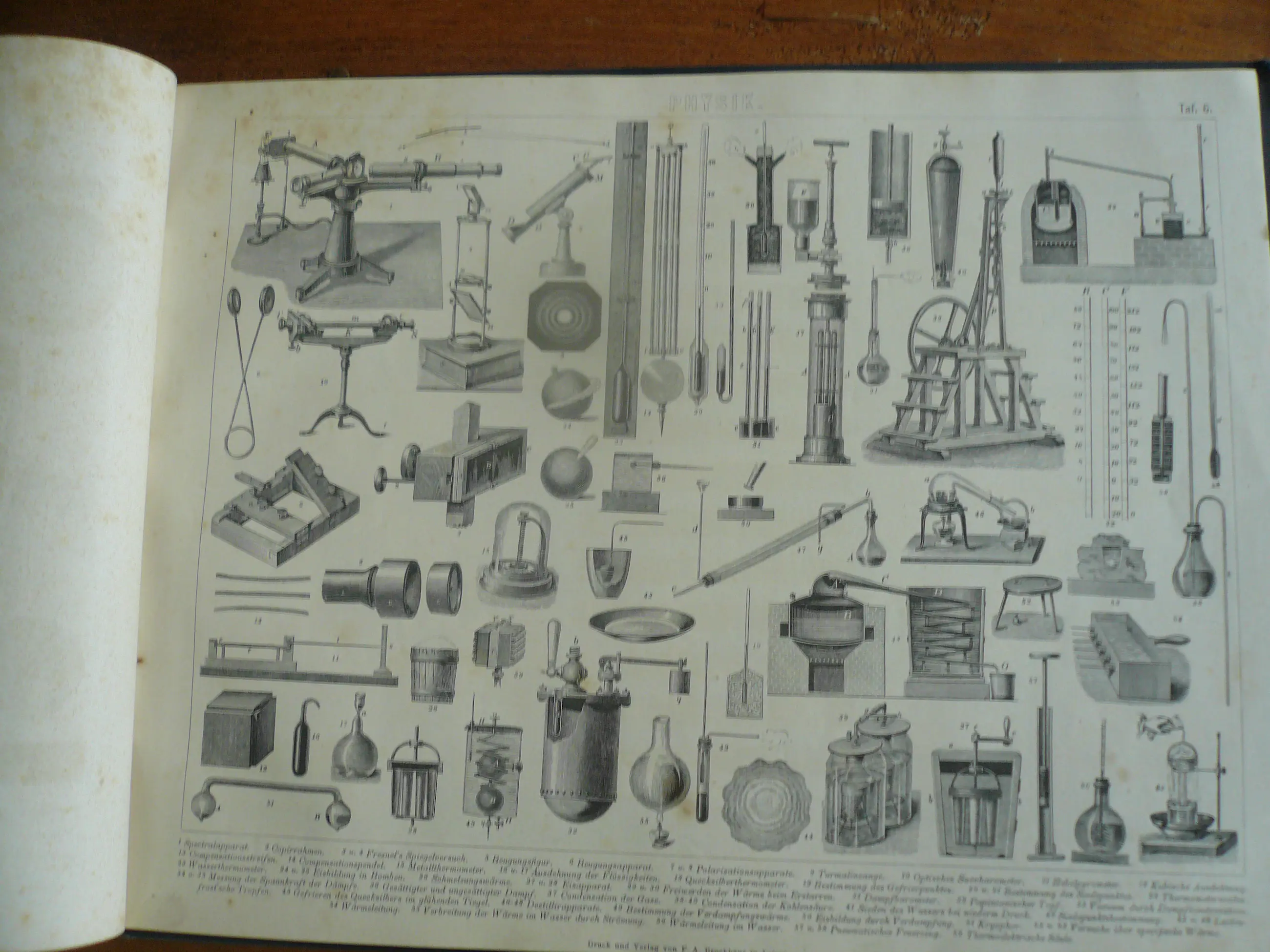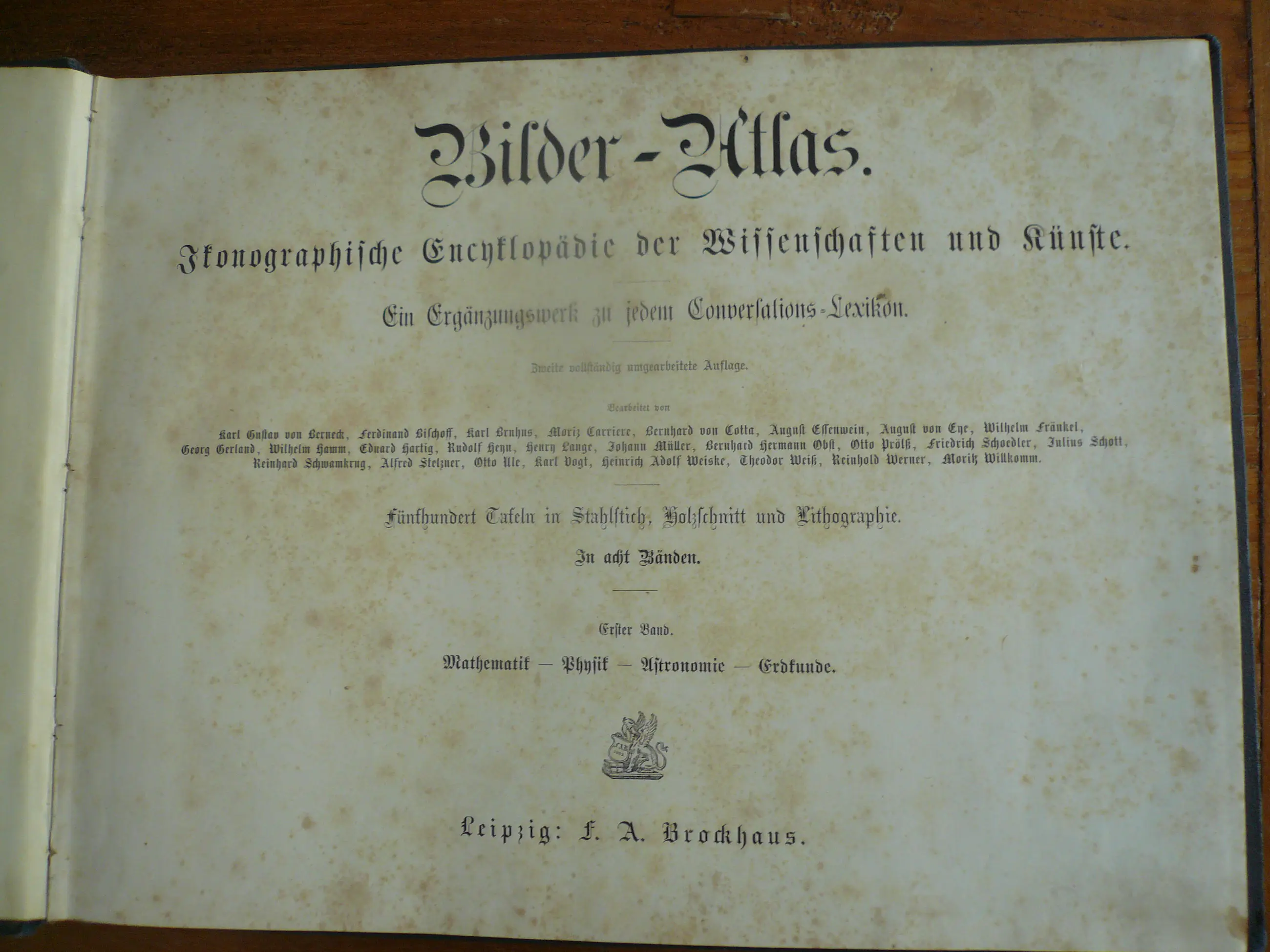 Bilder-Atlas Iconographische Encyclopädie der Wissenschaften und Künste . Erster Band Mathematik, Physik Erdkunden. totaal 42 platen met Staalgravures, houtsnedes en litho's. Uitgave Brockhaus. Met verklarende tekst. Hier en daar wat roestvlekje, maar compleet en goed in de band