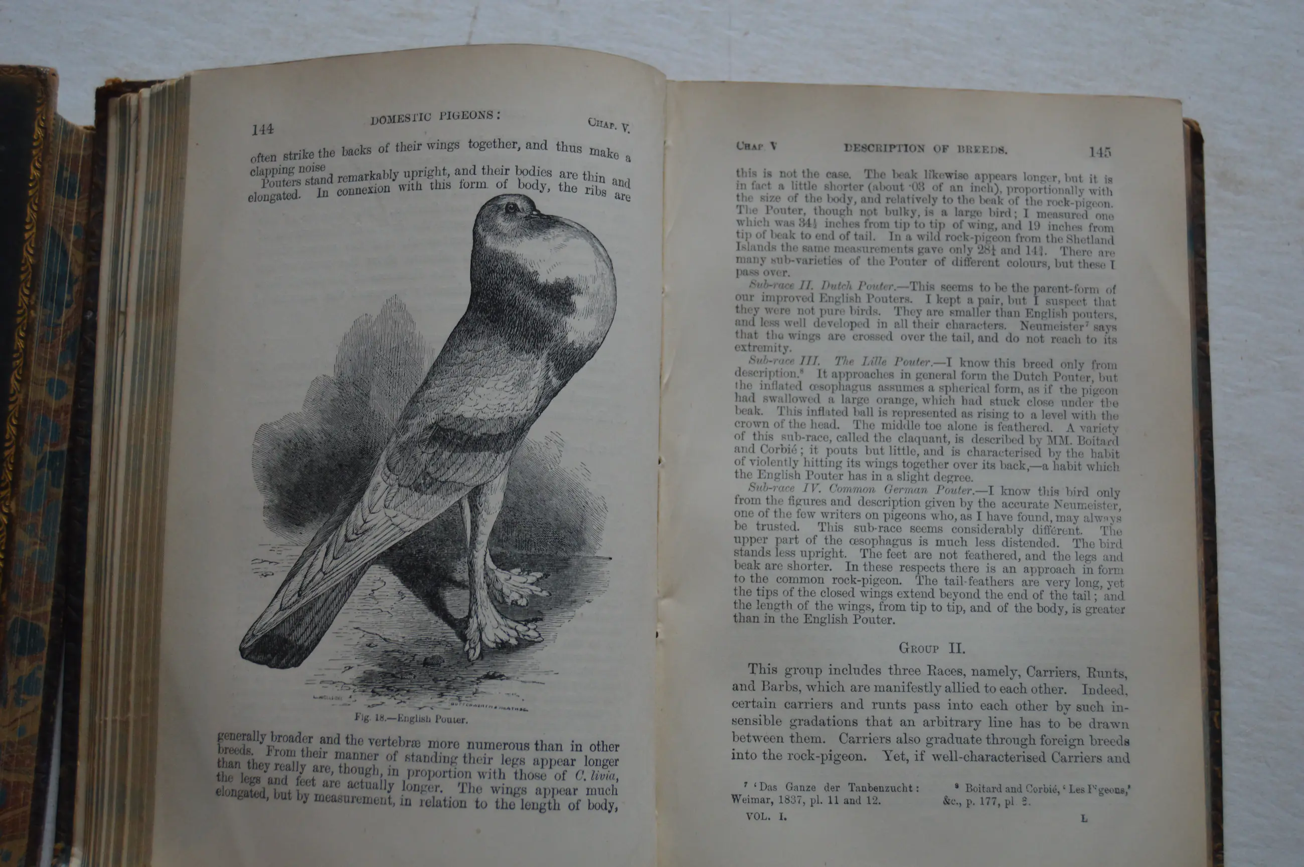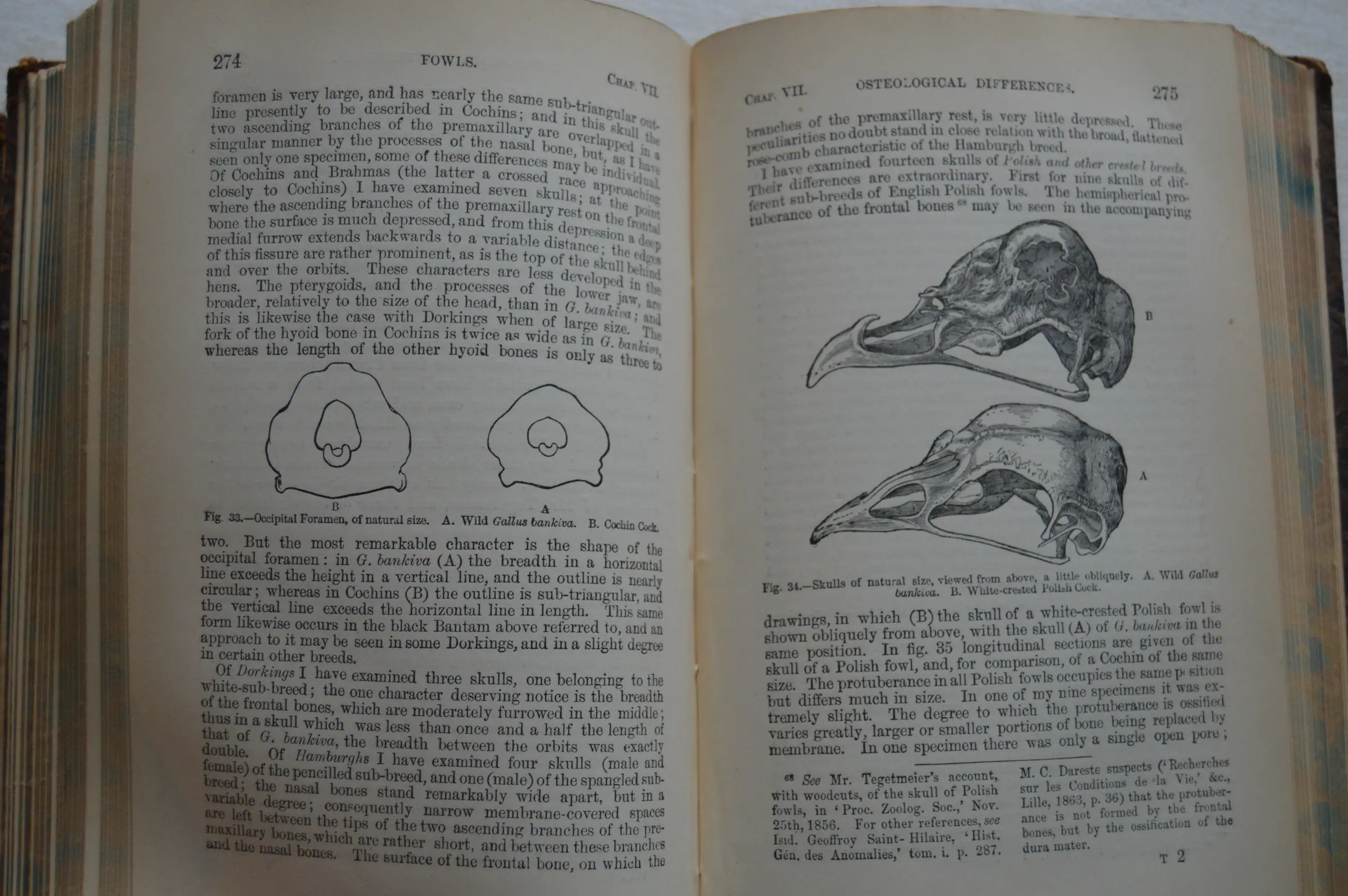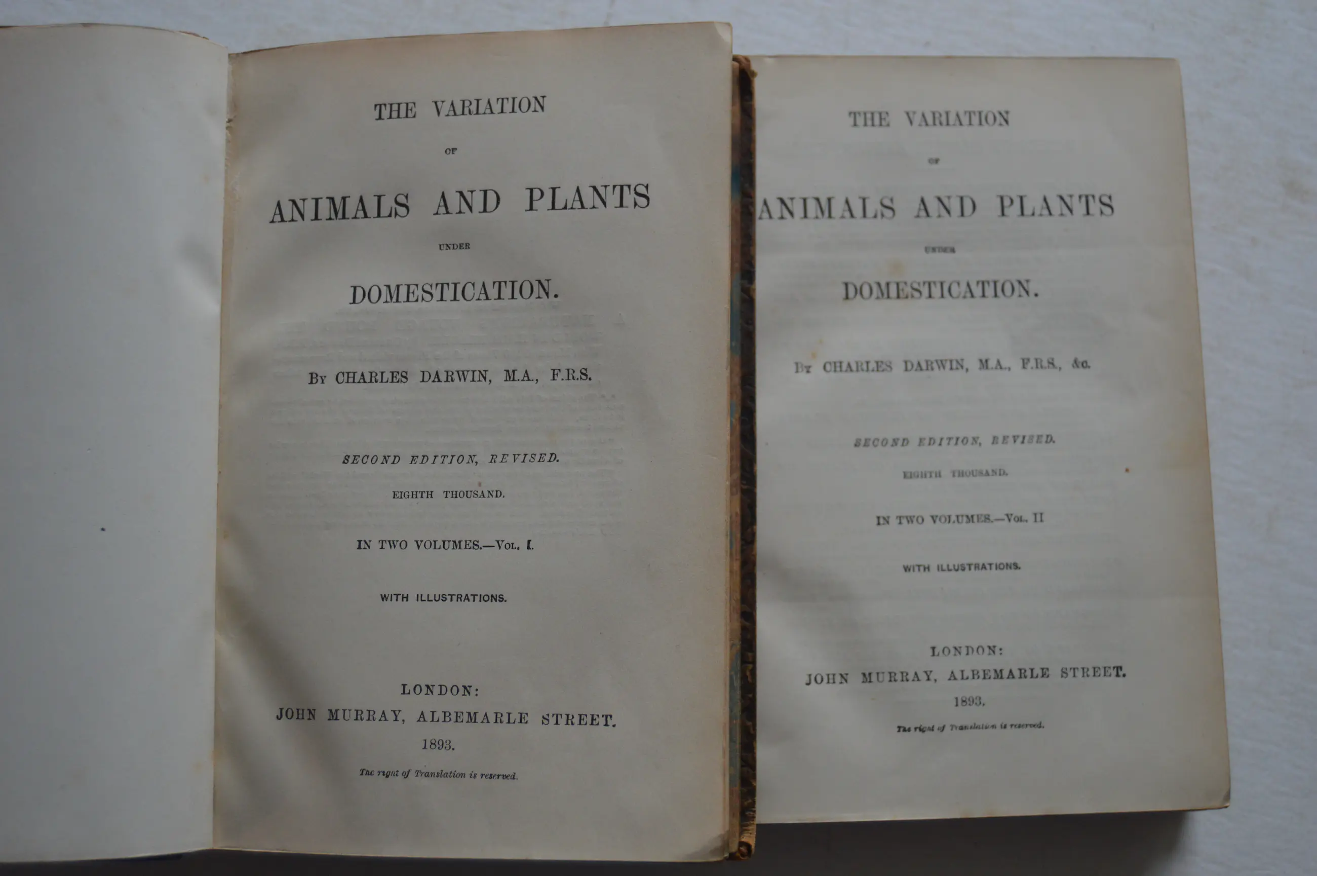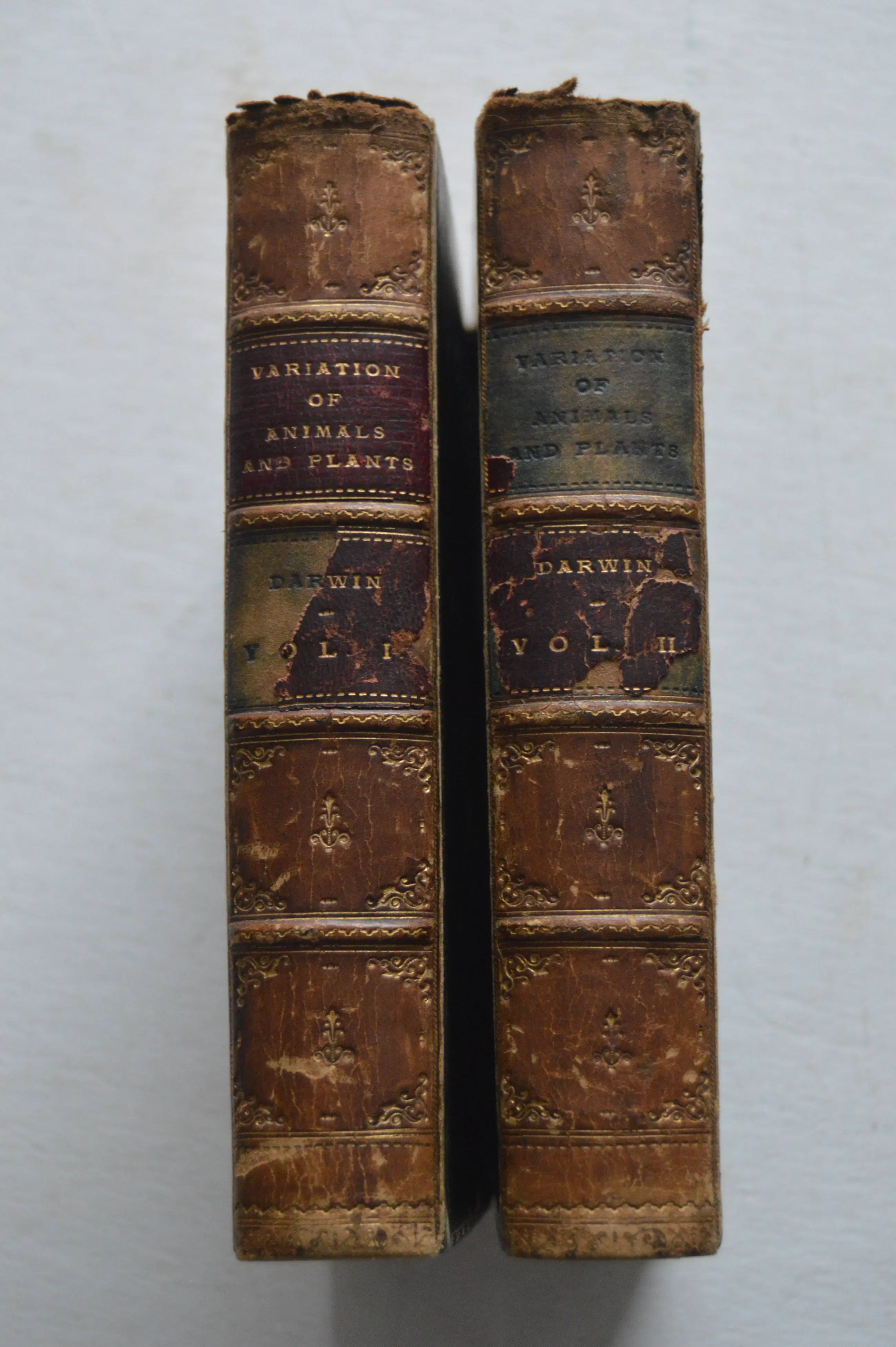 The variation of animals and plants. In 2 delen compleet! Door Charles Darwin. 2de editie, uitgegeven in 1893. Uitgever; John Murray, London. Oplage wereldwijd 8000 exemplaren. Met illustraties in de tekst. Fraaie gemarmerde schutbleden. Goudgestempelde banden. Stukje op de rug is er af doch tekst goed leesbaar!