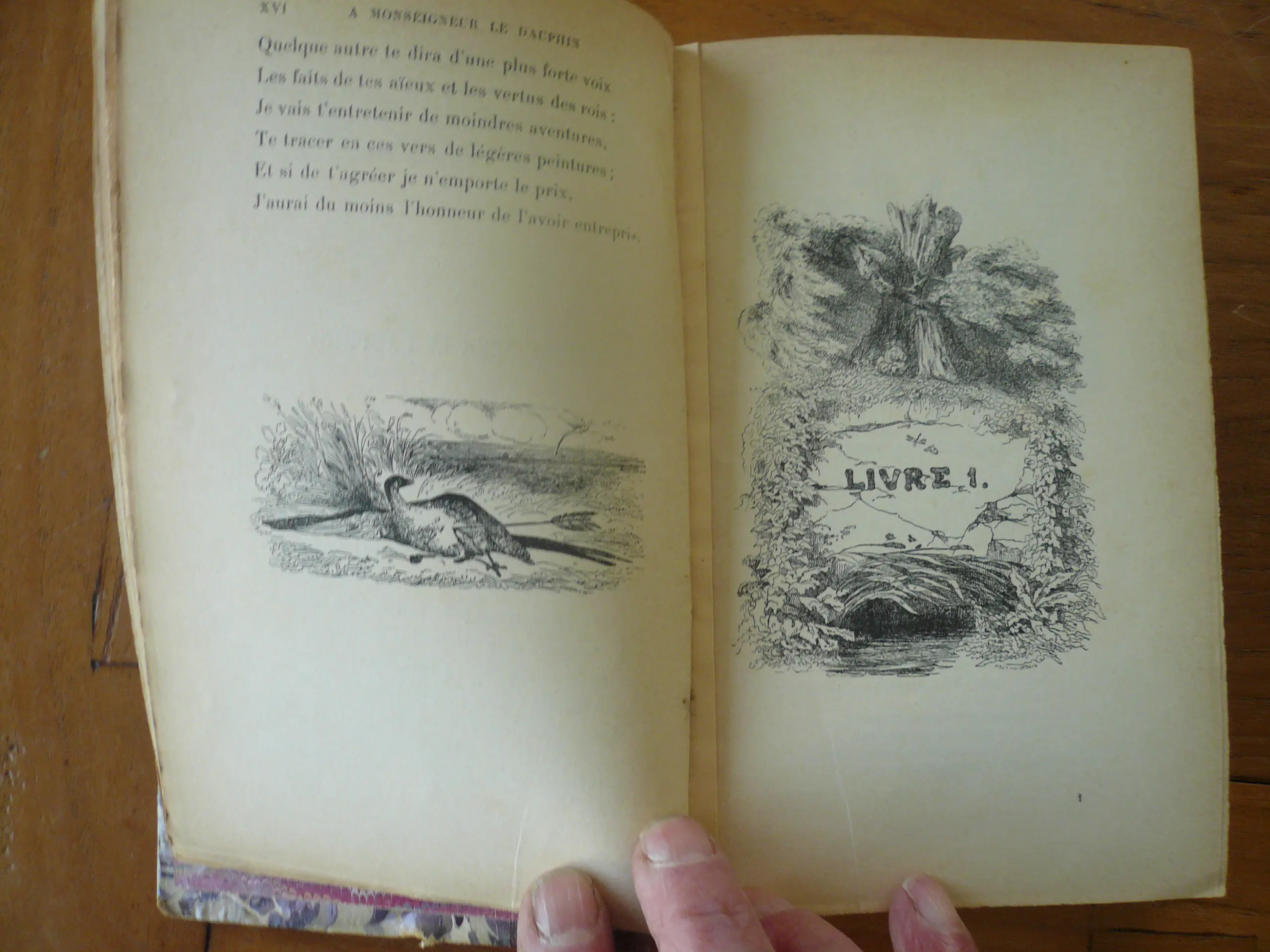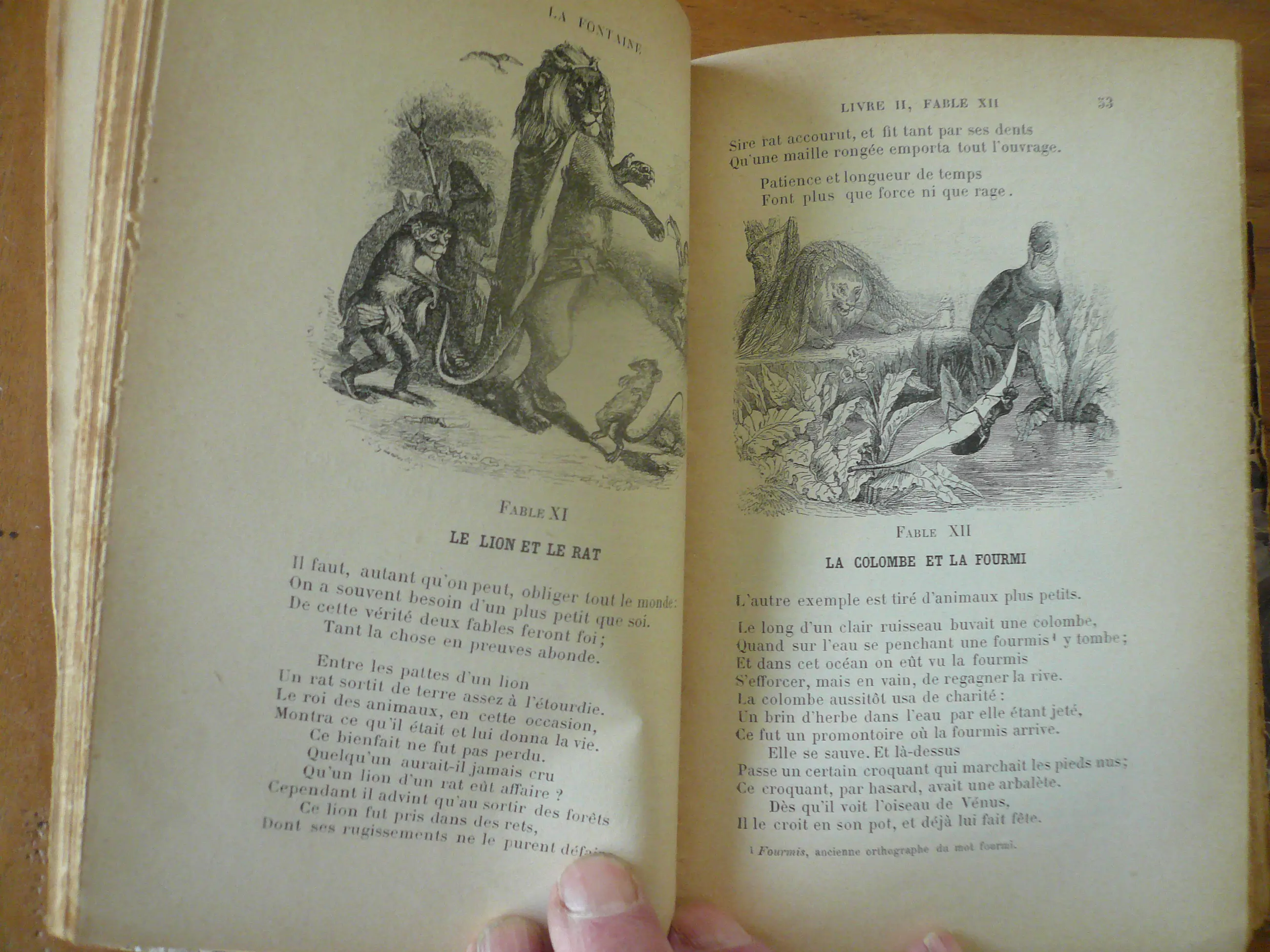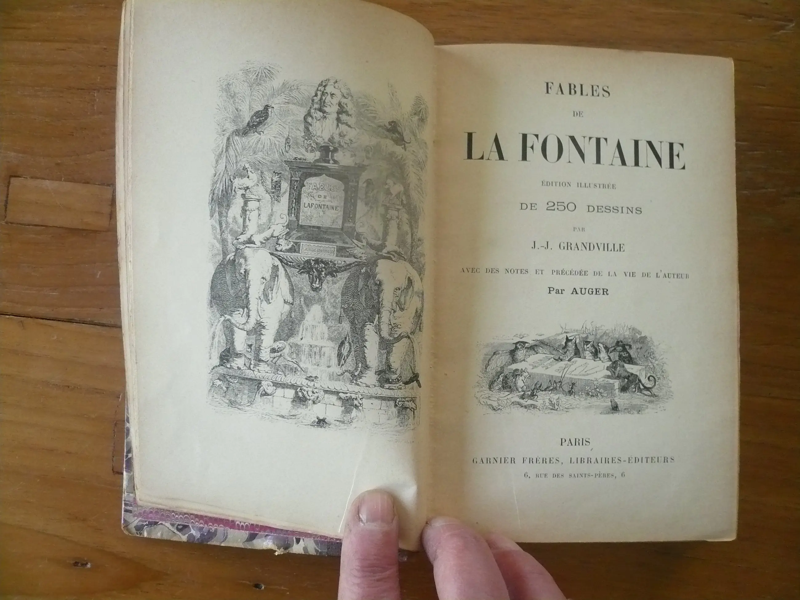 Fables de La Fontaine; 250 gravures de J.J. Grandville; 12 boeken in één band. Twee pagina's beschadigd één met tape gerepareerd. Tape binnenzijde free endpapers. rugstrip opnieuw bevestigd .Inhoud verder compleet een zeer goed