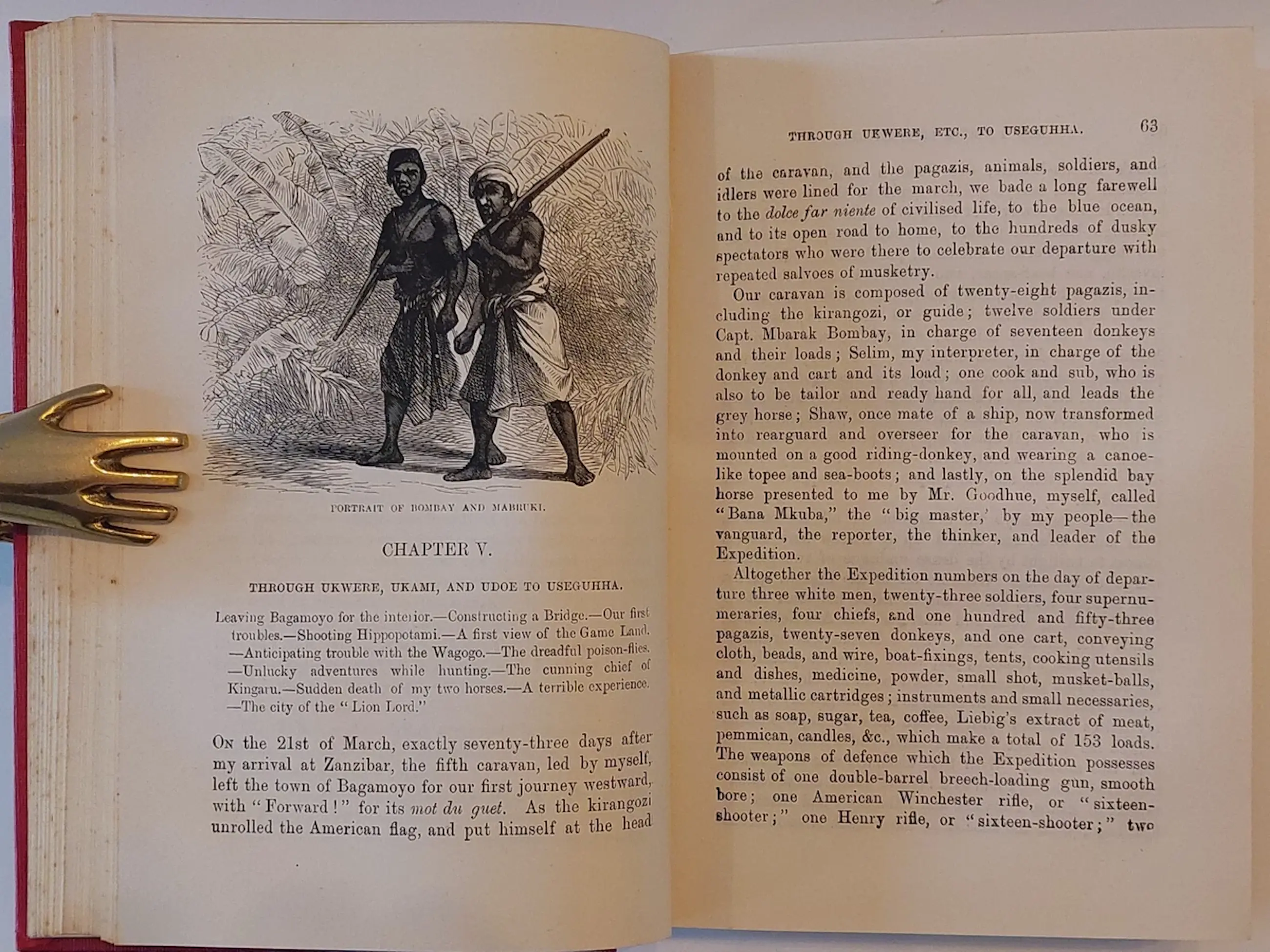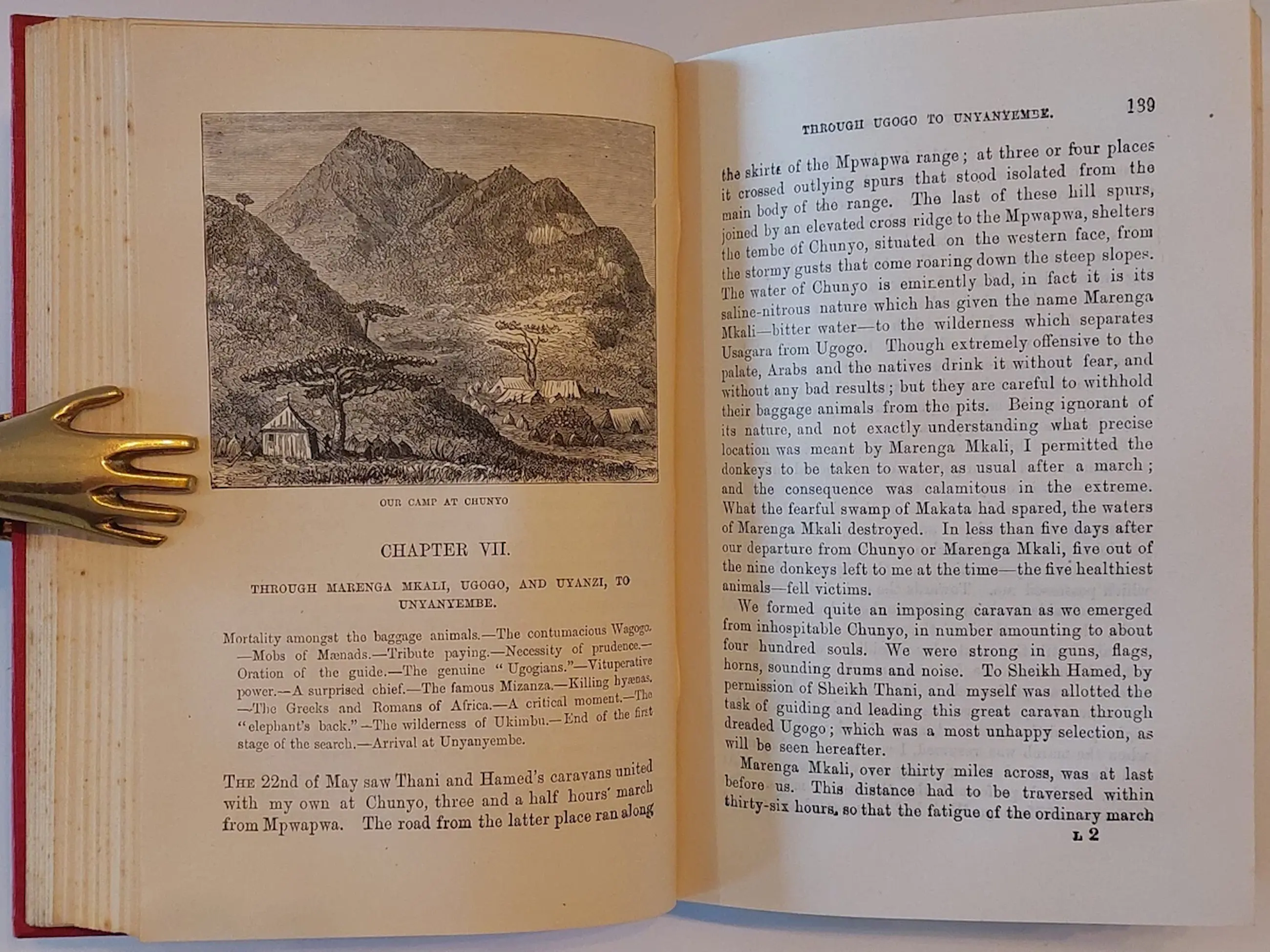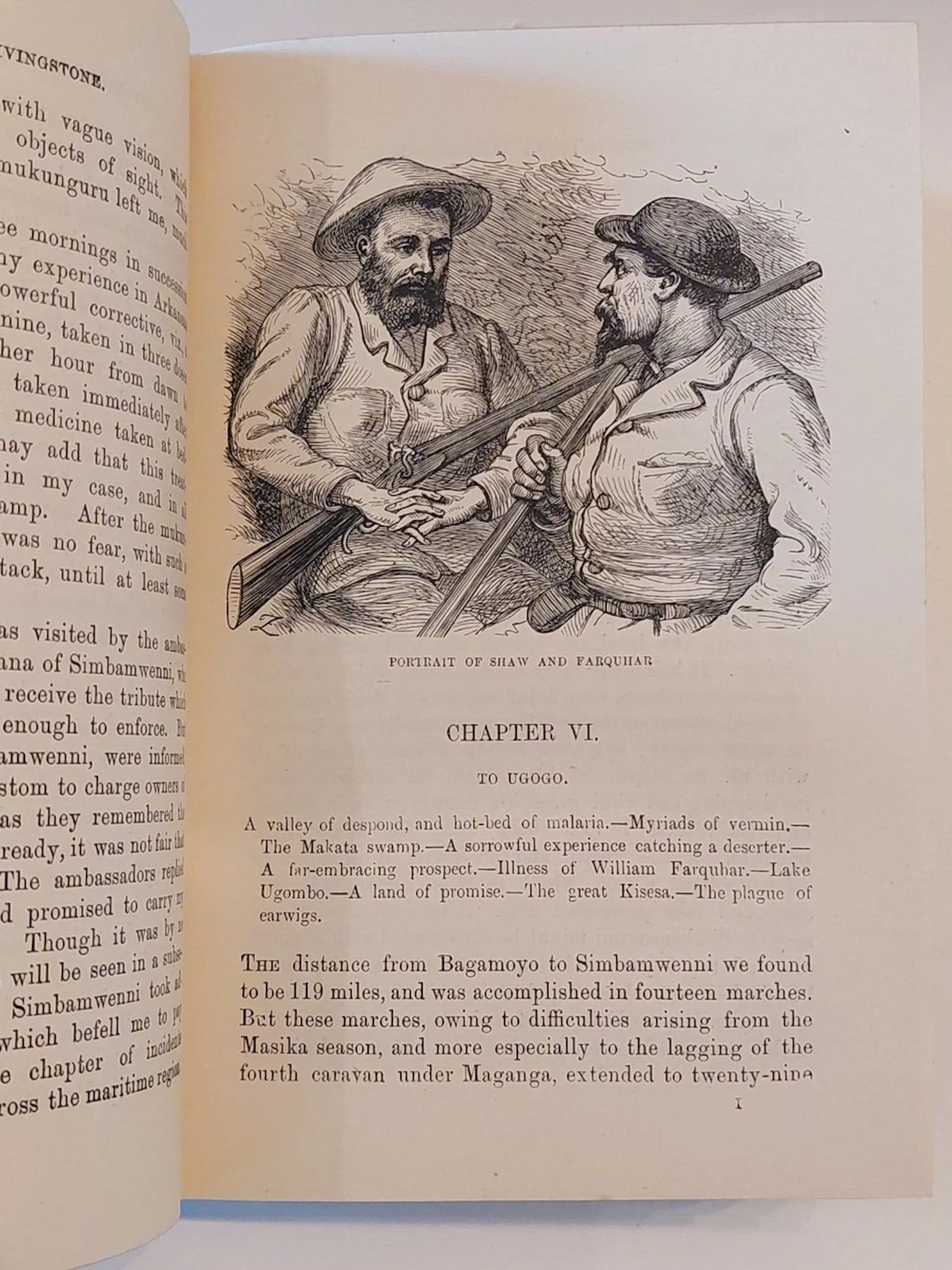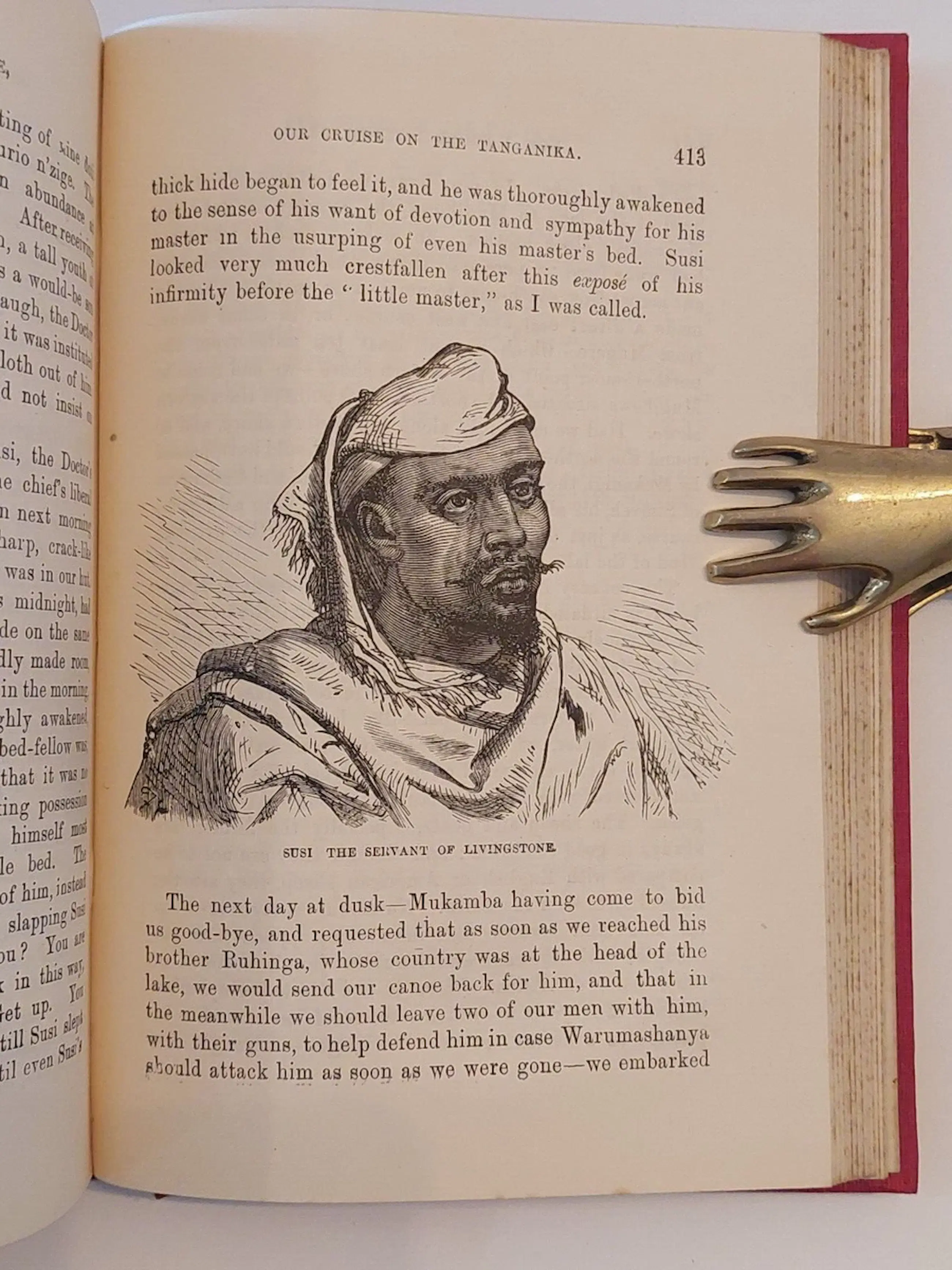 Folding map, 18 illustrations, index, glossary : this edition was thoroughly revised throughout and contains a Memoir of Dr. Livingstone. lxxix, 552 pages, 19 cm x 13,5 cm. Red decorated hardboards, with gilt titles to spine, and a gilt embossed framed illustration of an Africa scene to frontboard. Gilt top page edges. Hinges are sound. Slight tanning to endpapers, previous owner's pencil inscription to ffep. Clean text-pages, binding tight. And the book is in overall very good condition.