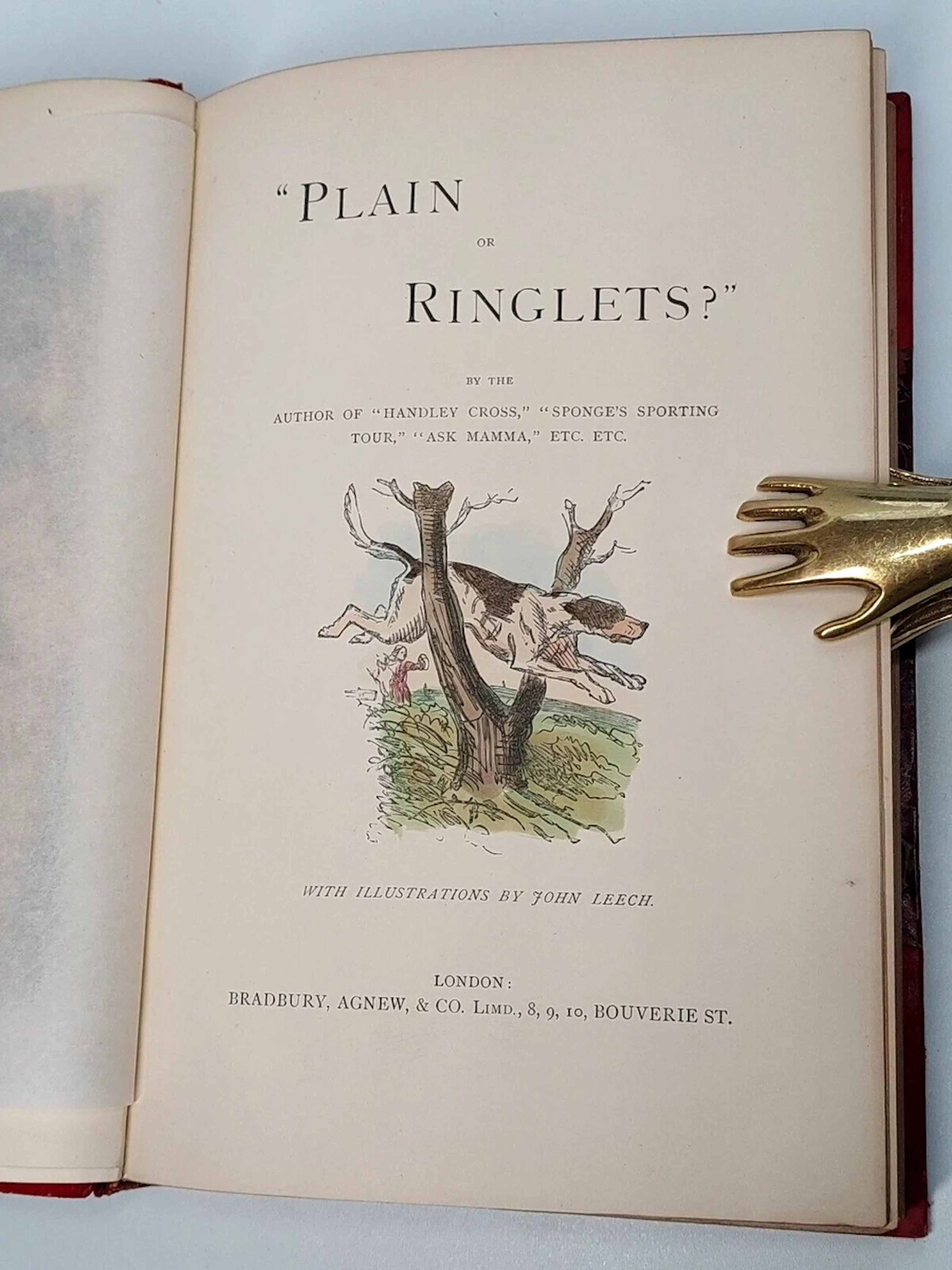 HANDLEY CROSS; or Mr. Jorrocks's Hunt, Leech illustrations, 17 coloured, ix plus 550 pages; HAWBUCK GRANGE or the Sporting Adventures of Thomas Scott, Esq.; Browne and Maud illustrations, 9 coloured, xii unpaginated plus 265 pages; MR. SPONGE'S SPORTING TOUR, Leech illustrations, 14 coloured, xi plus 408 pages; "ASK MAMMA" or The Richest Commoner in England, Leech illustrations, 14 coloured, xii plus 412 pages;" PLAIN OR RINGLETS?", Leech illustrations, 13 coloured, xi plus 406 pages; MR. ROMFORD'S HOUNDS, Leech and Browne illustrations, 25 coloured, xi plus 405 pages.