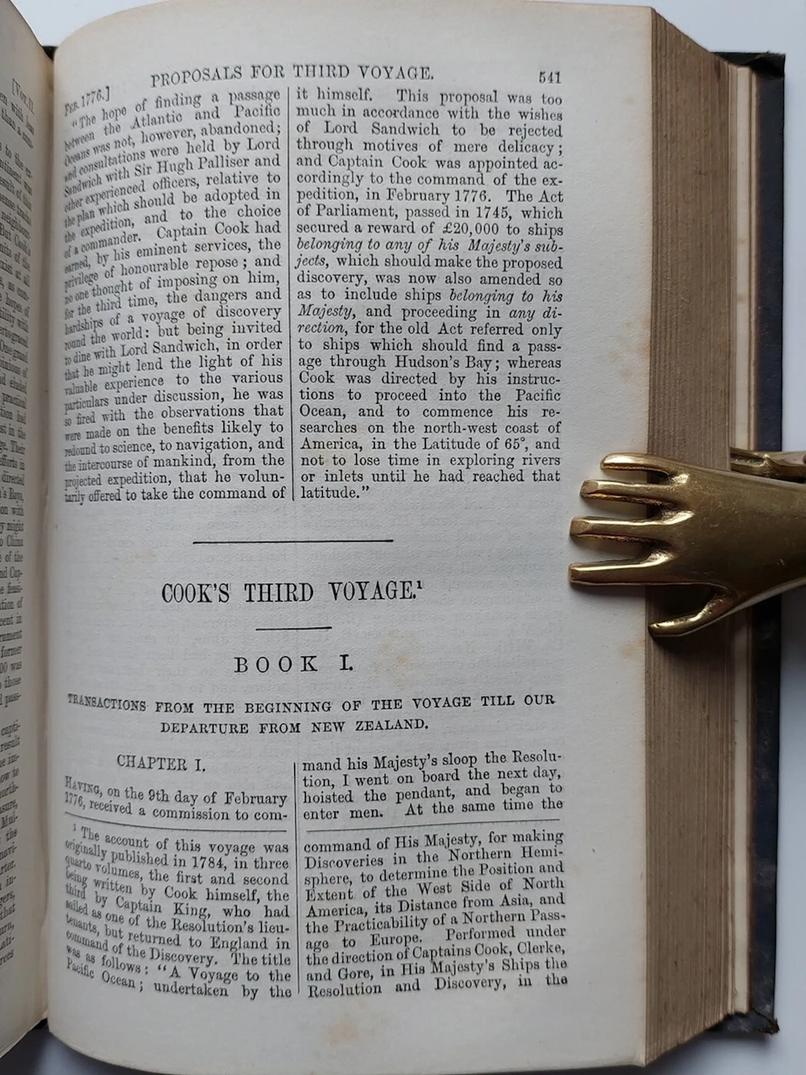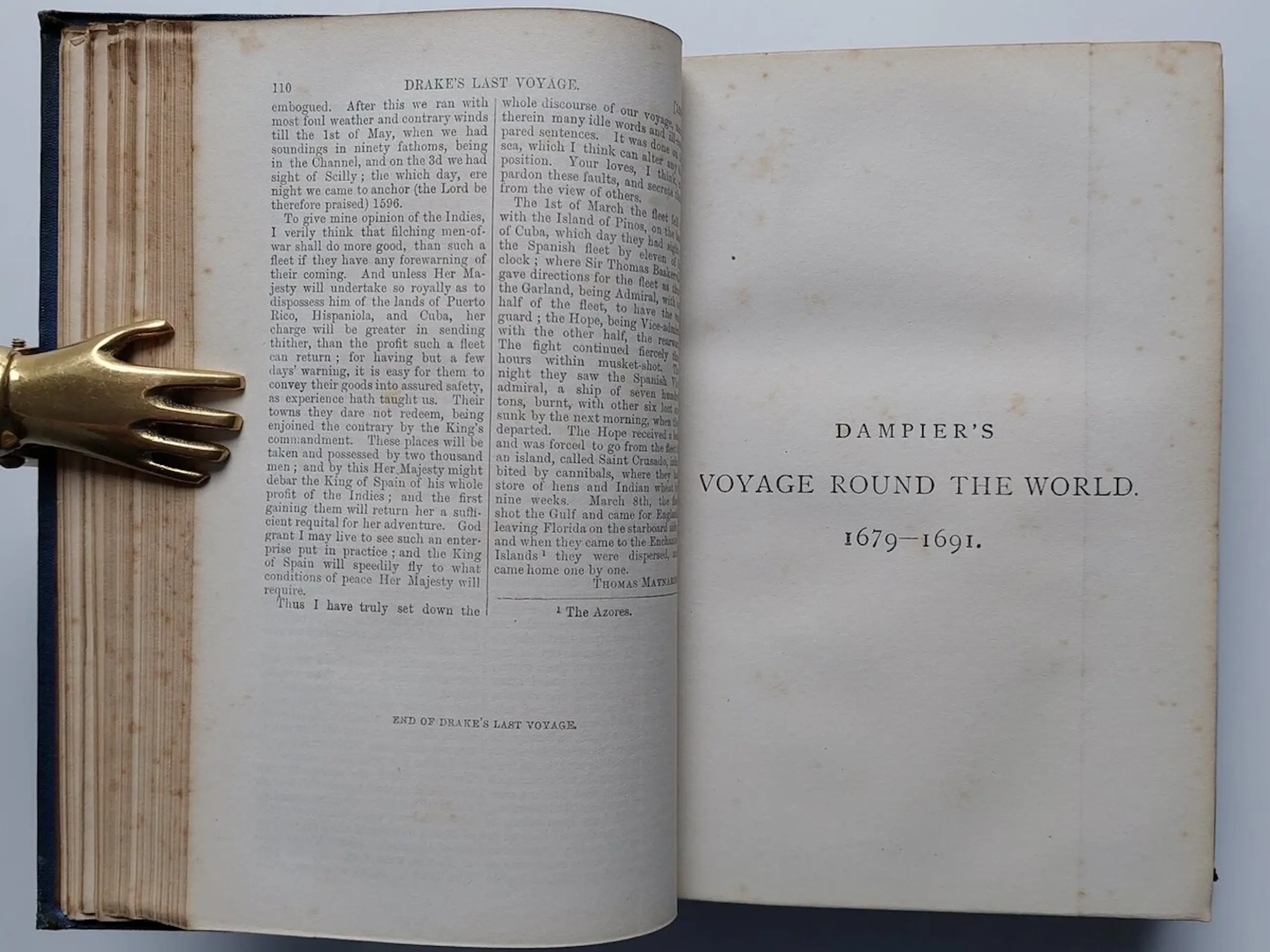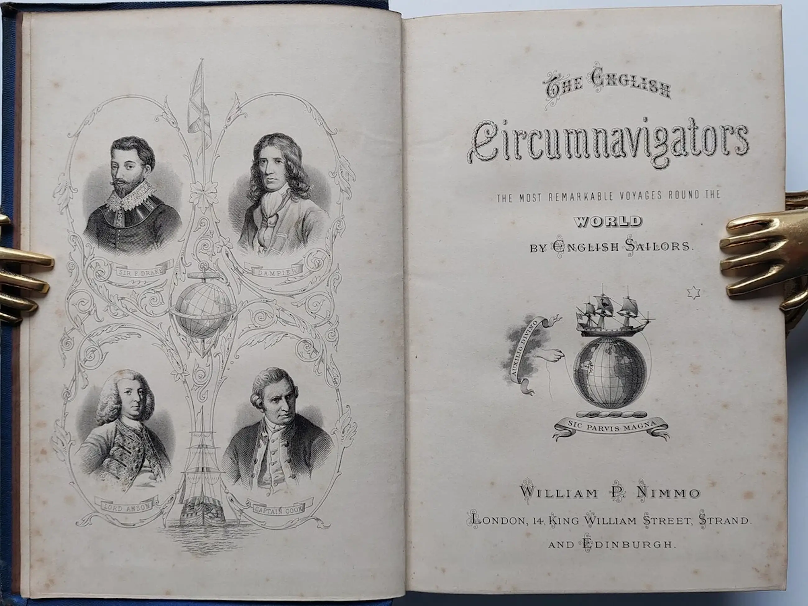I have here a RARE book for sale entitled The English Circumnavigators; the Most Remarkable Voyages Round the World By English Sailors with a Preliminary Sketch of Their Lives and Discoveries, Edited with Notes, Etc., Etc. - by David Laing Purves and R. Cochrane (editors). Published by William P. Nimmo, 1876. It's a First Edition. Frontispiece is portrait of the 4 navigators. Contents in 4 parts with coloured Map & copy of orig title page "The World Encompassed. Sir Francis Drake"; "A New Voyage Round The World. William Dampier"; "A Voyage Round The World. George Anson"; "Cook's Voyages Round The World." 4 folding coloured maps in very good condition, printed double column, a nice copy. 831 pages including index.