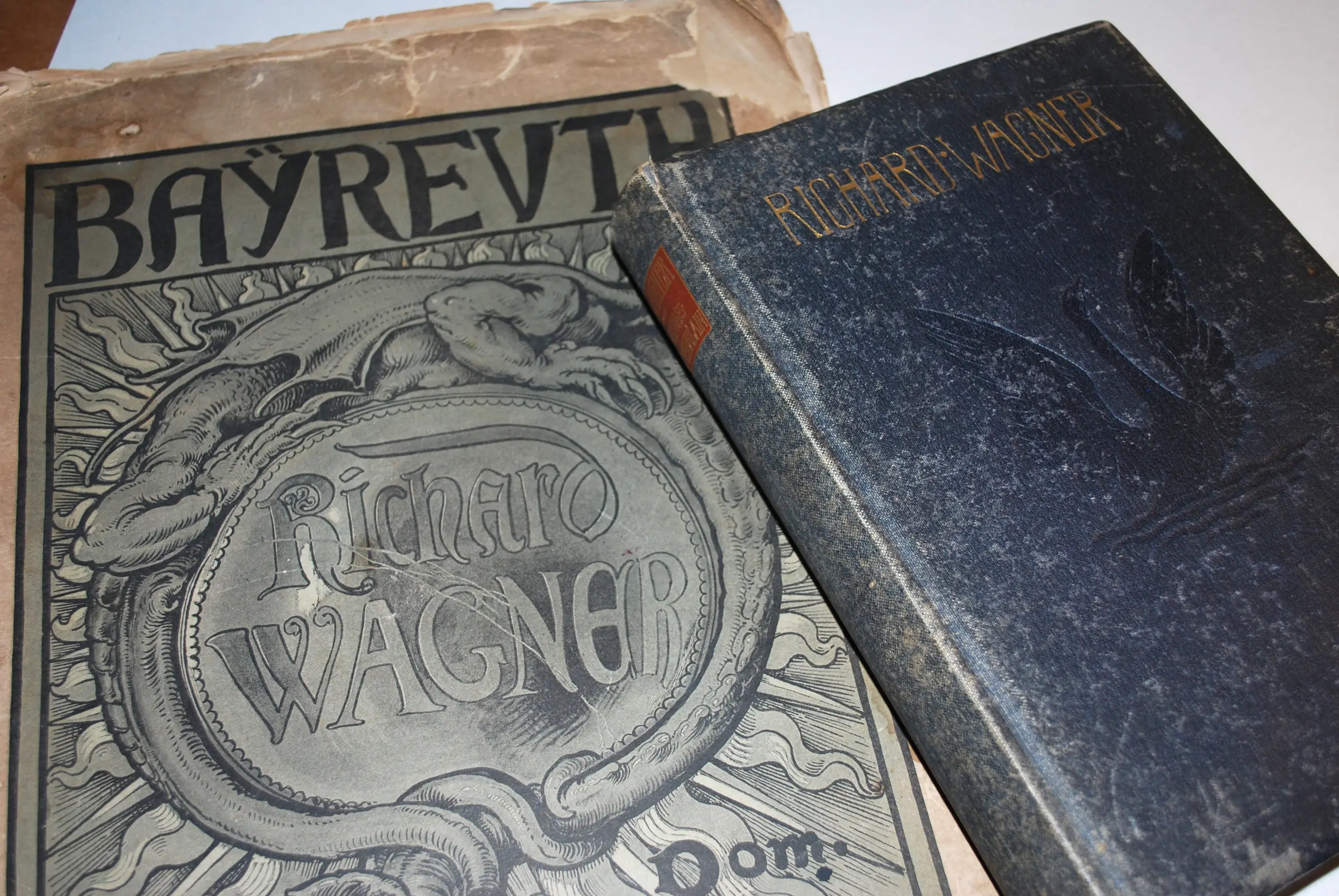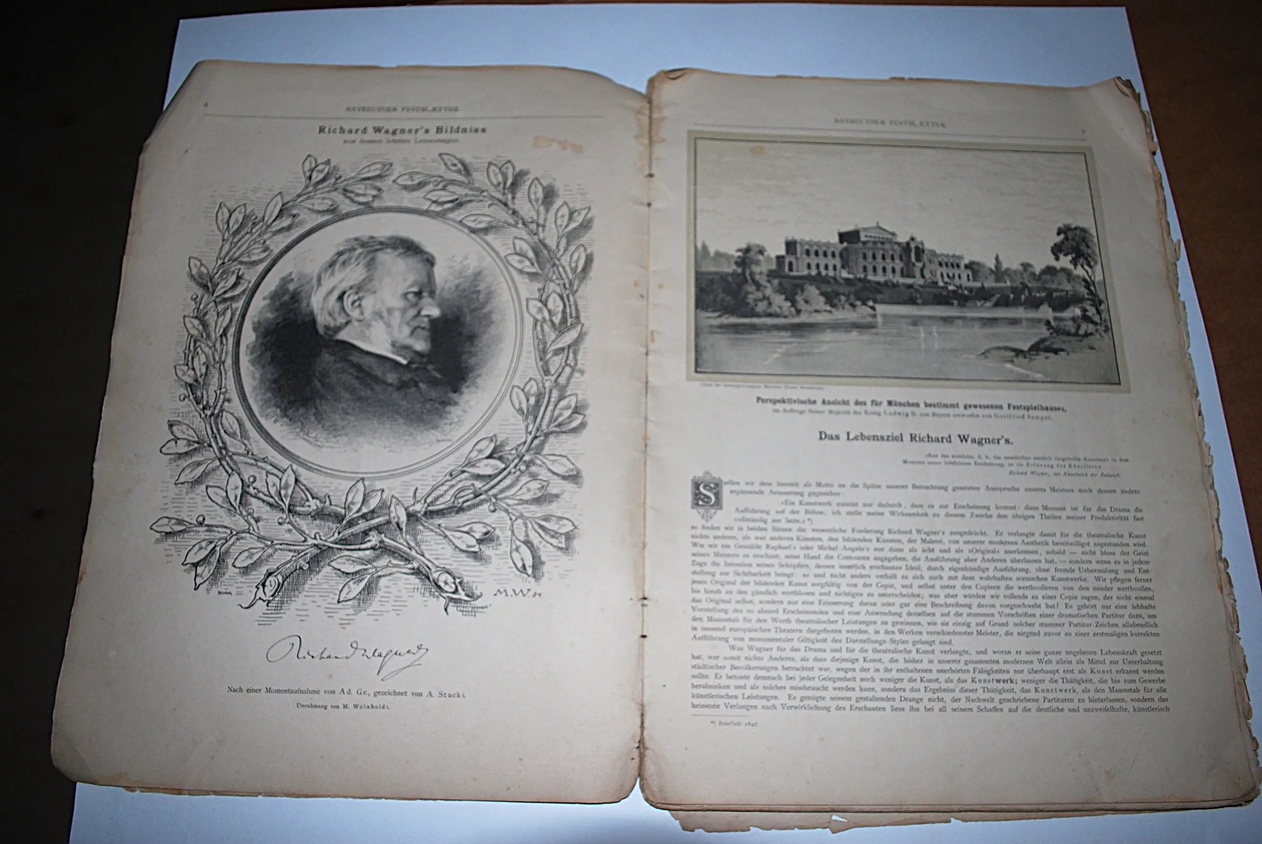 Omlag en randen zijn beschadigd/scheurtjes/vlekjes/pagina's zijn los. Monografie is compleet, kaft heeft schade, pagina met de gravure van Wagner zit los en de rand is gerafeld.