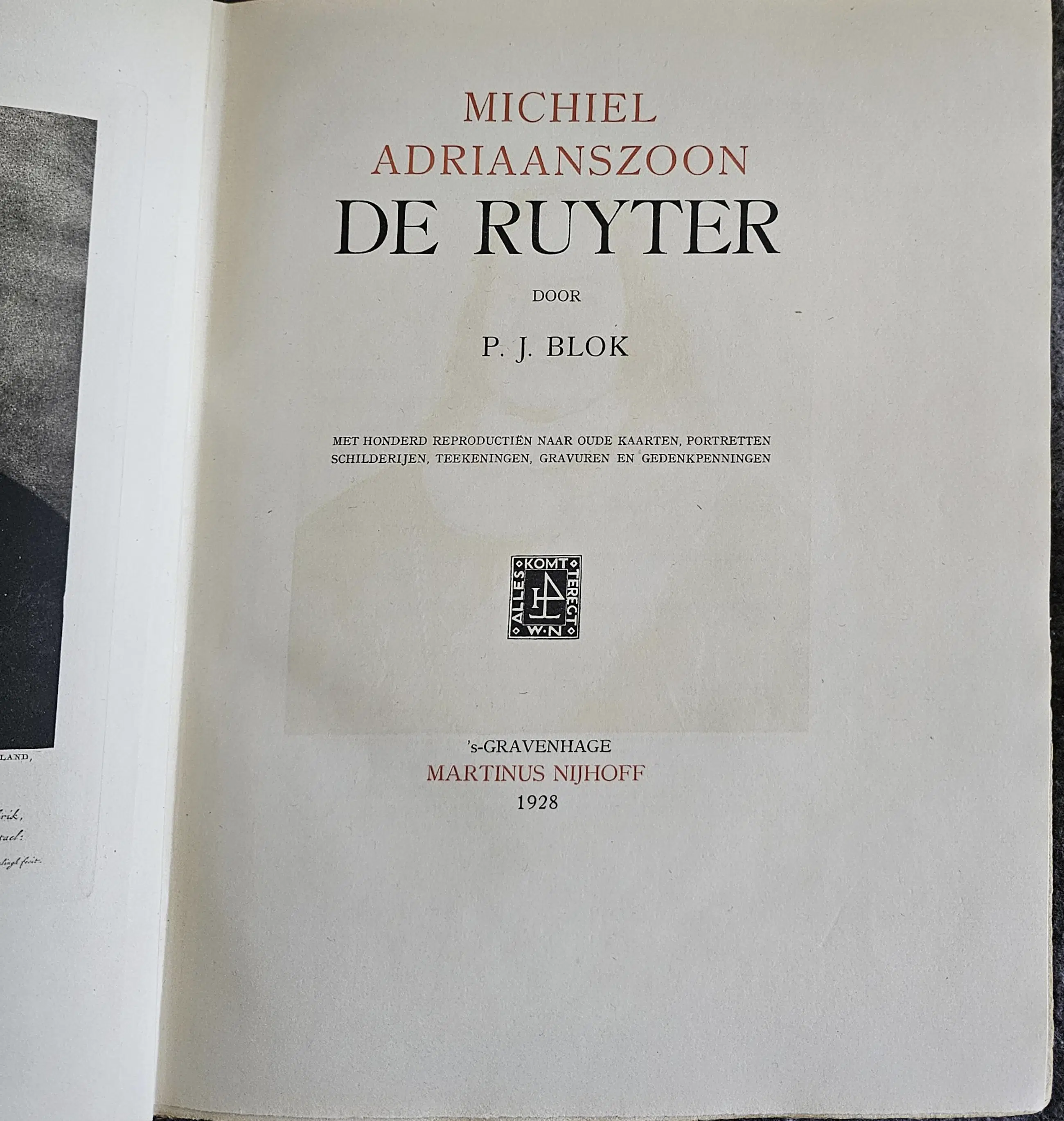 P.J. Blok - Michiel Adriaanszoon de Ruyter - Den Haag, Martinus Nijhoff, 1928 - 1e druk - Dik papier waarvan 454 tekst met meerdere afbeeldingen in de tekst + 104 afbeelding met 54 afbeeldingen - Blauw linnen hardcover met blinde goudopdruk op omslag en rug.