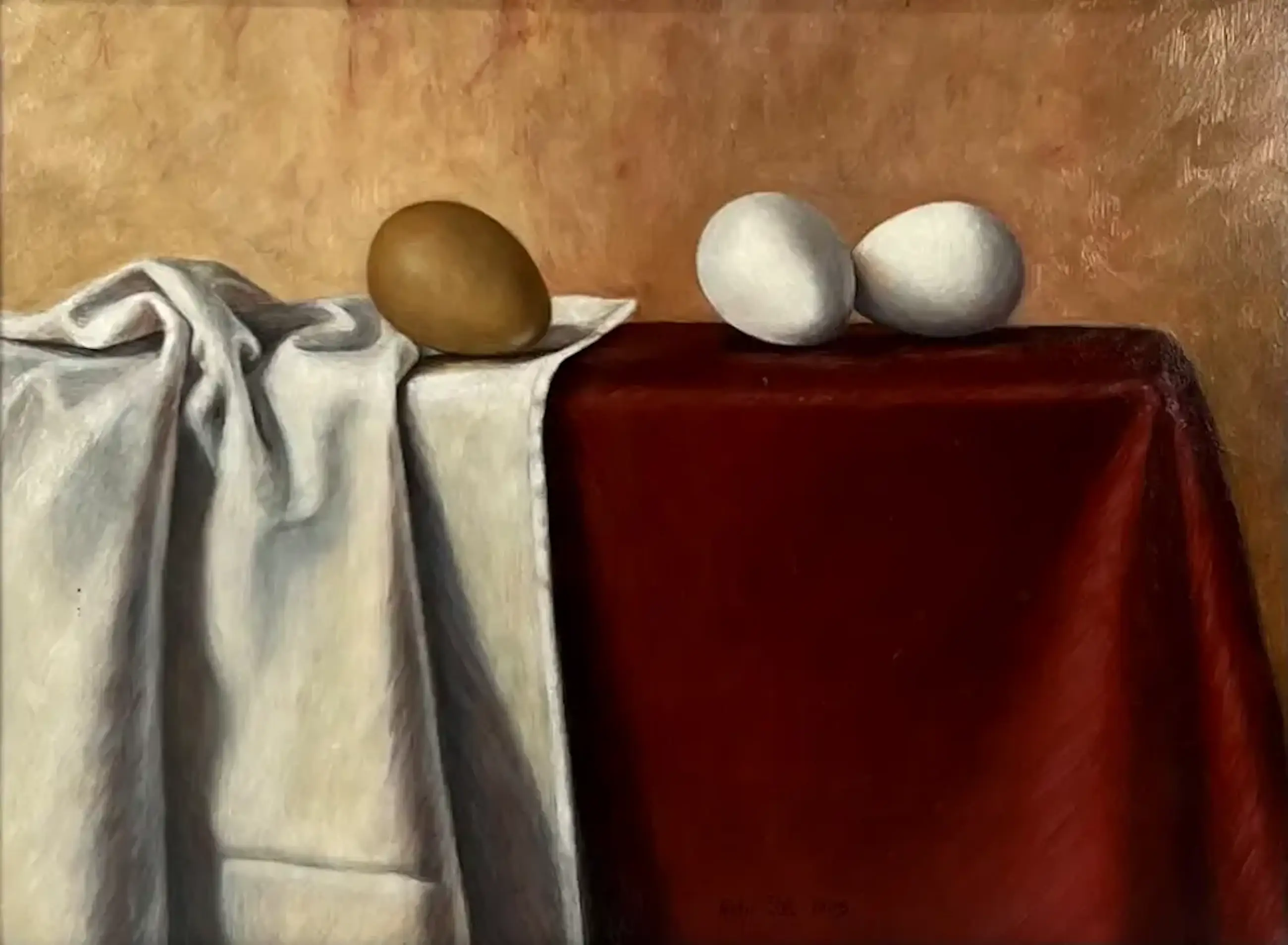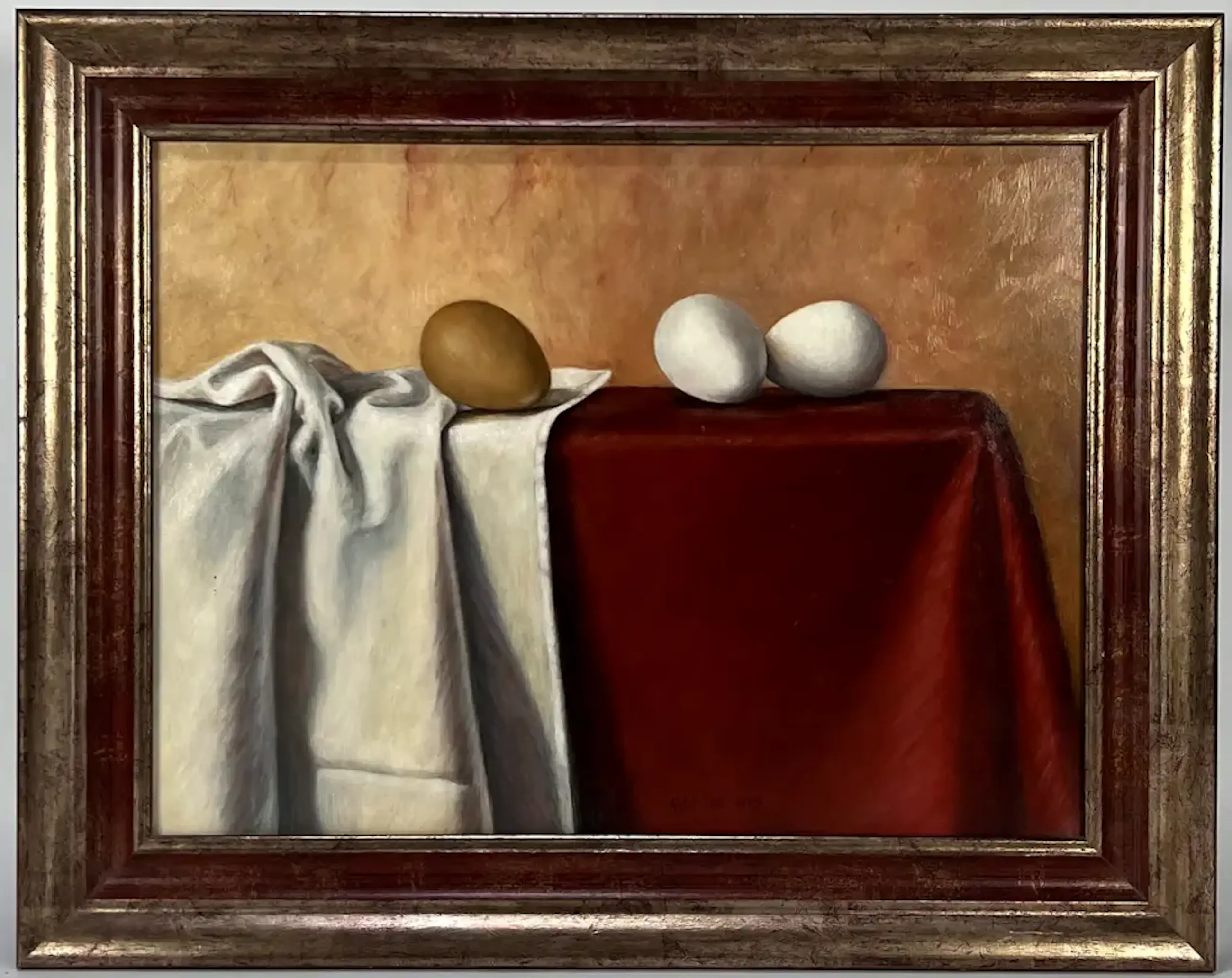 Olieverf op paneel van de Drentse kunstenares Antje Stel. Jaar: 2005. Voorstelling van een stilleven met eieren. Afmetingen incl lijst: H40 x b50cm. Afmetingen doek: H39 x b29cm. Het werk is, rechts onderaan, gesigneerd door de kunstenares. De authenticiteit van dit werk wordt volledig gegarandeerd. Een certificaat van echtheid kan, op aanvraag, worden gemaild.