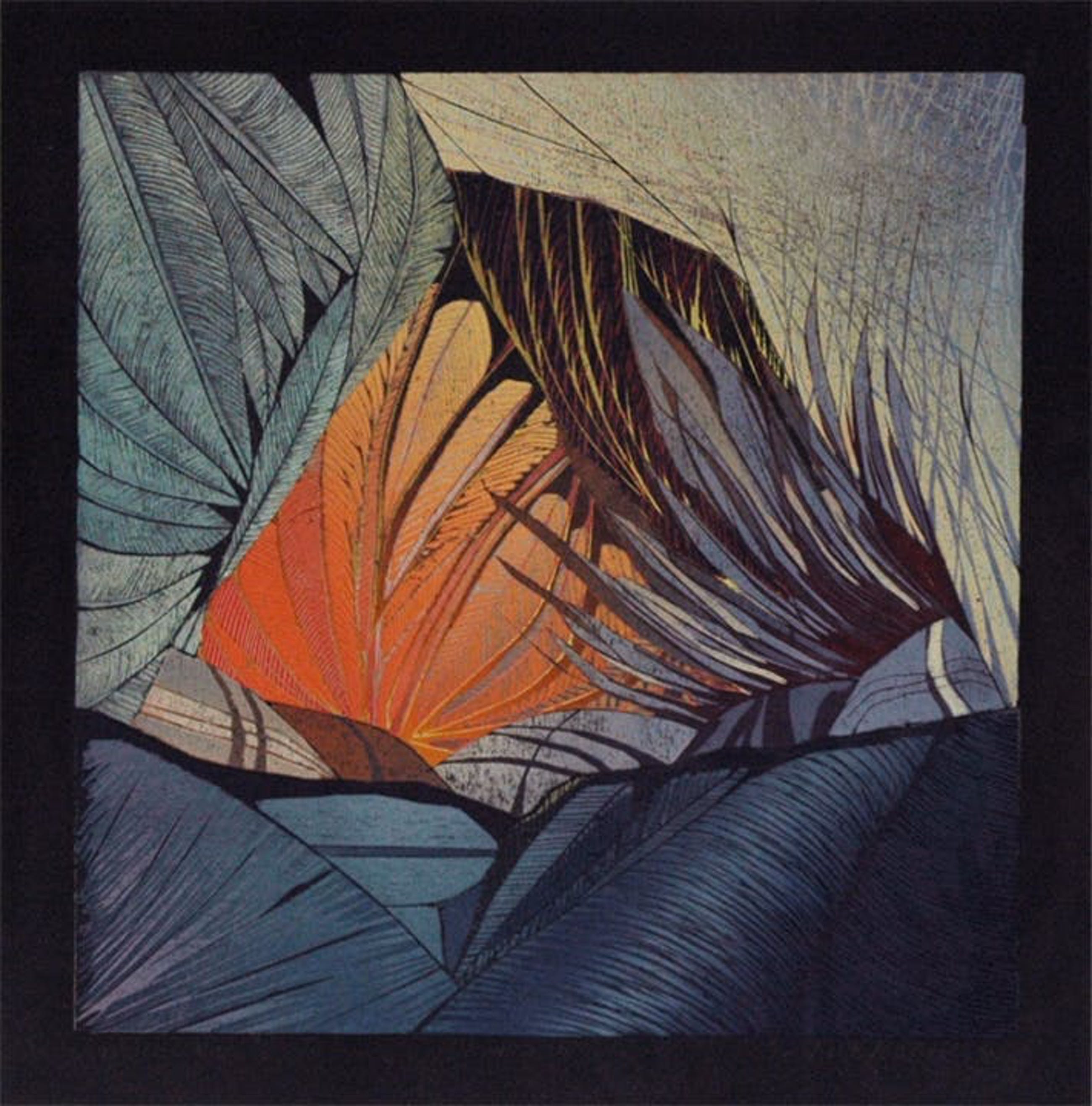Onderschrift werk (potlood op zwart papier dus moeilijk leesbaar): "Houtdruk 6/12 De Wachters Antje Veldstra".