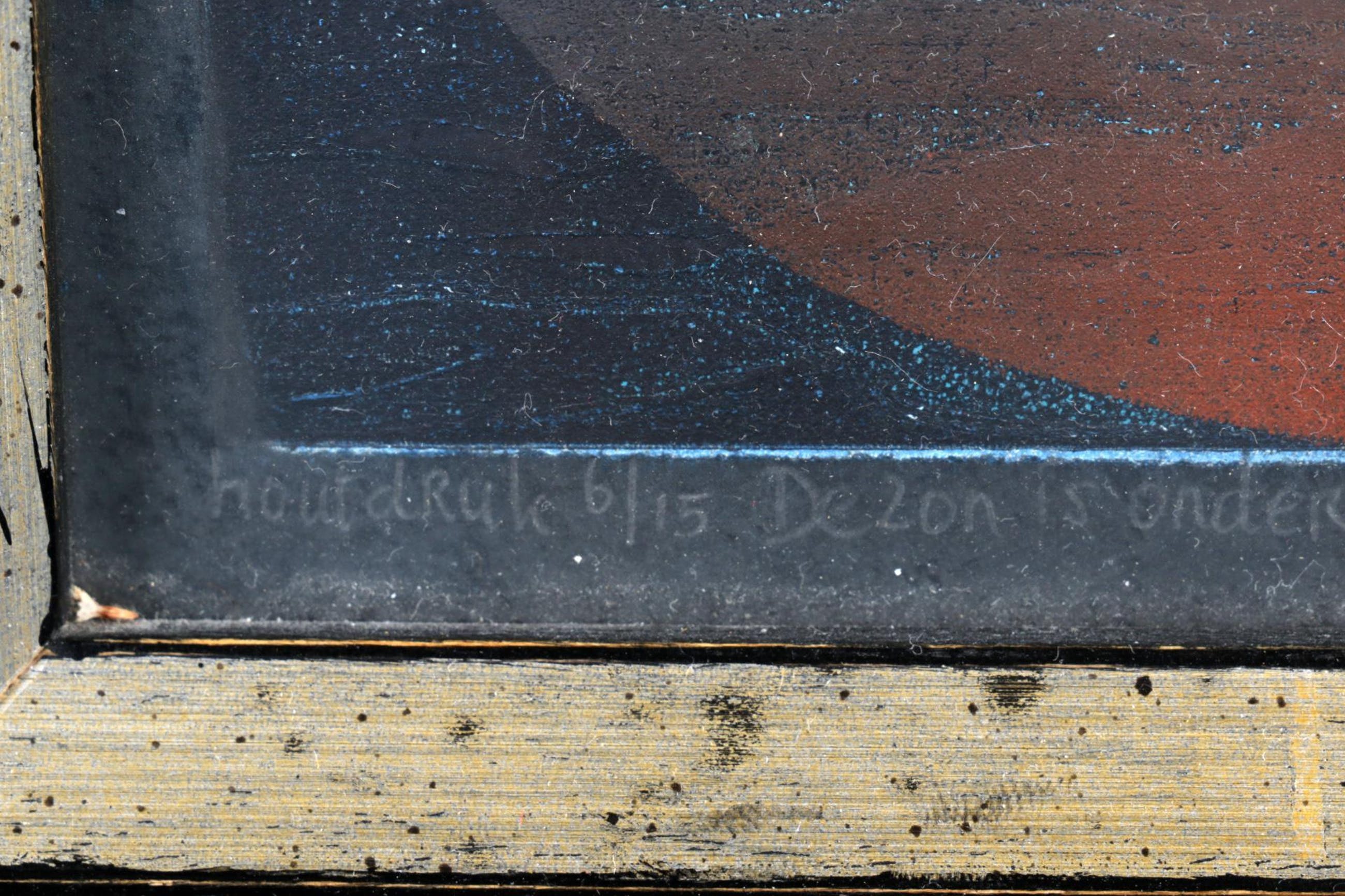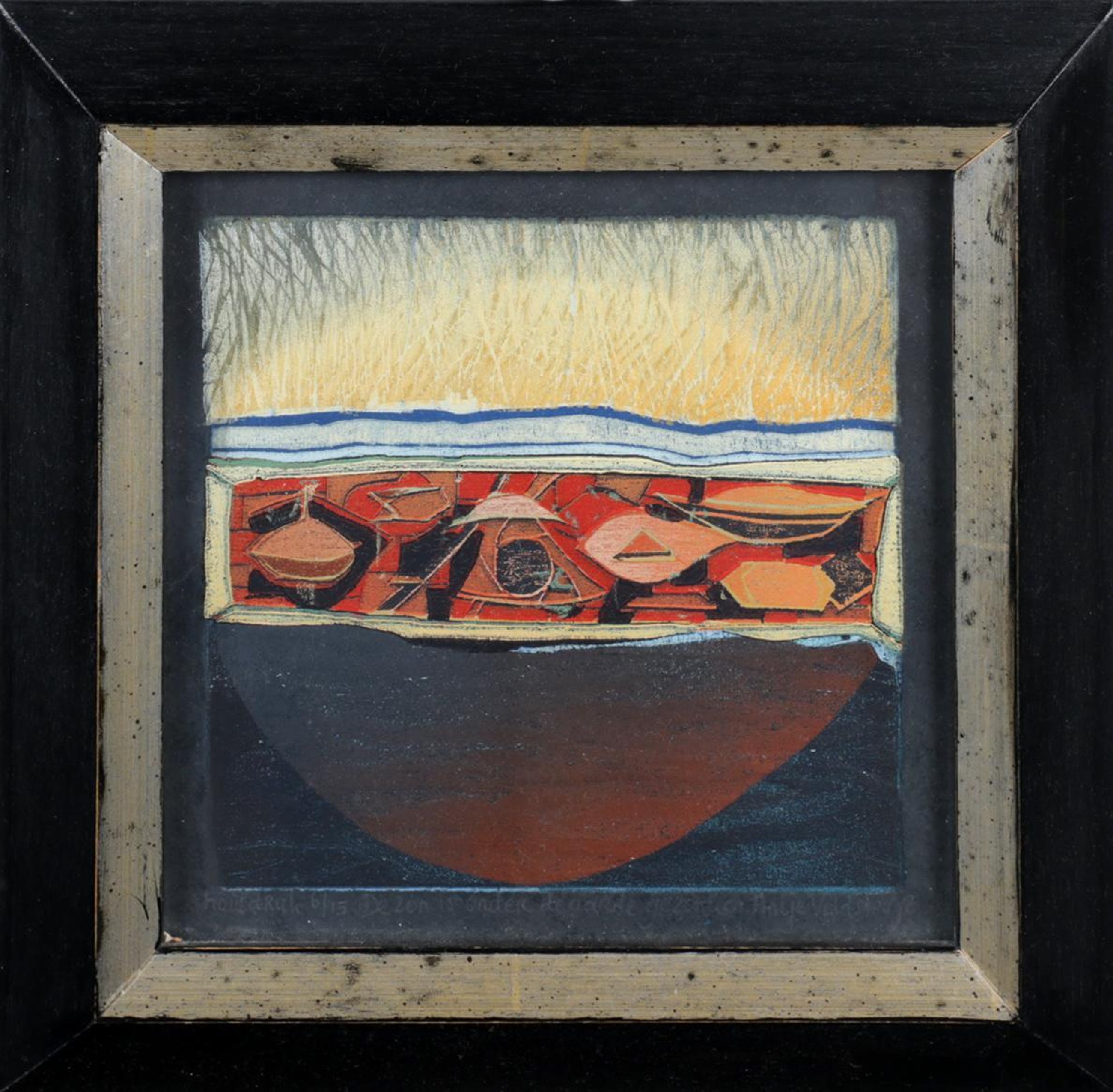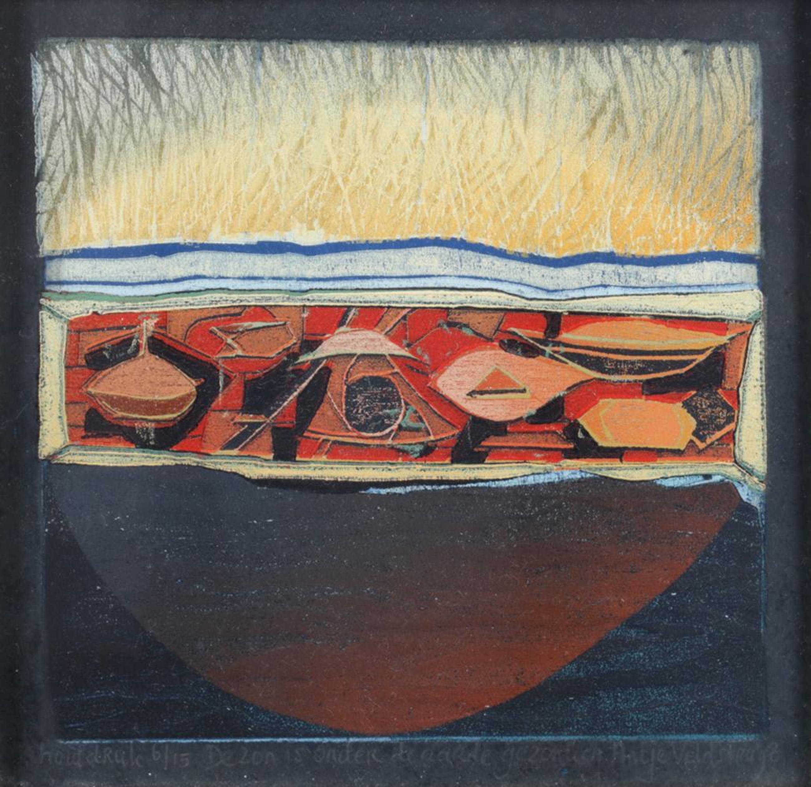 Houtsnede van Antje Veldstra. Titel: "De zon is onder de aarde gezonken". Jaar: 1998. Afmetingen incl lijst: H25 x b25cm. Afmetingen voorstelling: H17 x b17cm. Het werk is rechts onderaan gesigneerd door de kunstenares. De authenticiteit van het aangeboden werk wordt volledig gegarandeerd.