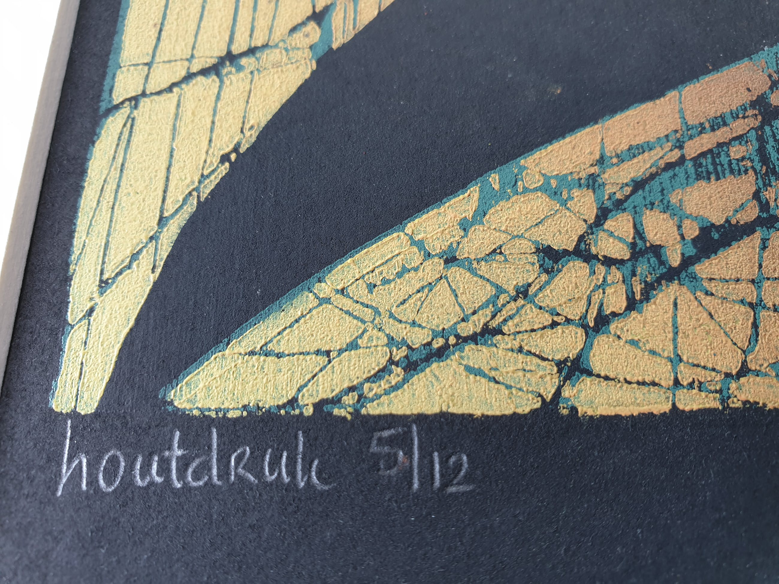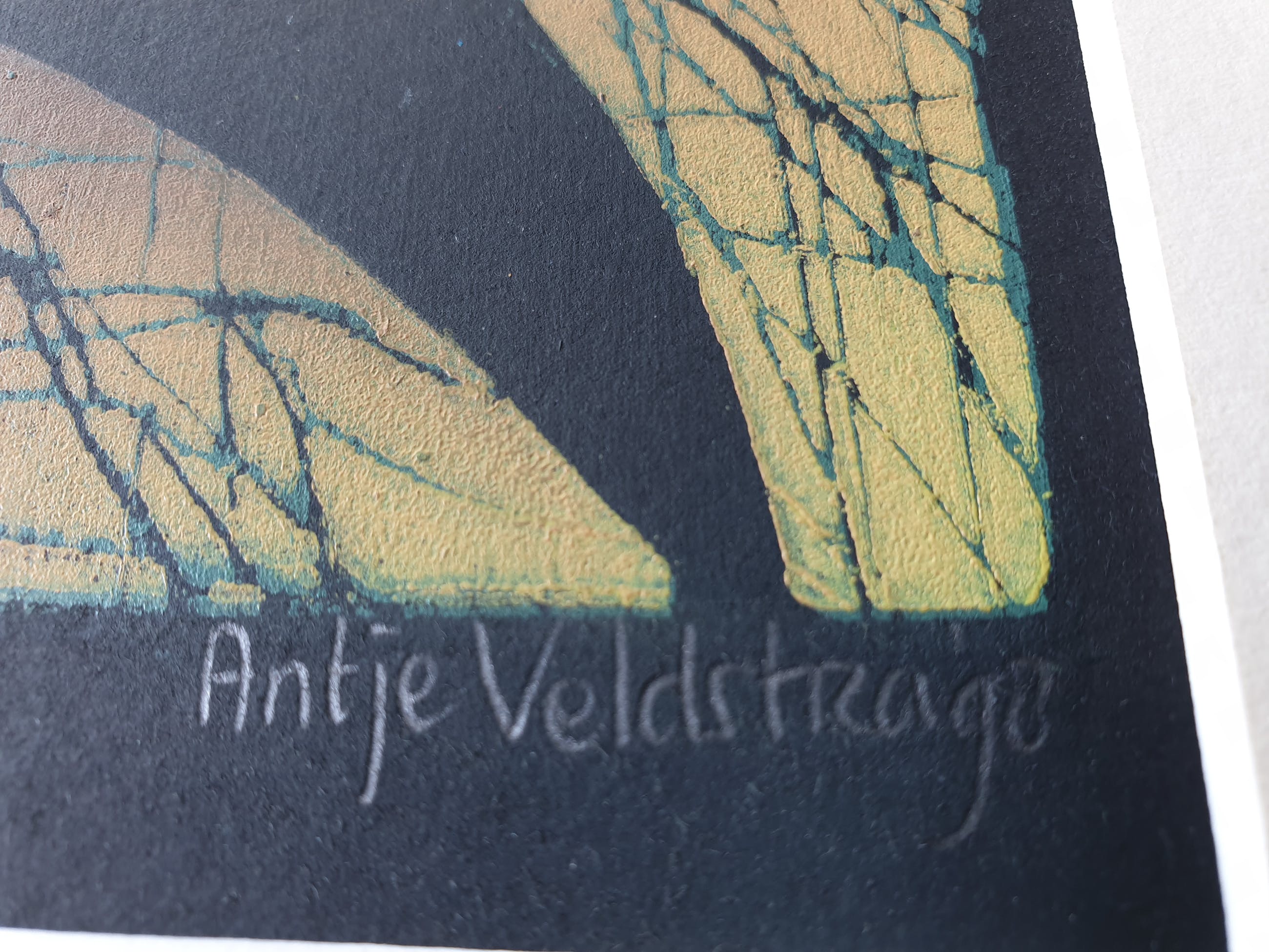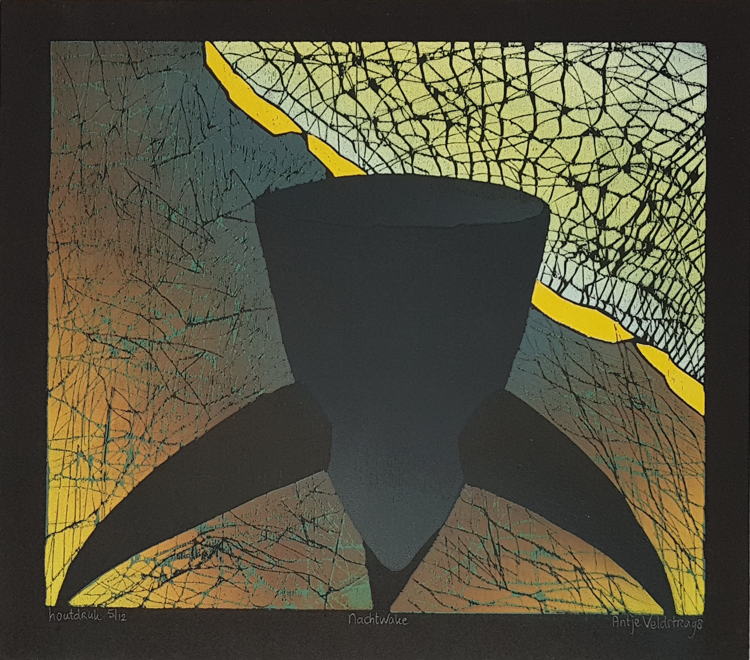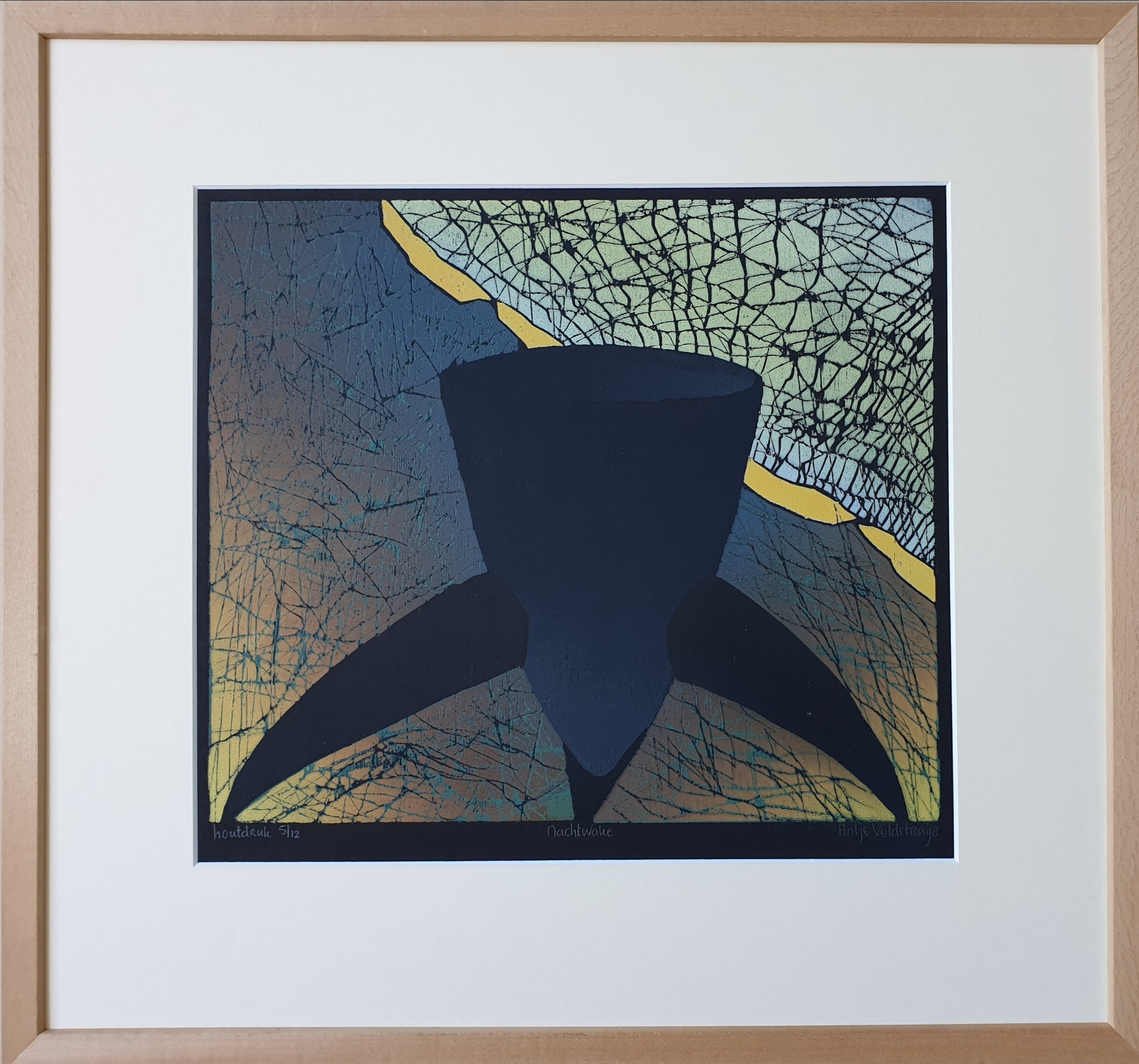 Antje Veldstra Houtsnede "Nachtwake" Oplage 5/12 Rechtsonder gesigneerd Antje Veldstra 98 Beeldmaat 27x30 cm Lijstmaat 42,50 x 45 cm