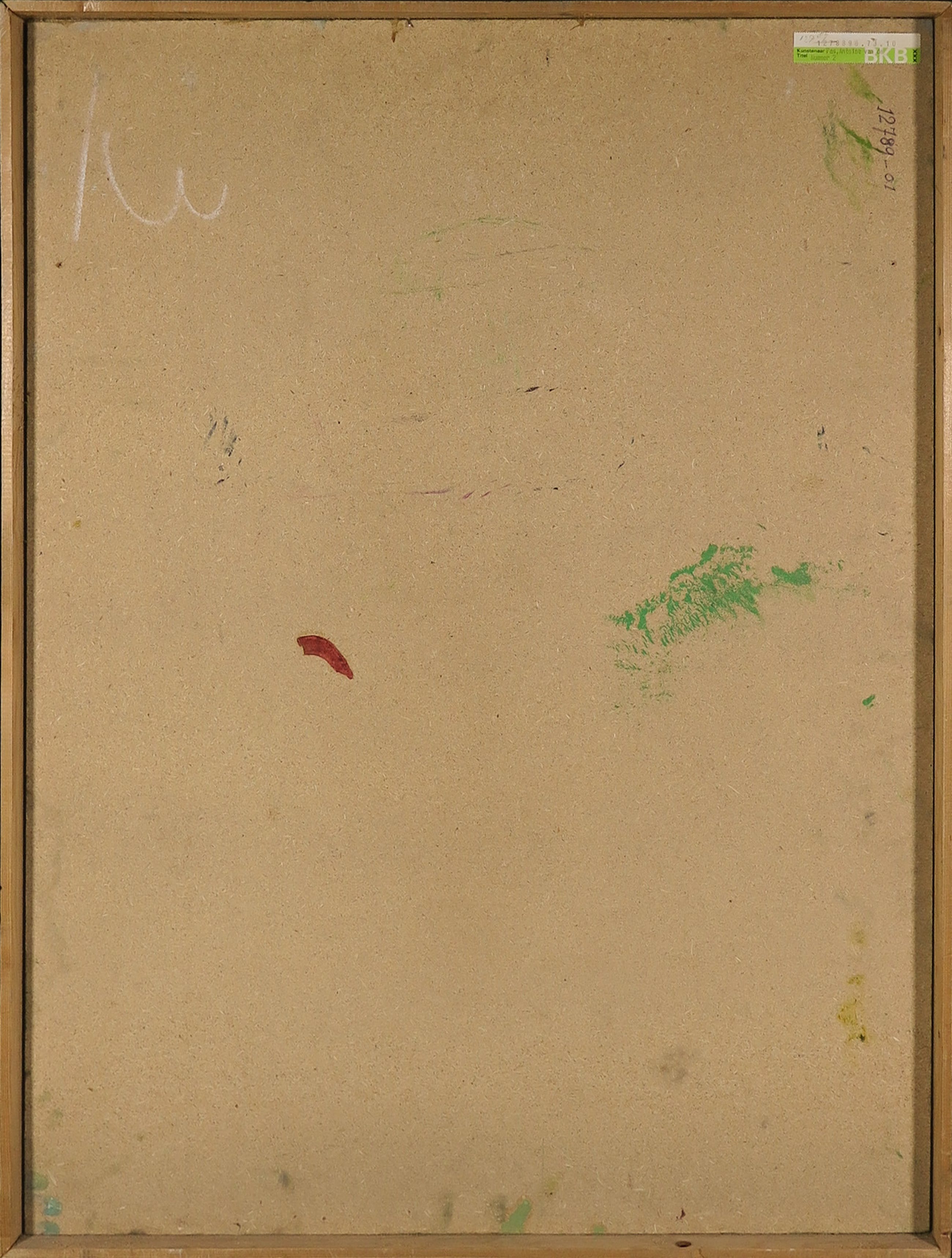 | Het werk is stoffig en heeft oppervlaktevuil. Langs de rand rechts onder de lijst wat beschadigingen. | |
