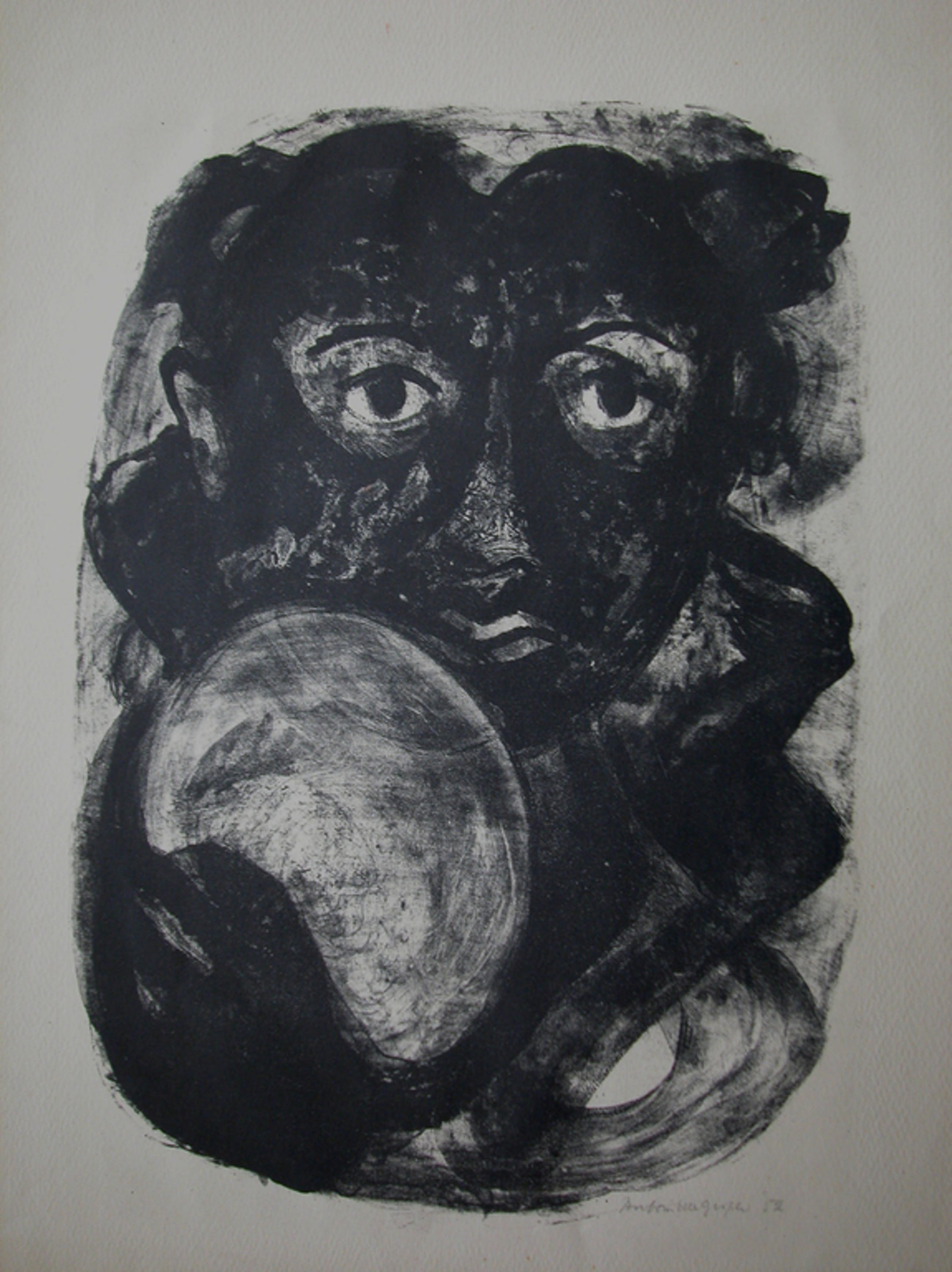 Deze geheimzinnige en magische afbeelding is een litho en is gemaakt in 1952. Dat blijkt uit de handtekening van de kunstenaar onder het werk waaraan '52 is toegevoegd.