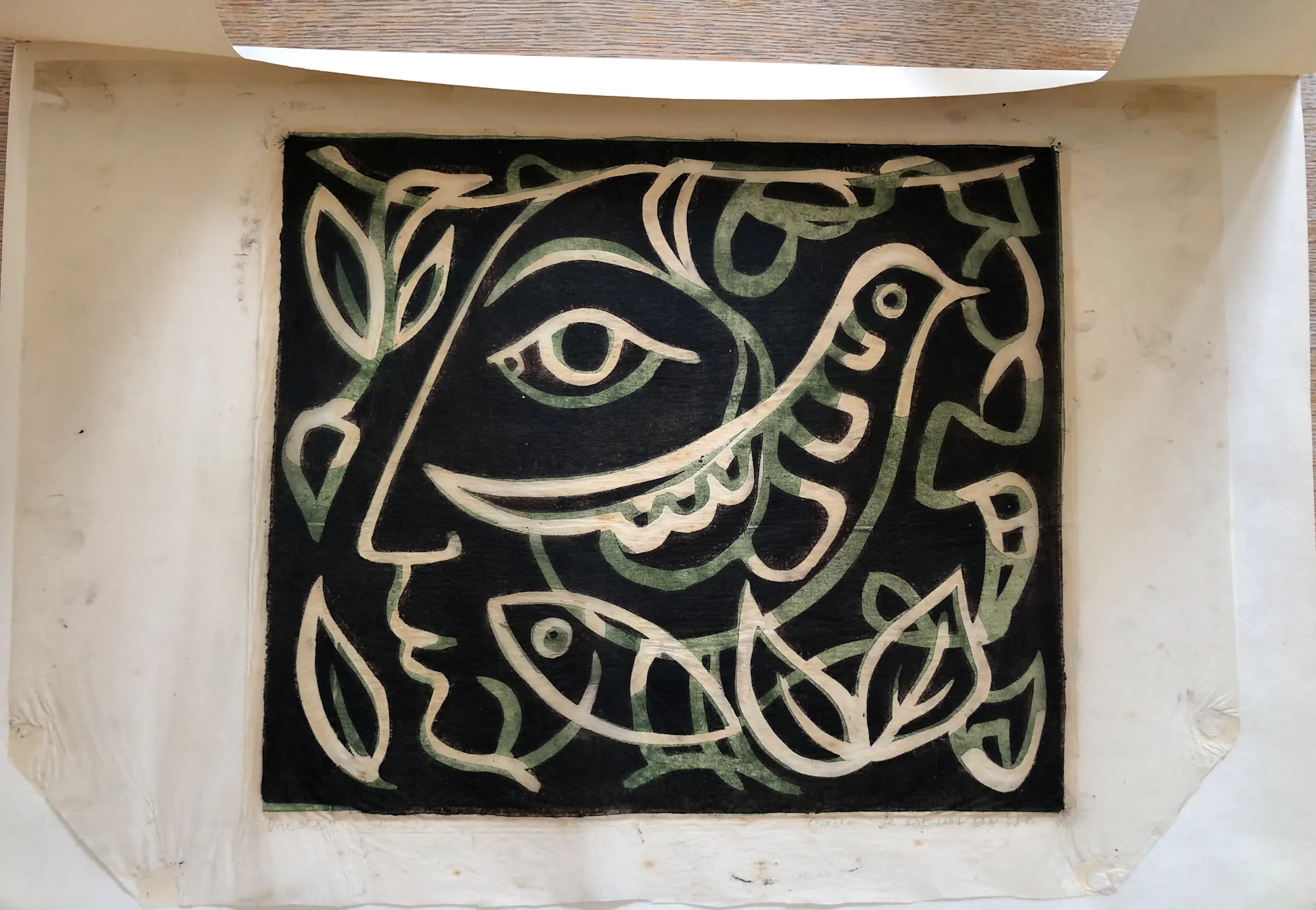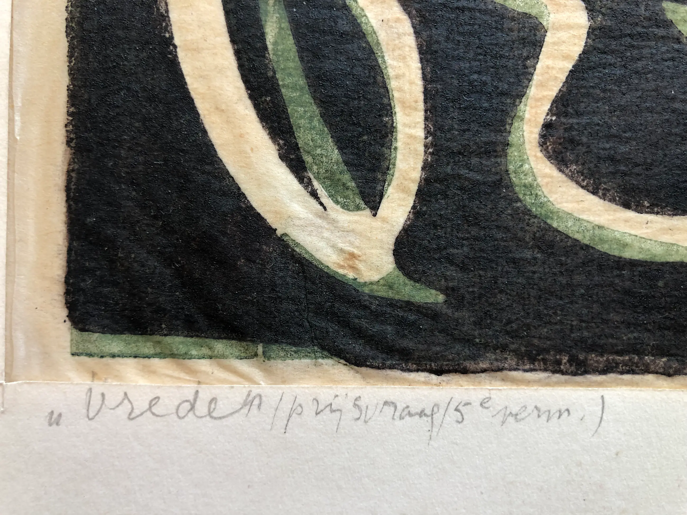 Houtsnede gemaakt op kwetsbaar dun vermoedelijk Japans papier. Vast geplakt in de hoekjes. Enkele tekenen van leeftijd. Verder mooi interessant werkje.