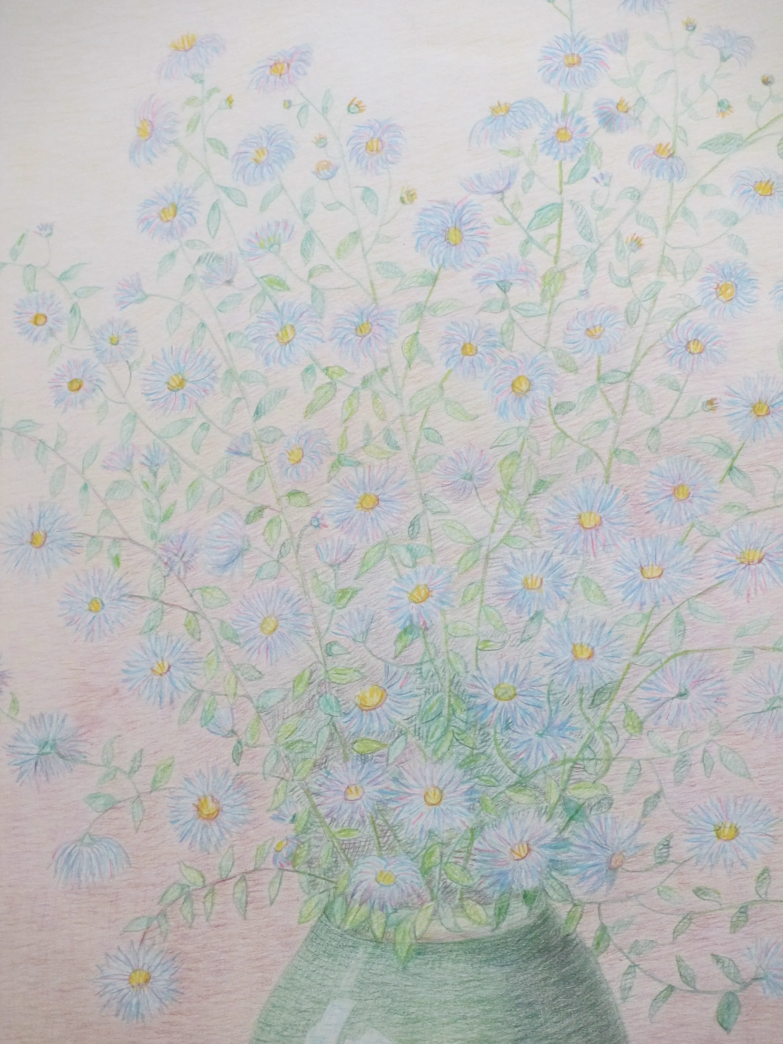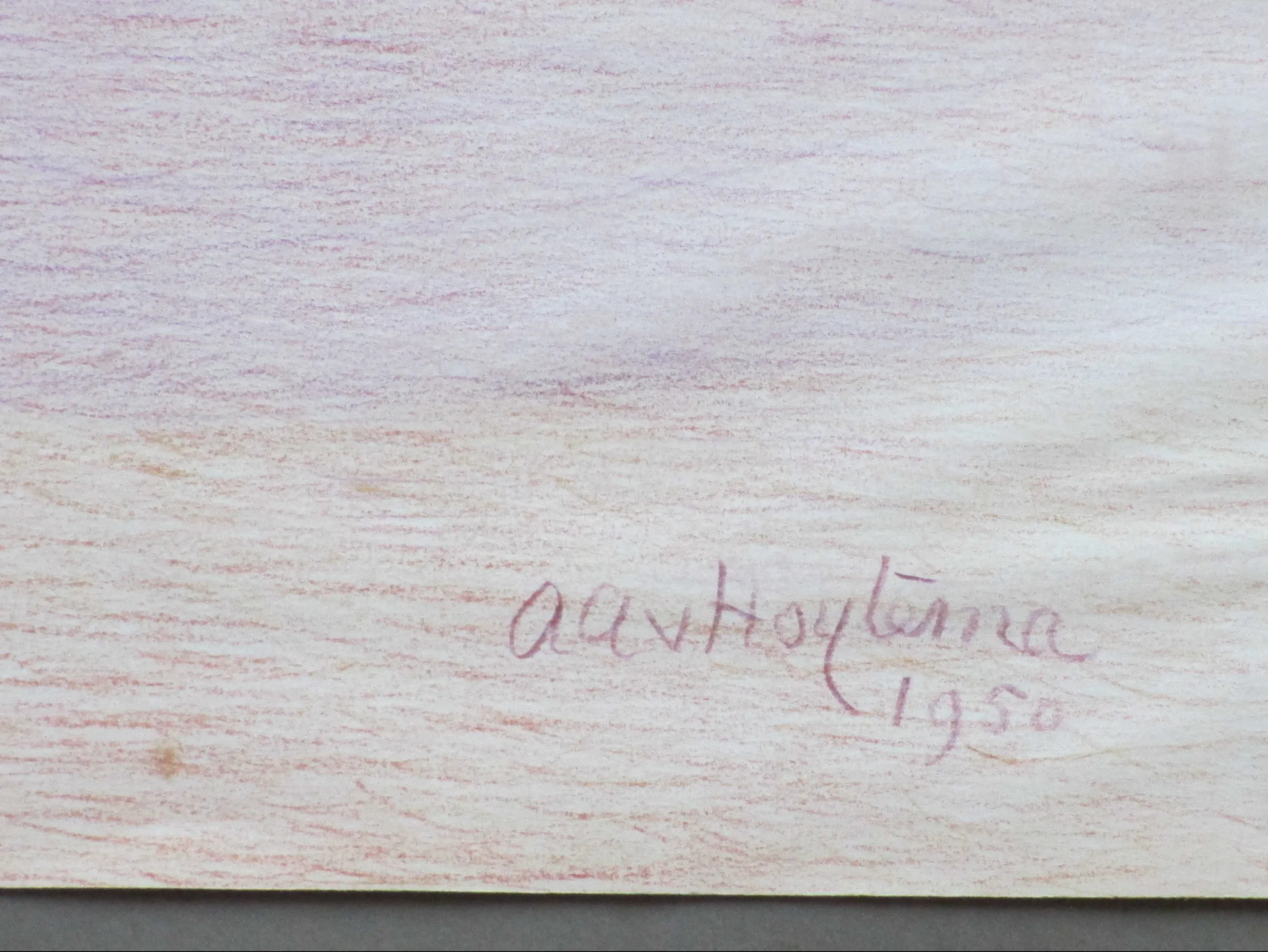 Gemengde techniek in potlood en kleurpotlood door Antoinette van Hoytema. Voorstelling van een bloemboeket in een groene vaas. Losbladig, beeldmaat 65x49 Gesigneerd en gedateerd rechtsonder: 'A A v Hoytema 1950' Authenticiteit volledig gegarandeerd