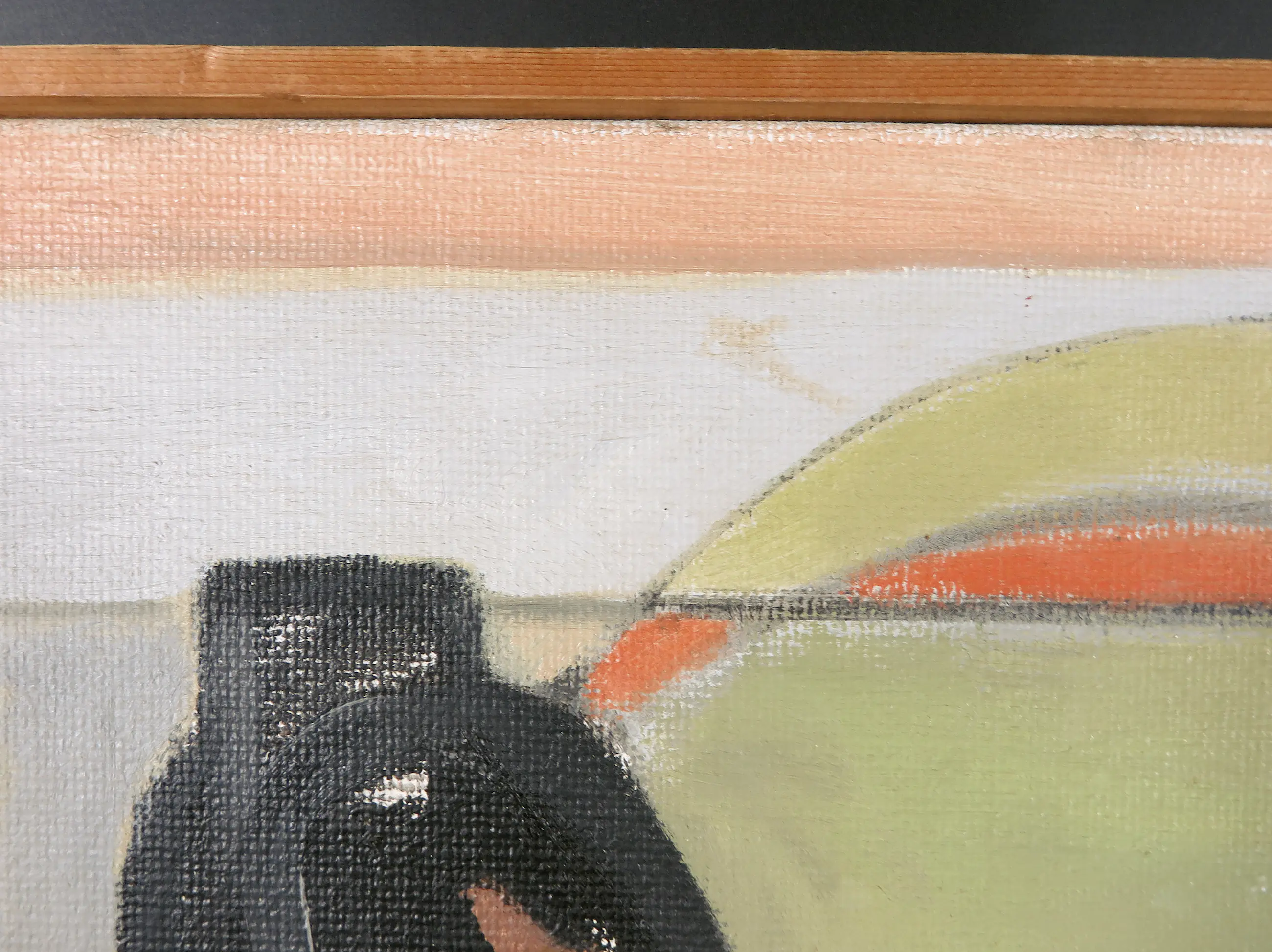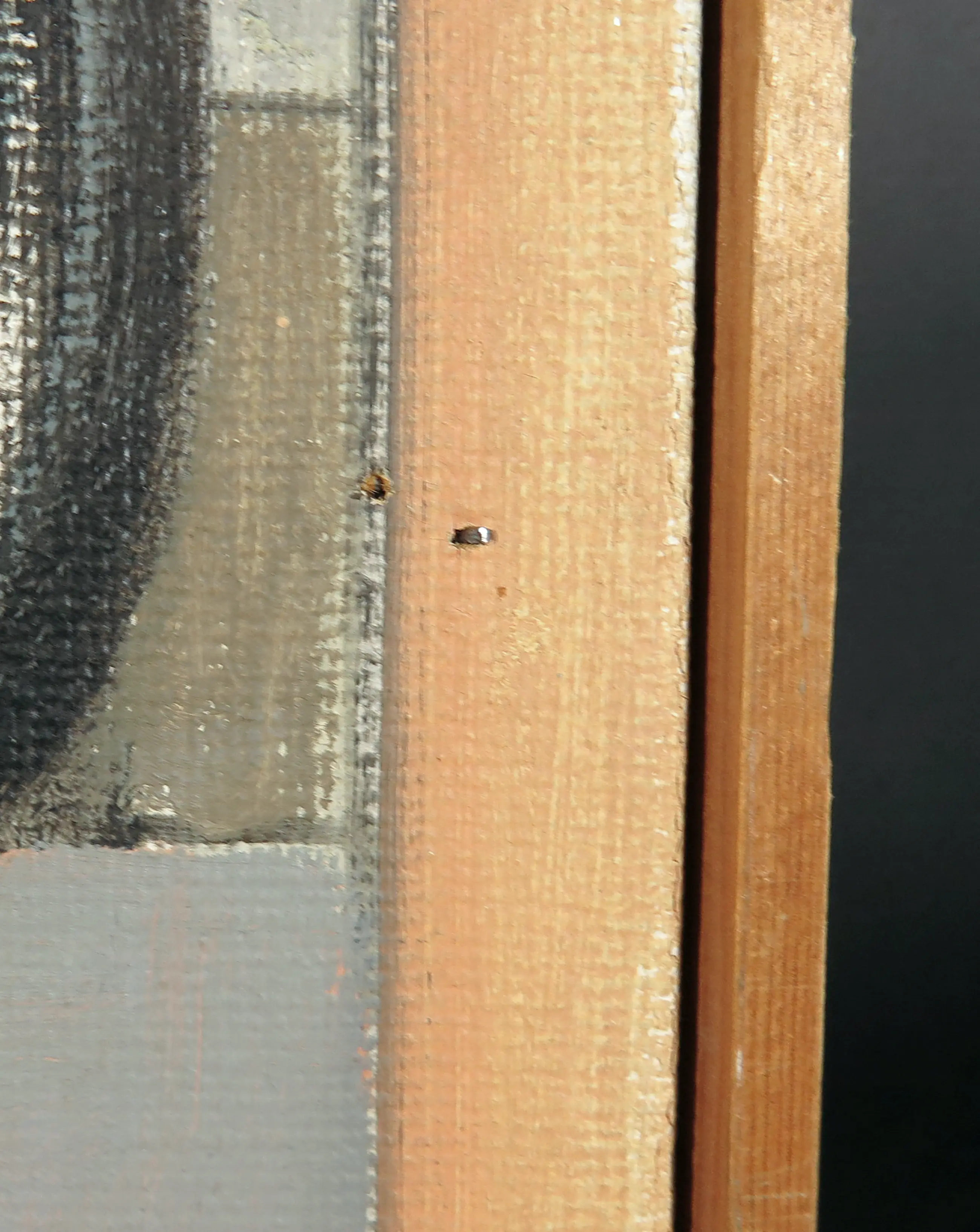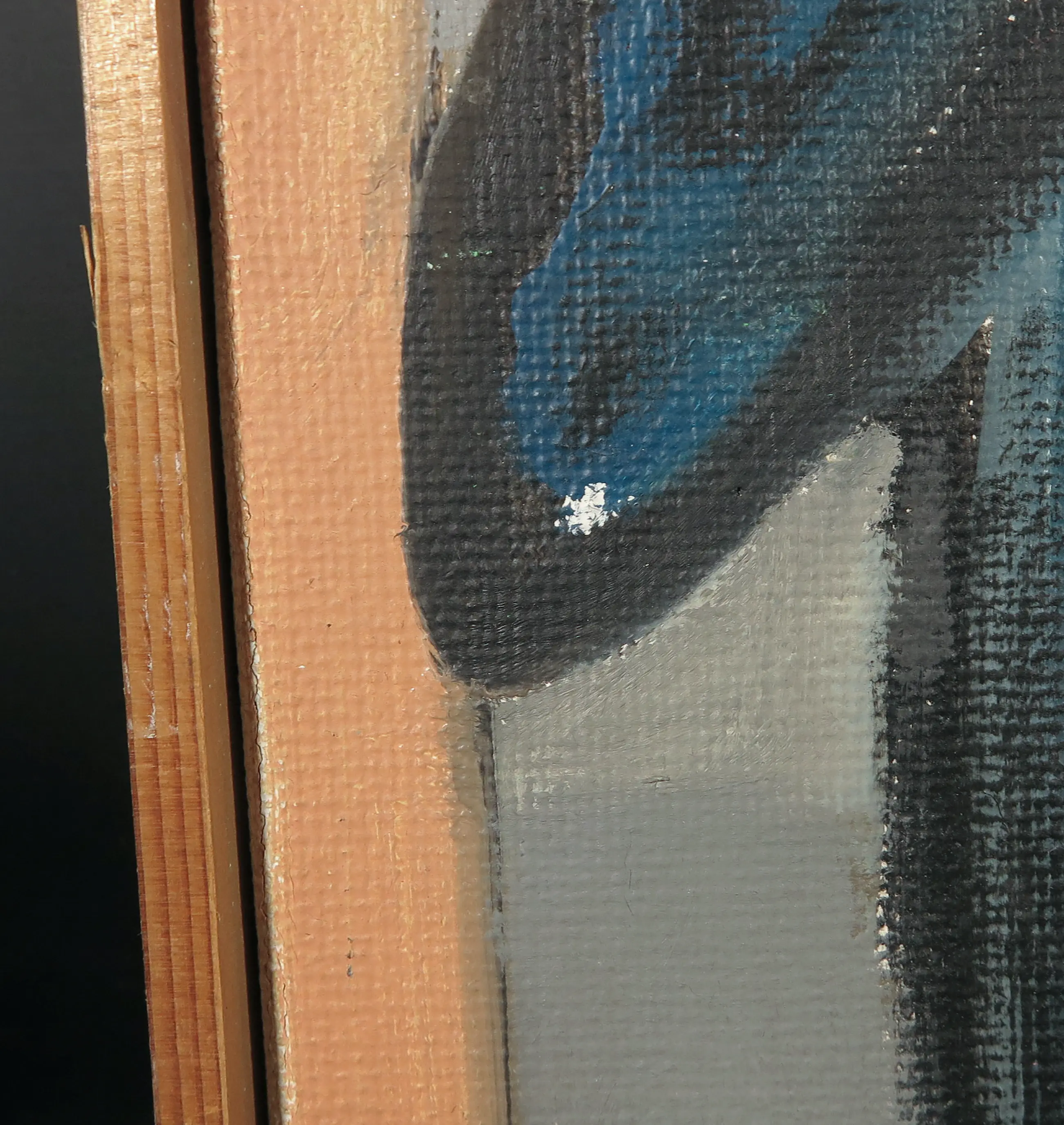 | Het werk is wat vuil en heeft één plekje met verfschade. Vlak langs de lijst komt er een spijkertje door het doek. | |