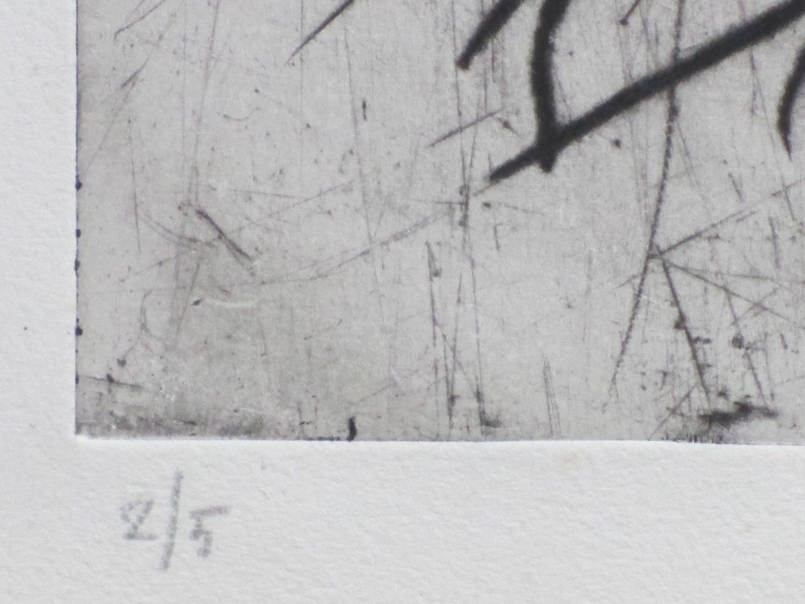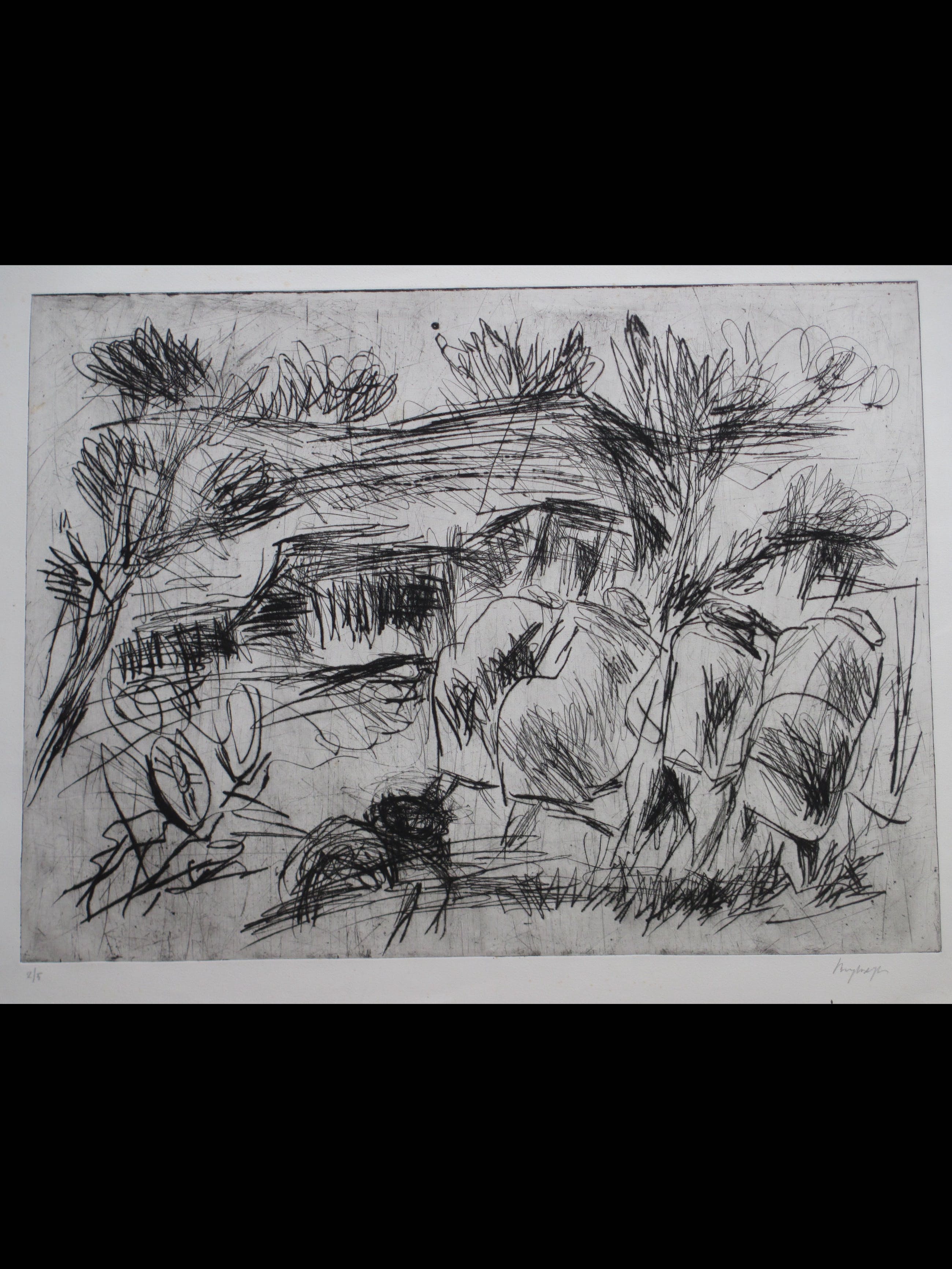 Ets door Anton Buytendijk. Niet getiteld, voorstelling suggereert een windrijk landschap met dieren/figuren. Losbladig Gesigneerd in potlood r.o. Genummerd in potlood l.o.