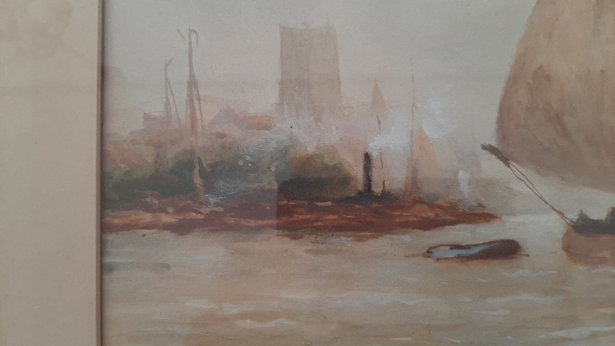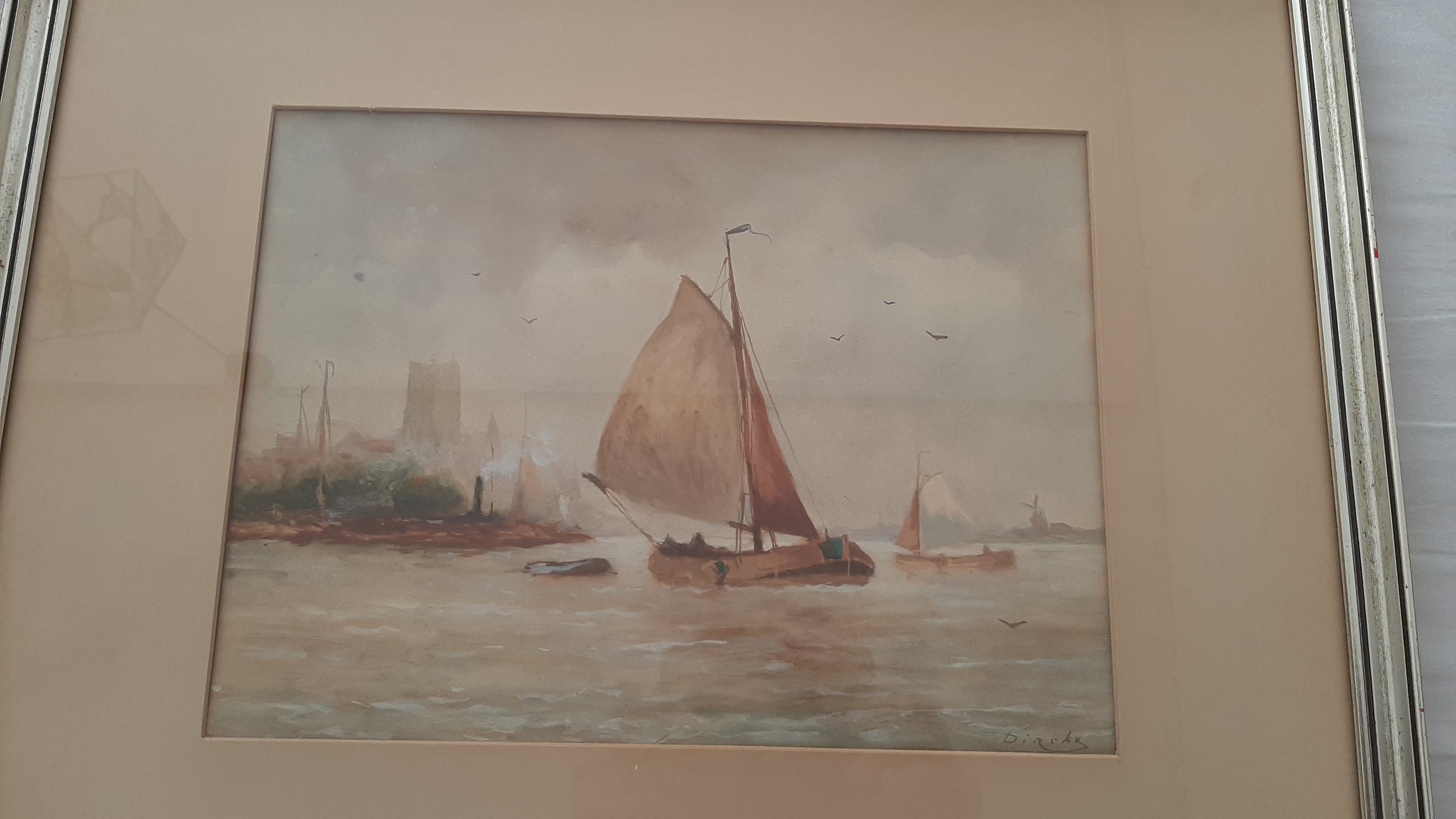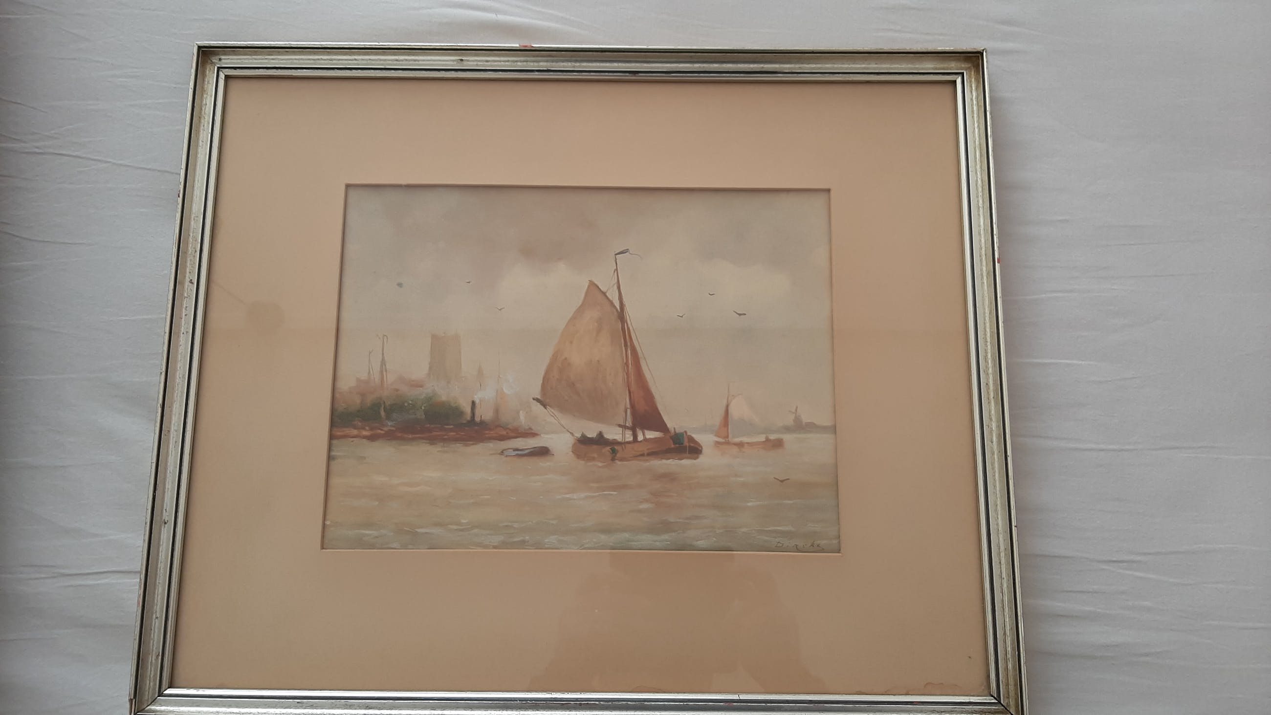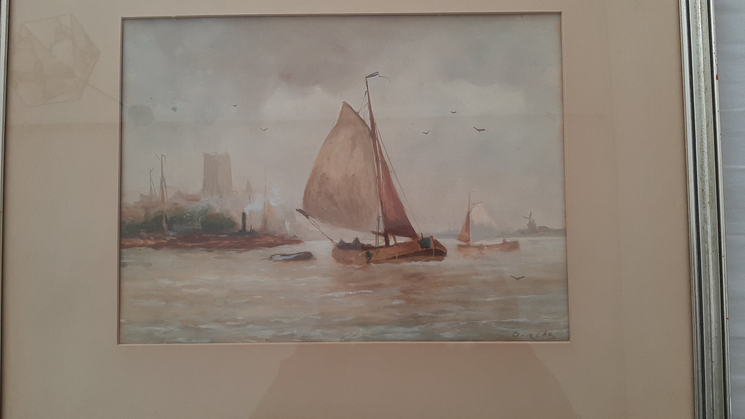 Een aquarel voorstellende zeilschepen met op de achtergrond de toren van de Grote Kerk in Dordrecht, gezien vanuit Zwijndrecht .