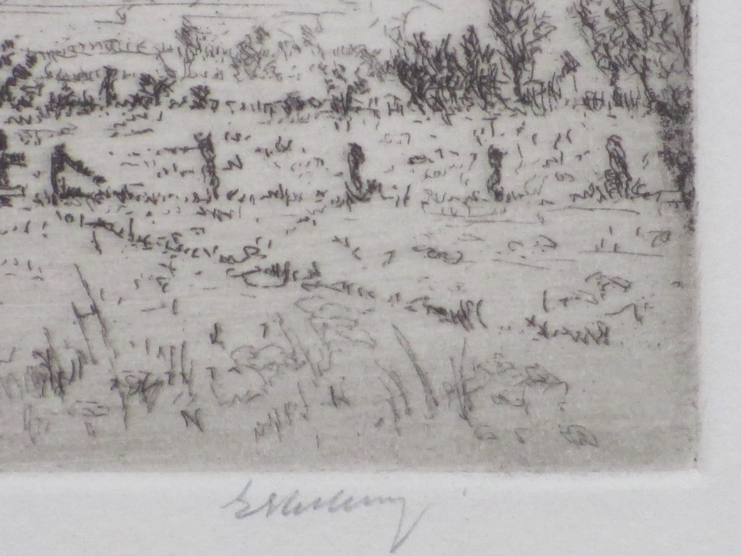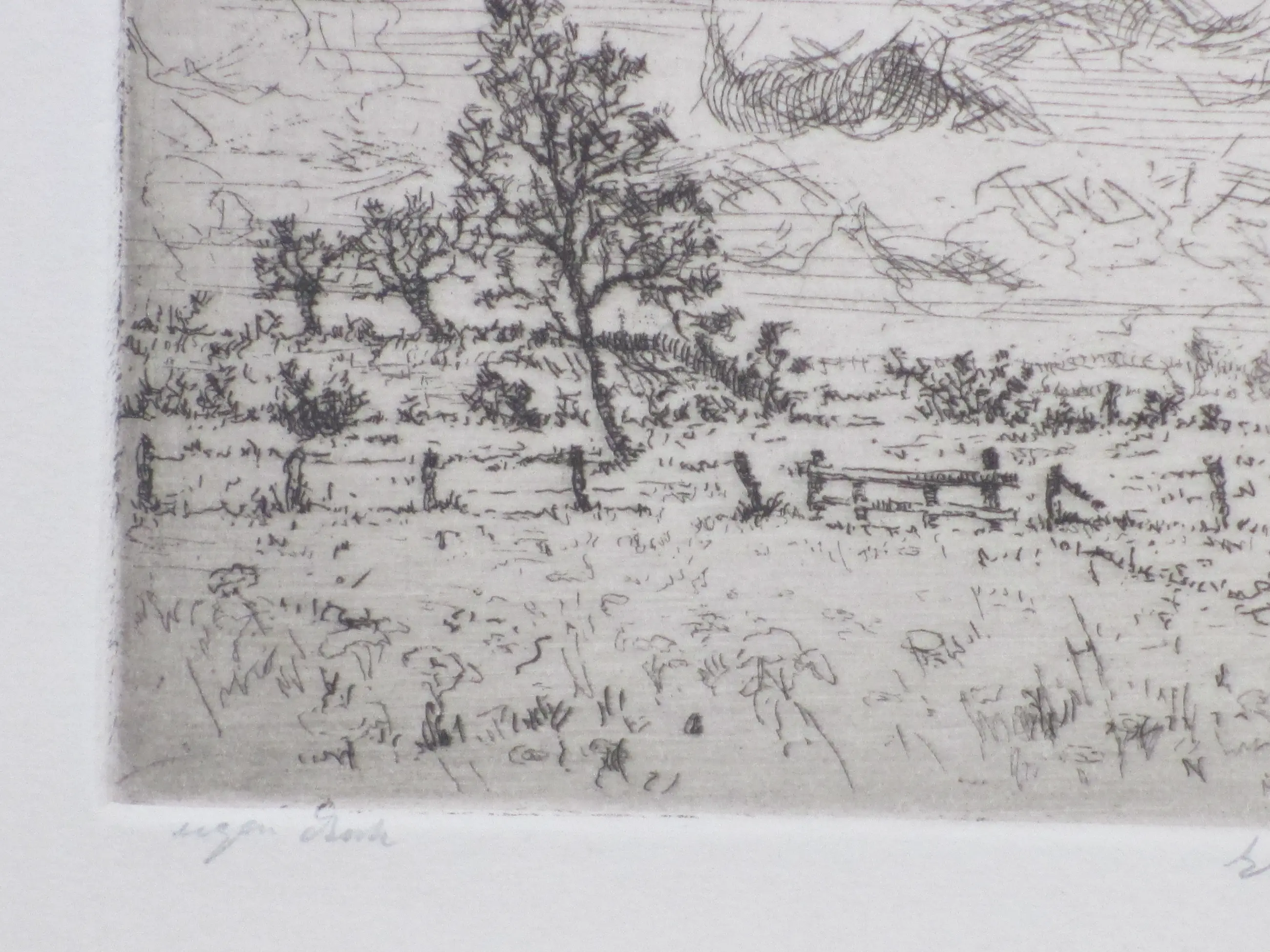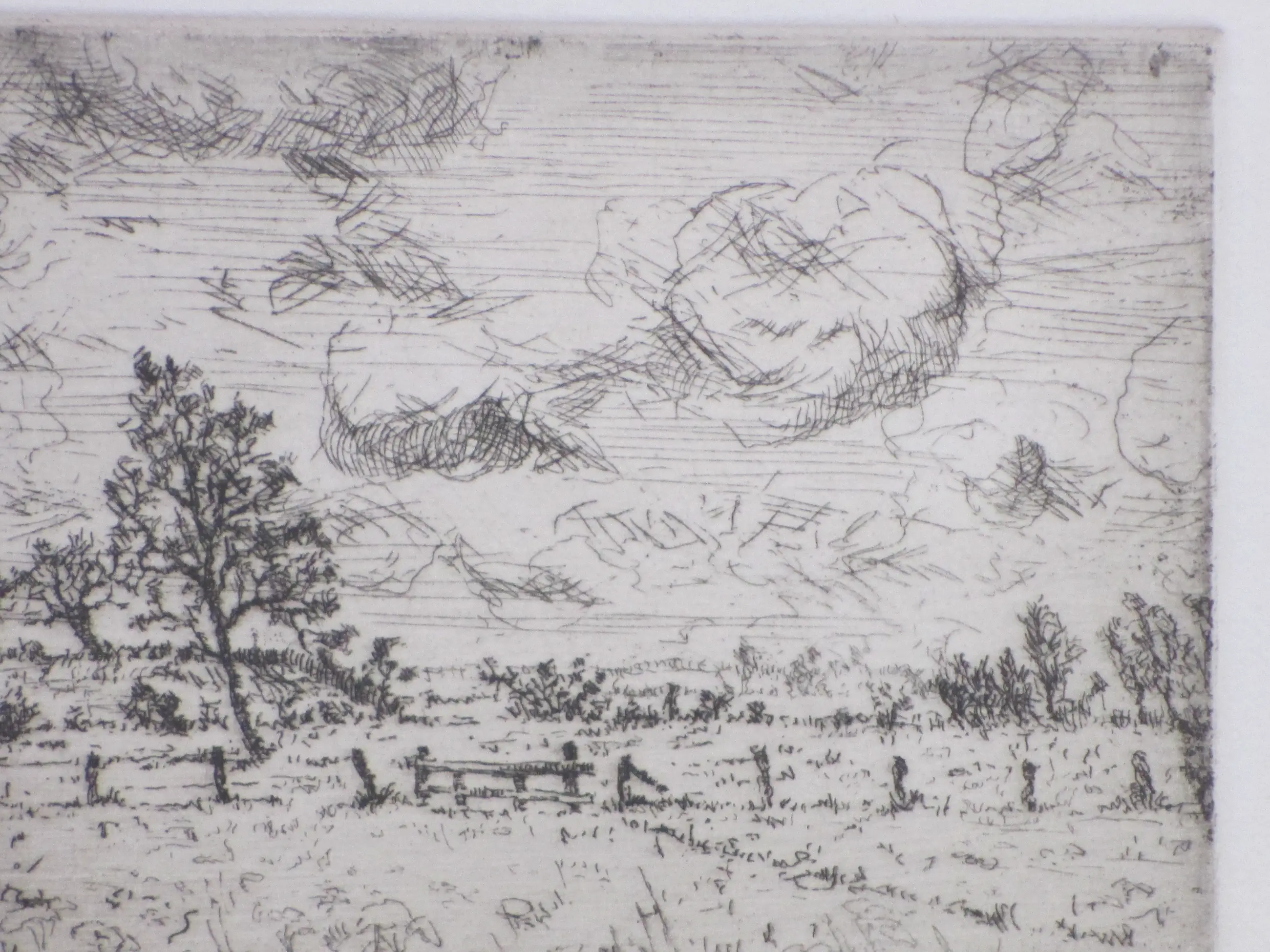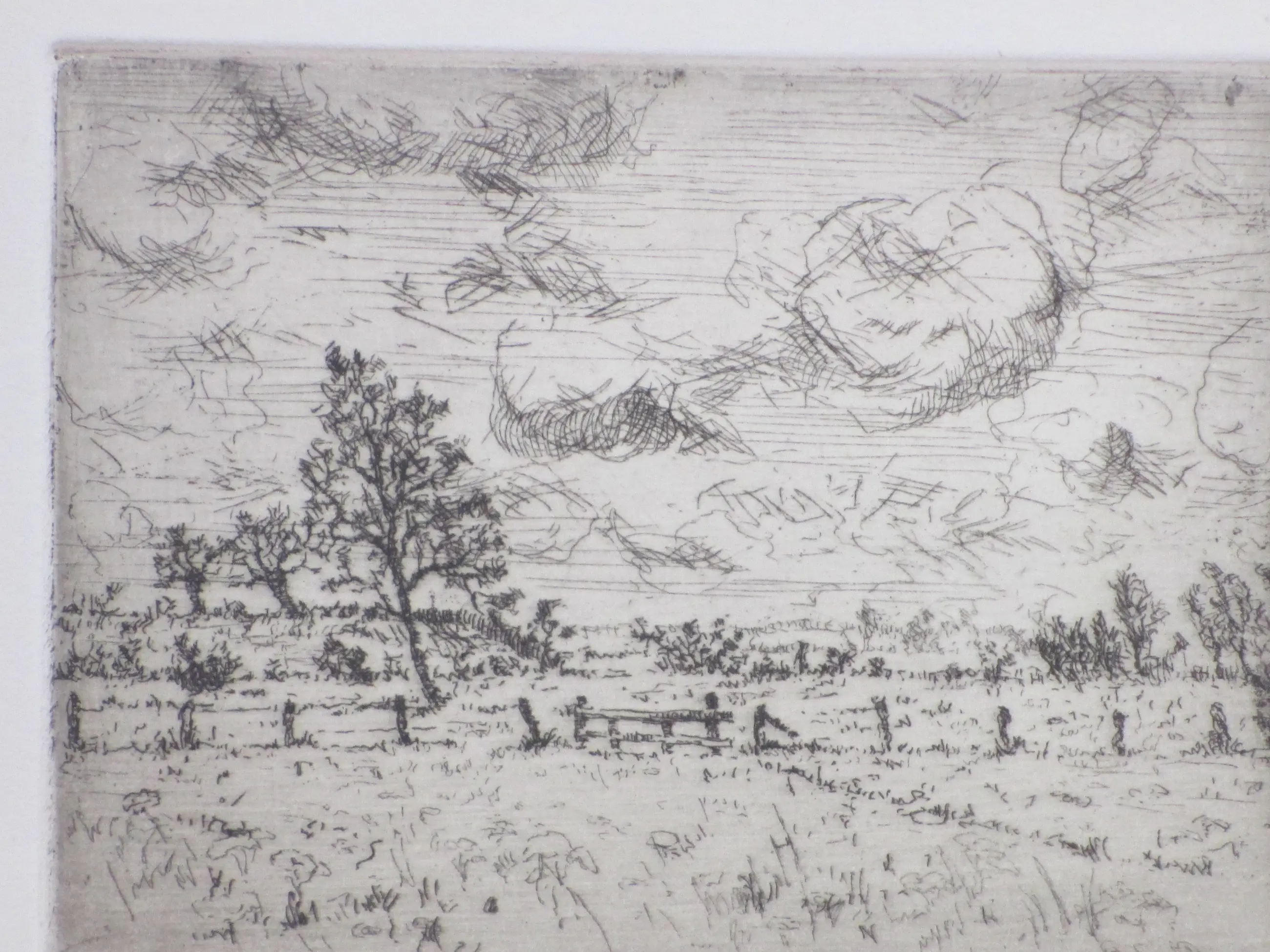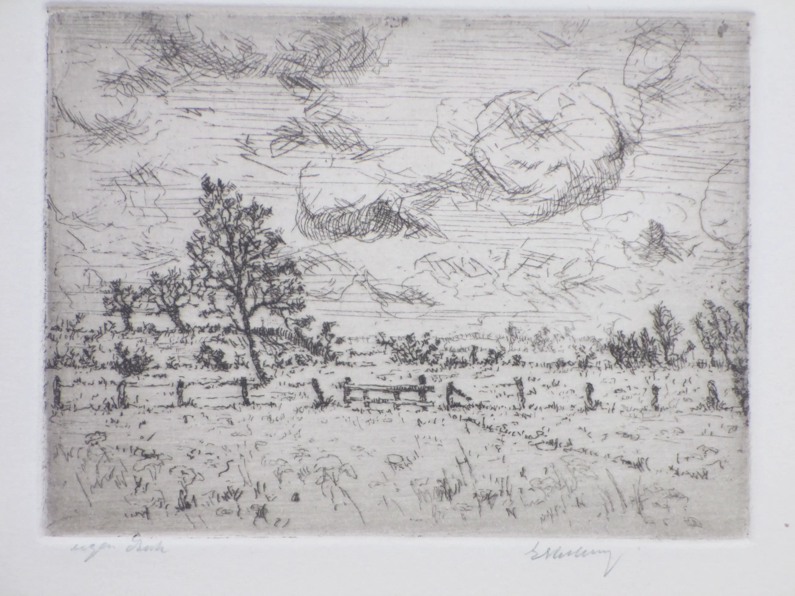 Ets door Anton Erkelens Voorstelling van stormachtig weer boven een landschap Losbladig, beeldmaat 12x15.5, bladmaat 19x26 Gesigneerd in potlood r.o.: 'Erkelens' Annotatie in potlood l.o.: 'eigen druk' Collectioneurssticker A. van Os op achterzijde: 'A.v.O. no 72' Authenticiteit volledig gegarandeerd