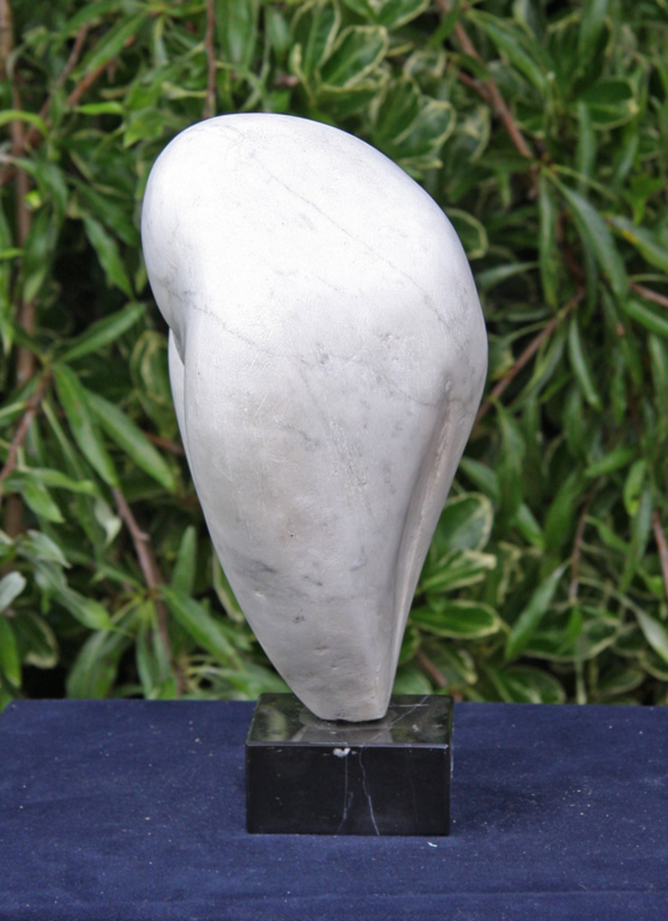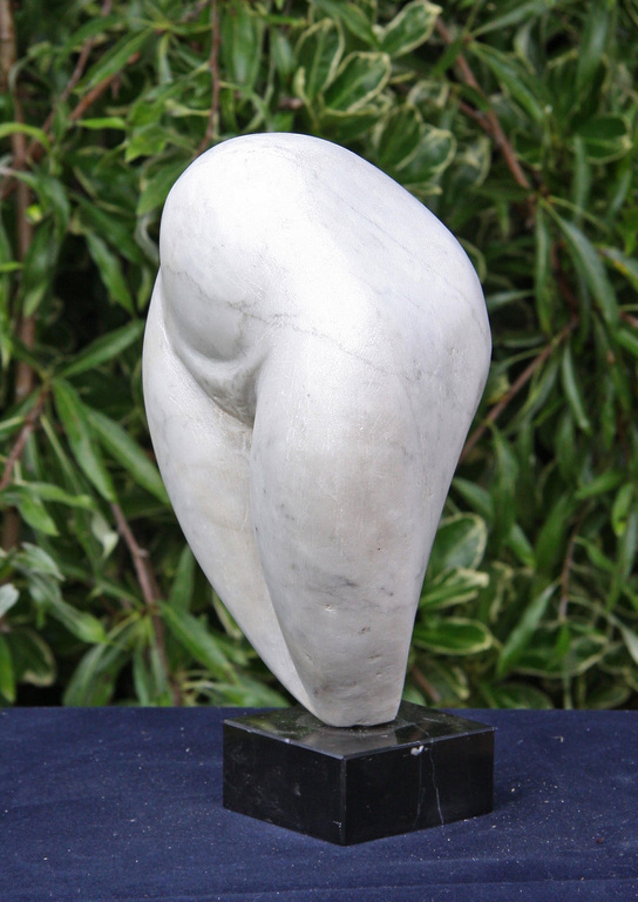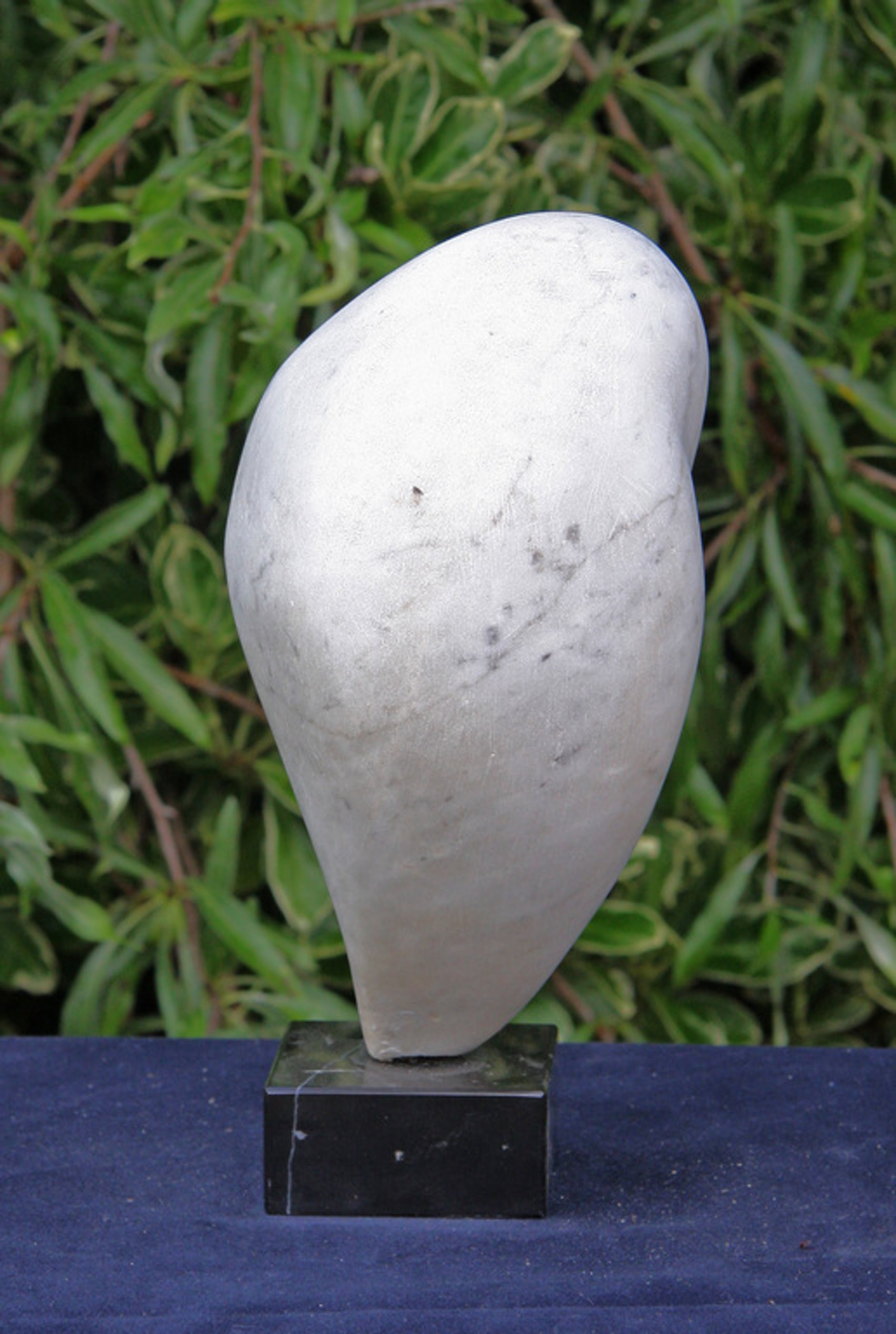 Kleine witmarmeren bijna hartvormige sculptuur, afmeting 22 x 13 x 10 cm inclusief de zwartmarmeren sokkel.