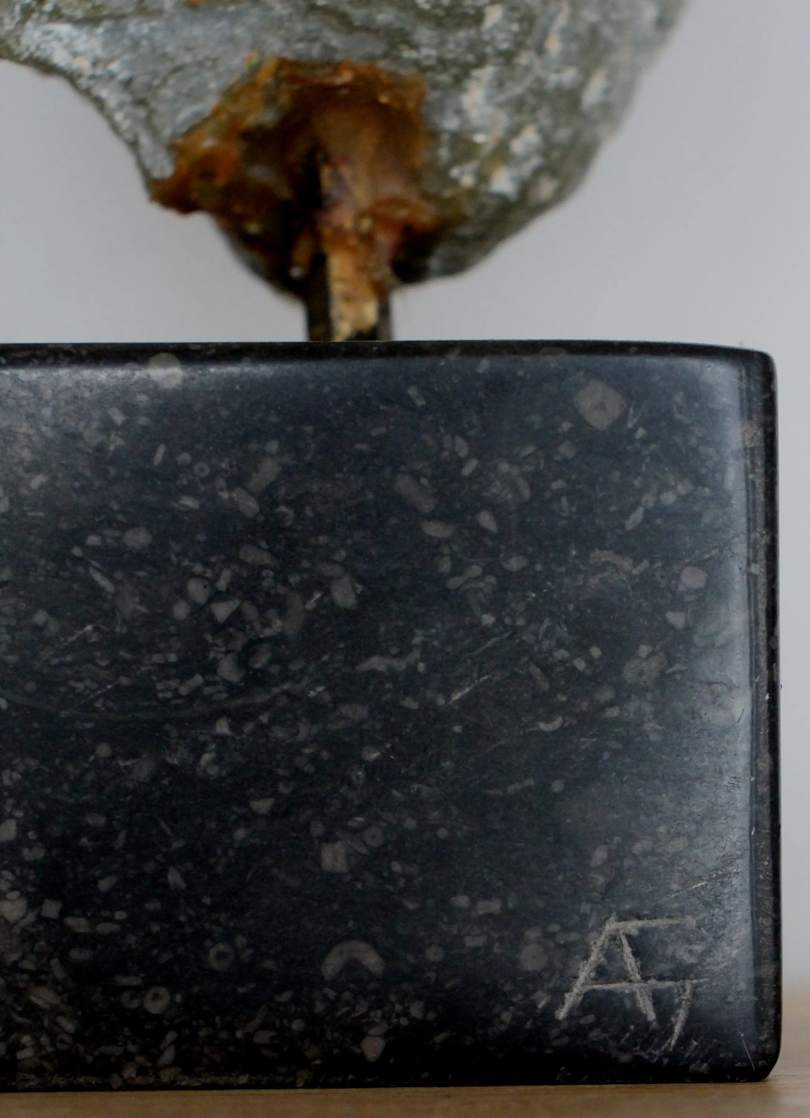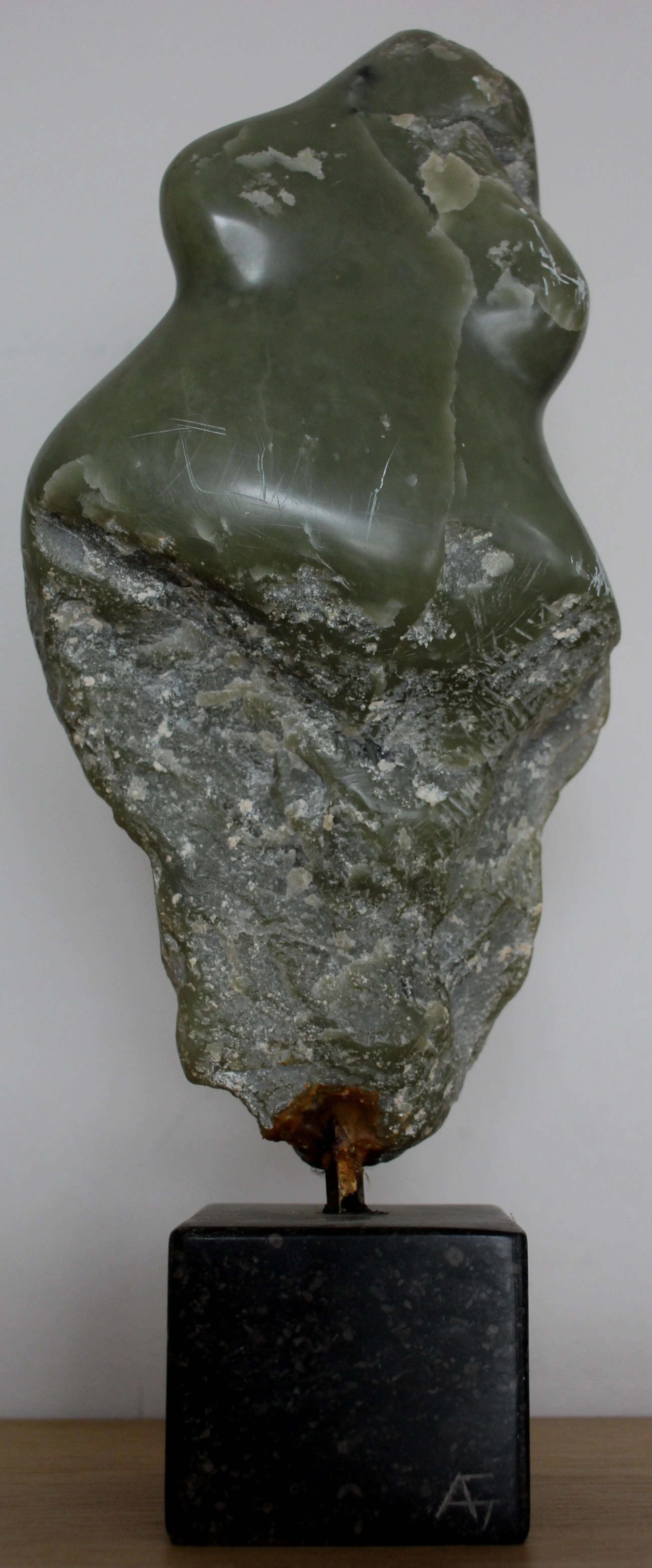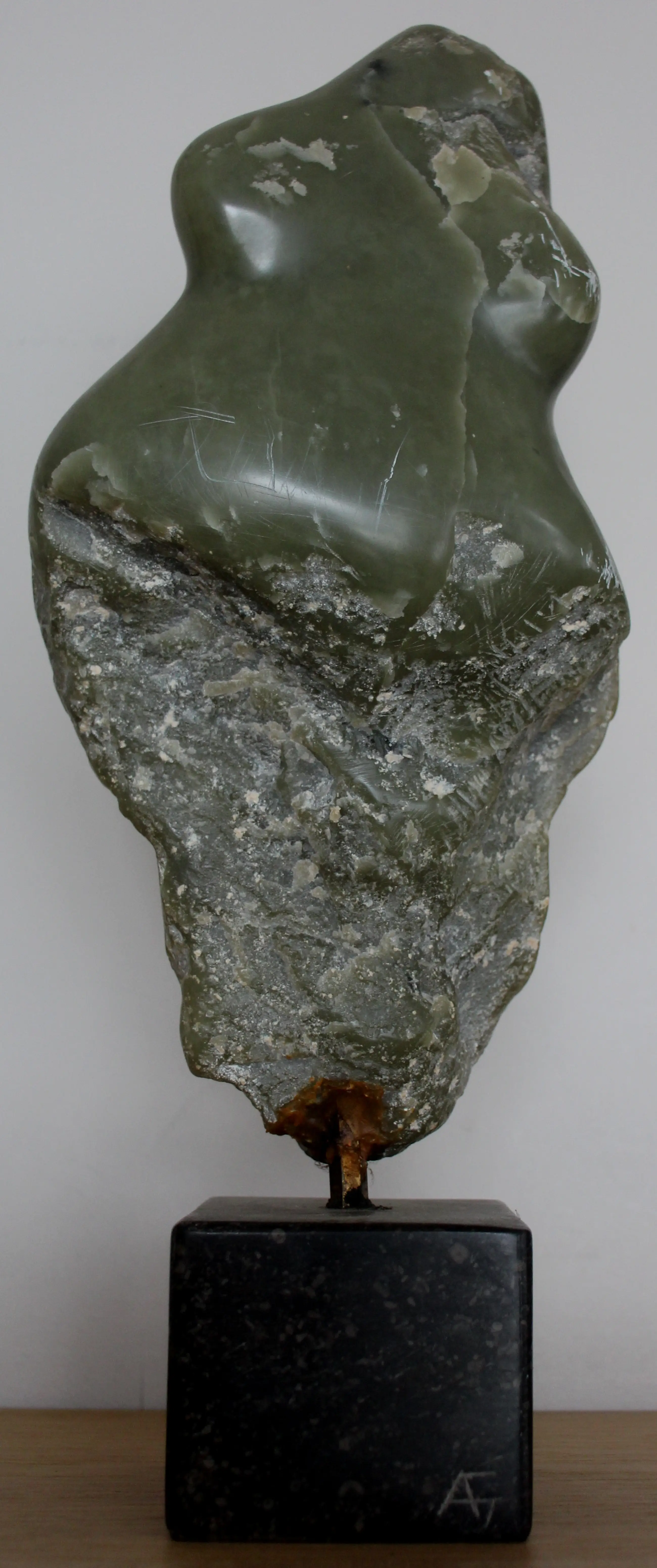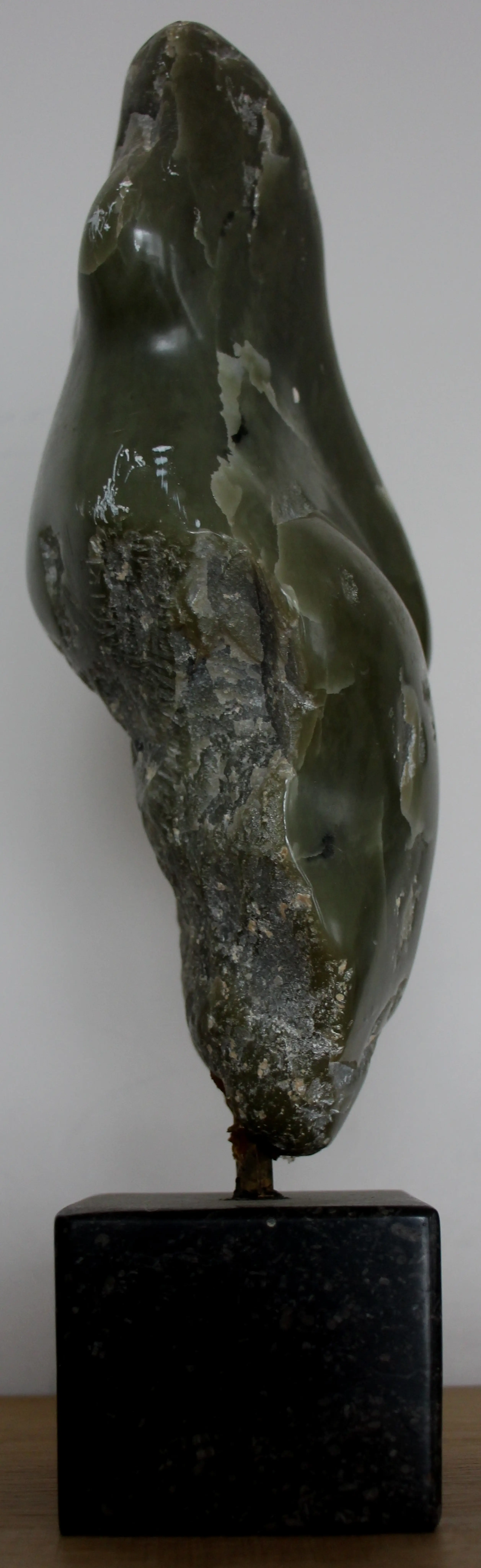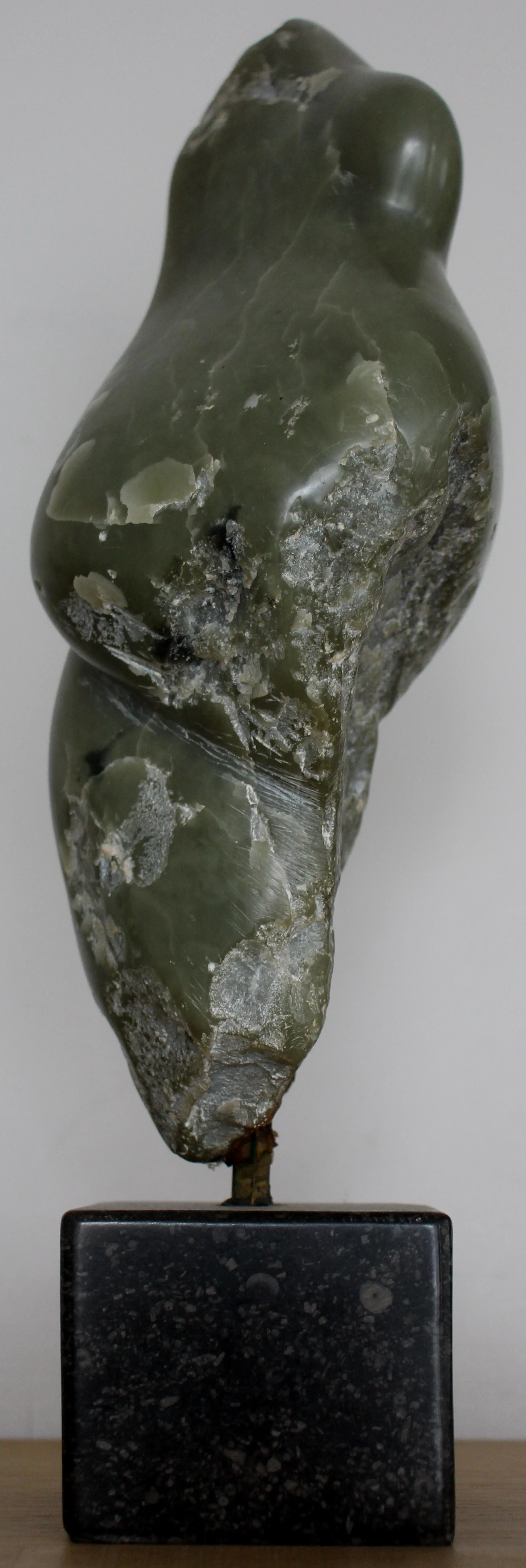 Gepolijst groengekleurd hardstenen beeld van een geabstraheerde vrouwelijke torso. Op rechthoekig granieten basement. Het beeld is op de basement, gemonogrammeerd door de kunstenaar. De authenticiteit van het aangeboden werk wordt volledig gegarandeerd. Een certificaat van echtheid kan, op aanvraag, worden gemaild.
