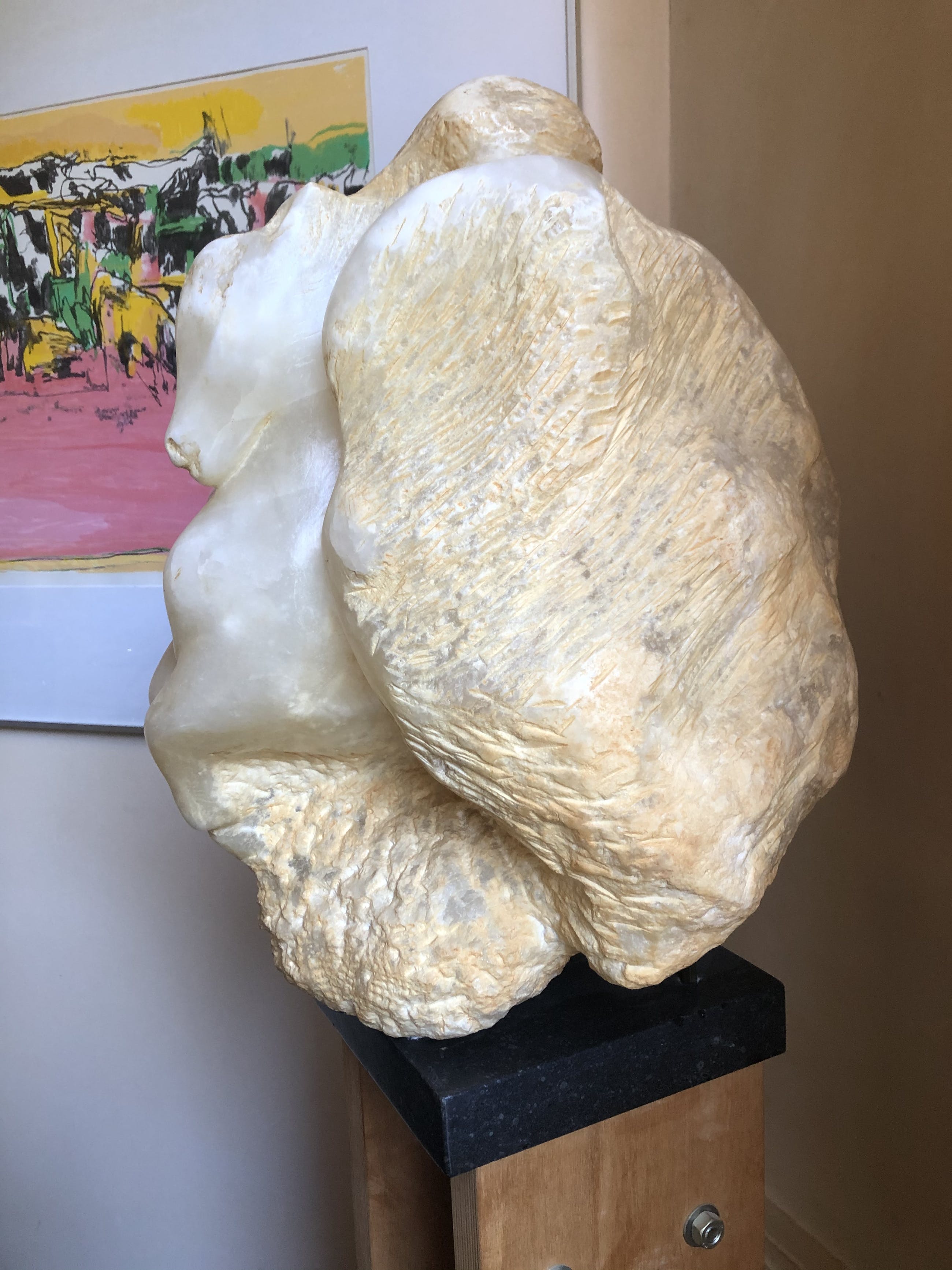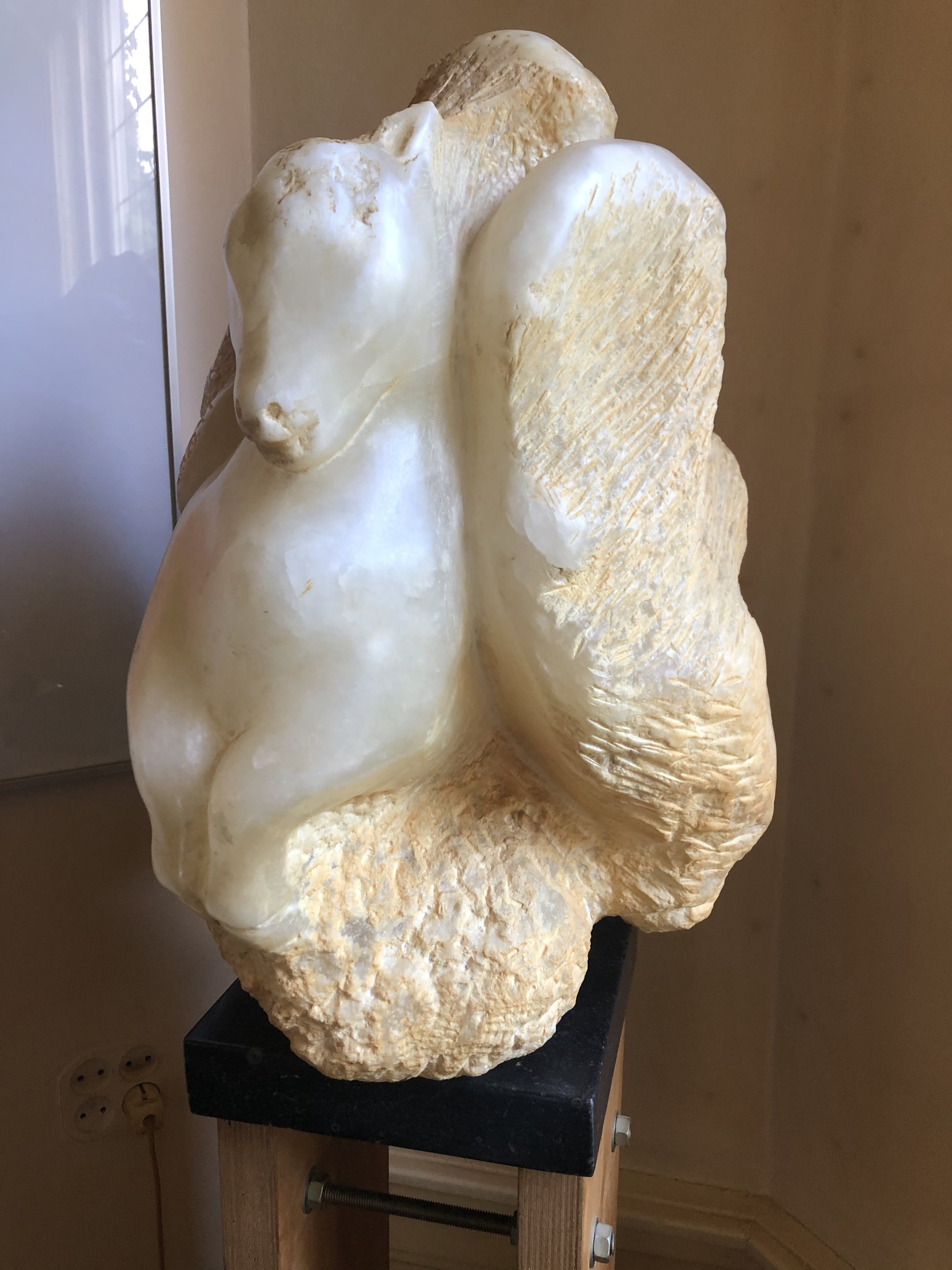 Albasten beeld van Pegasus, op marmeren voetje. Het beeld heeft in een ruimte gestaan waar gerookt is, maar schoonmaken is goed te doen (ik heb een stukje gepoetst, gaat prima) Het beeld komt van galerie Aelbrecht en is heel erg zwaar.