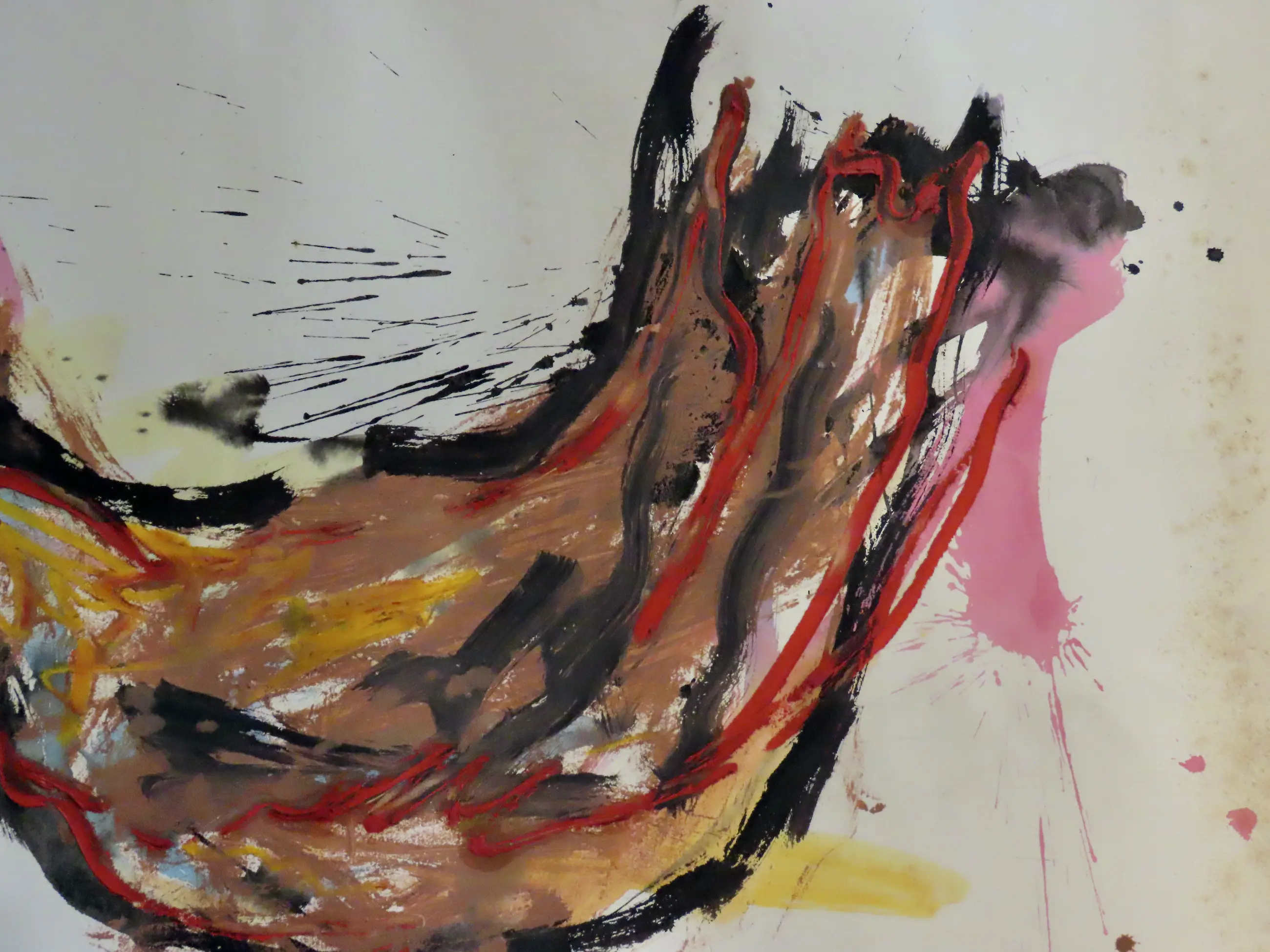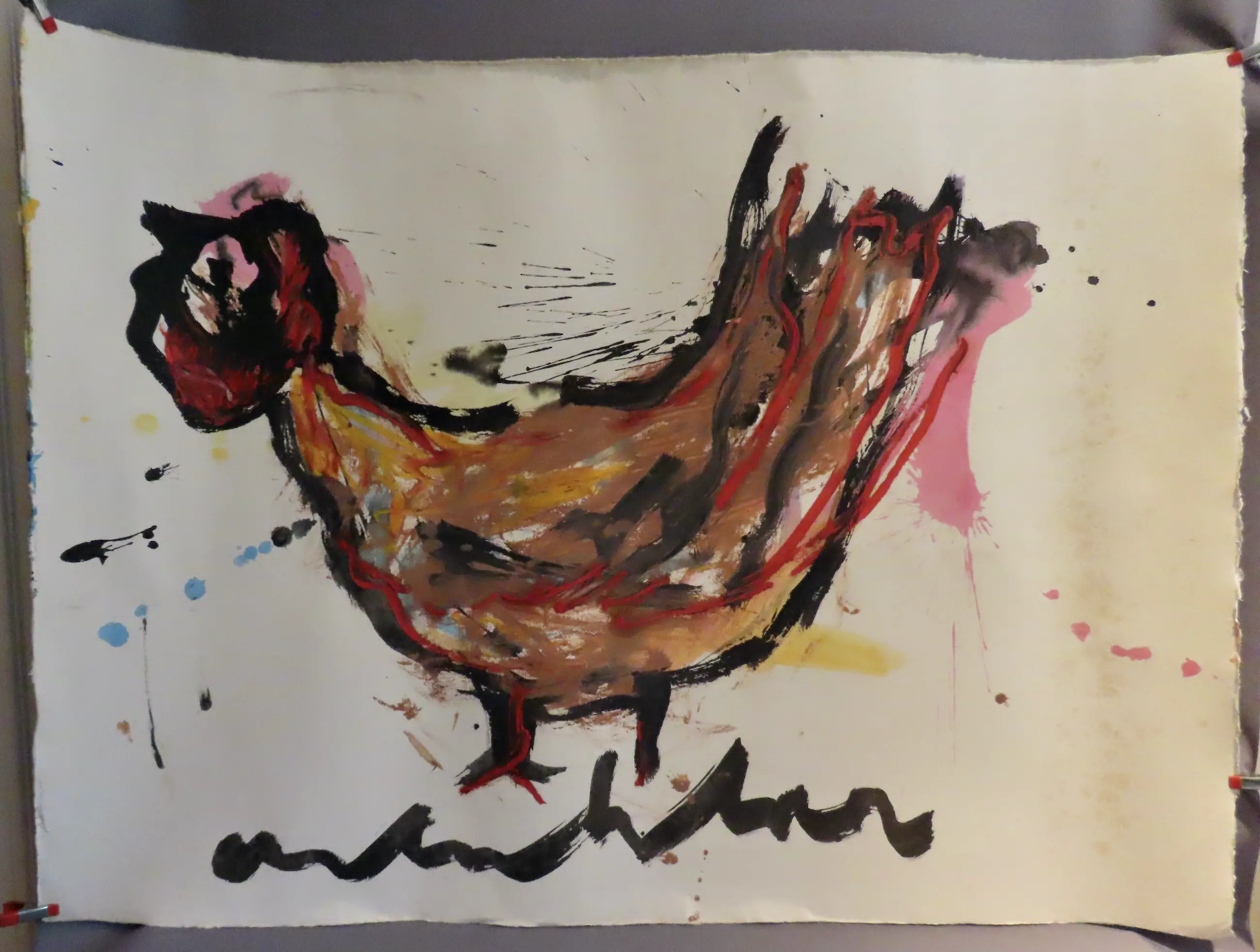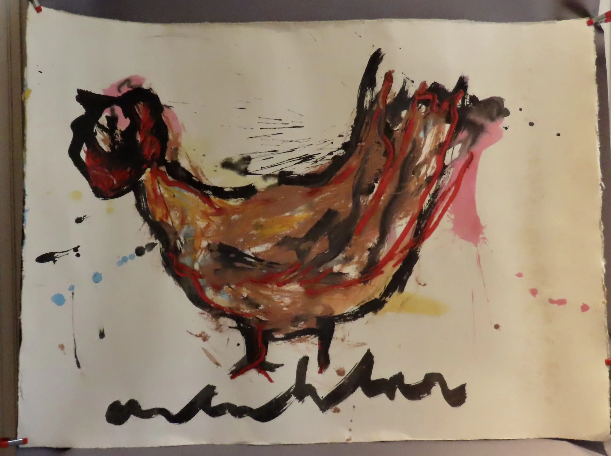 Een van de prachtige kippen die Anton Heyboer in zijn leven heeft geschilderd maar dan wel een hele grote, in sterke uitvoering en heldere kleuren op geschept papier met watermerk en handgesigneerd.