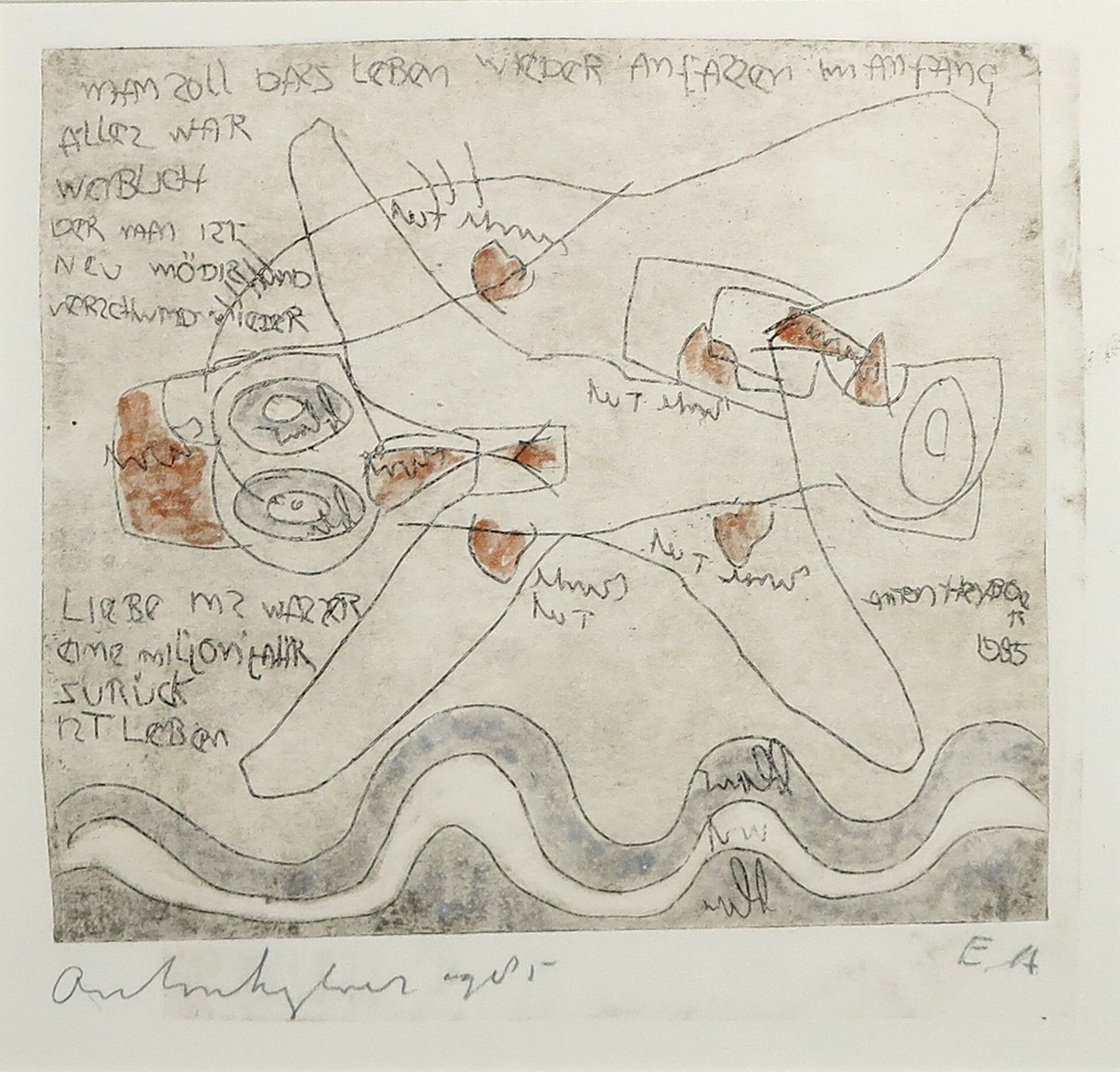 Origin: Bought in 1985 from Anton Heyboer with an original sober frame. No image is the same at Heyboer. The "epreuve d 'artiste" copy is very nicely printed and is also provided with texts in the image. Texts that can be read on the etching plate; "mam zoll dazs leben again anfazzen im anfang", "aller war werblich der mam izt nev ......", "Liebe zu war zer eine milioniahr suruck izt leben". Furthermore, in addition to the pencil signature and date, a signature and date (1985) is etched into the etching plate. The colors are indicated in words, the colors have a meaning, just like certain symbols at Heyboer. Pick up in Hengelo or shipping within the Netherlands by courier.