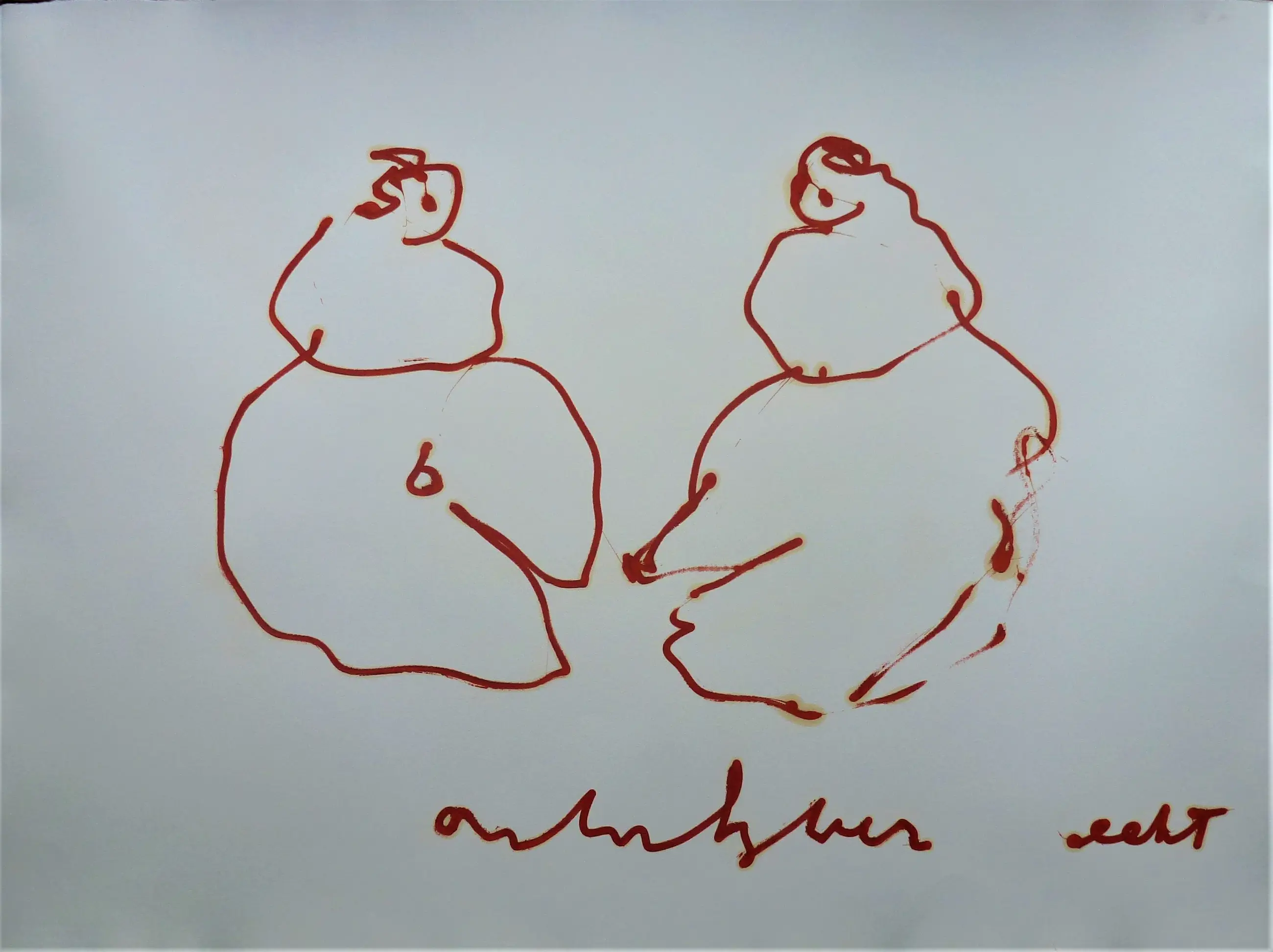 Geschilderd door Anton Heijboer in 1988 met olieverf op Hahnemühle papier . Afmetingen : 78 cm 108 cm . Voorstelling : 2 zittende figuren . Gesigneerd Anton Heyboer echt Conditie : Zo goed als nieuw . Herkomst : Gekocht in 1988 van Anton Heijboer