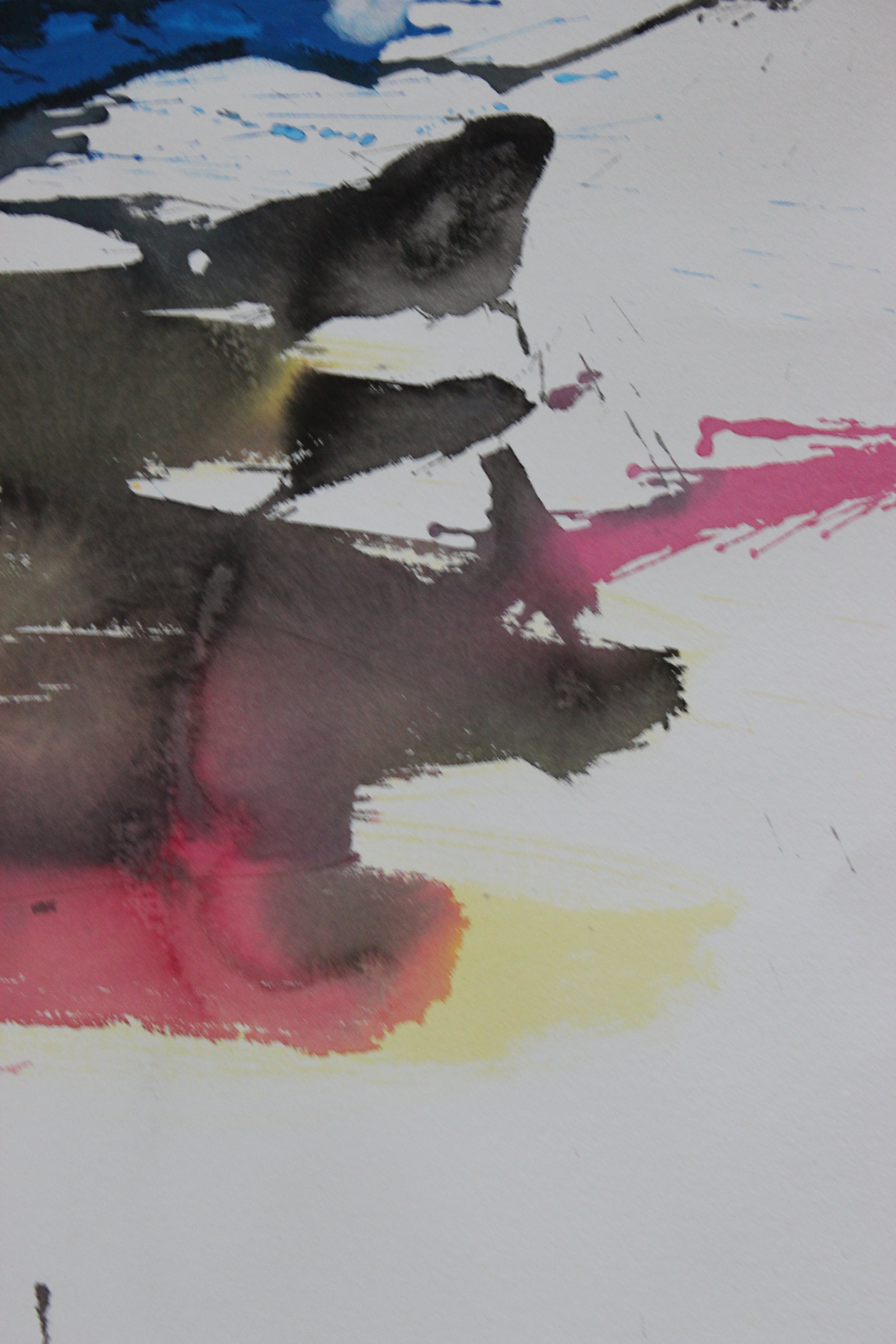Dit grote werk is van de Nederlandse kunstenaar Anton Heyboer (1924-2005). Het betreft een abstract kunstwerk in meerdere kleuren uitgevoerd in aquarelverf op geschept papier. Het werk is onderaan gesigneerd. In totaal is het blad 79 bij 107 cm groot en in zeer goede staat.
