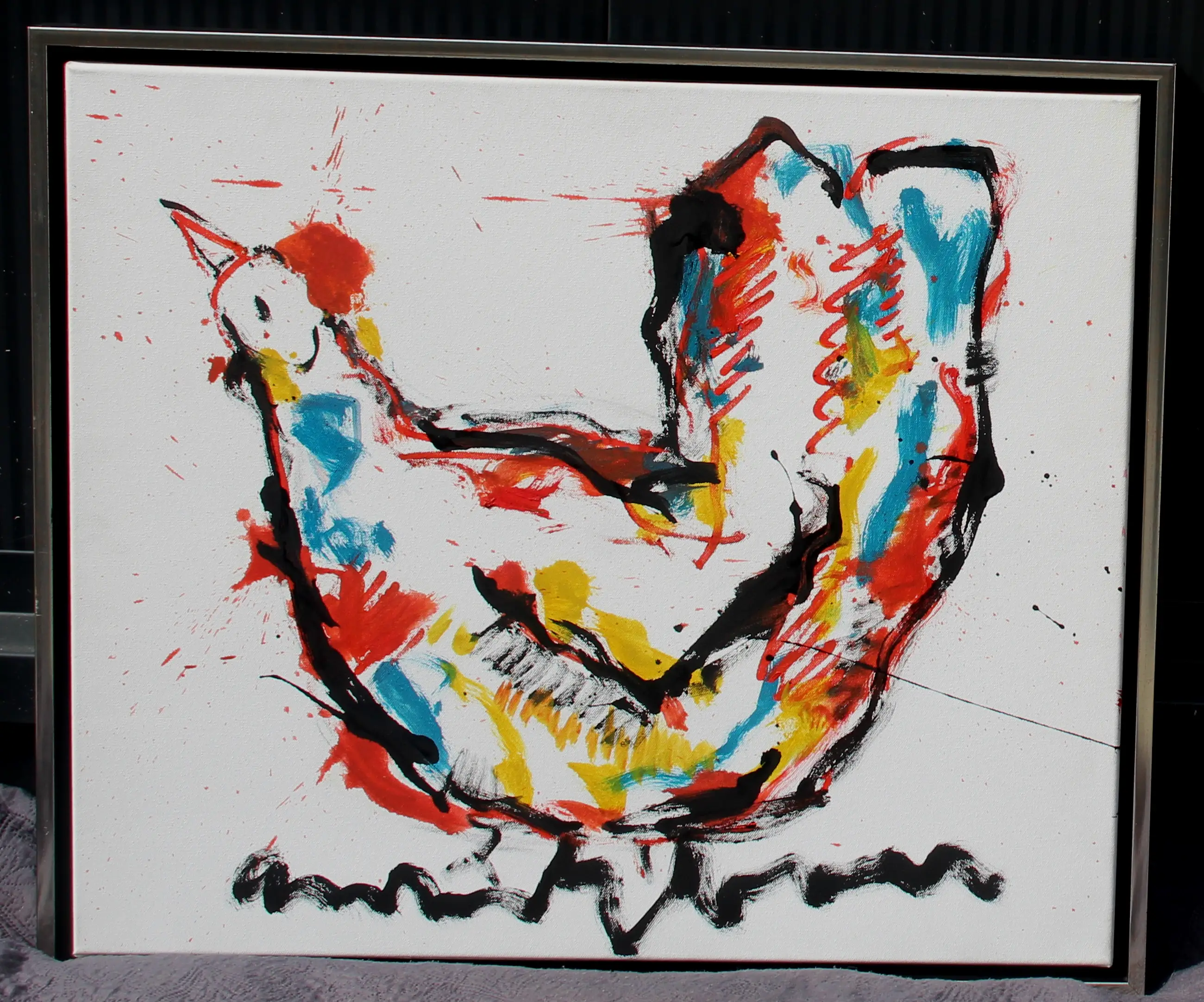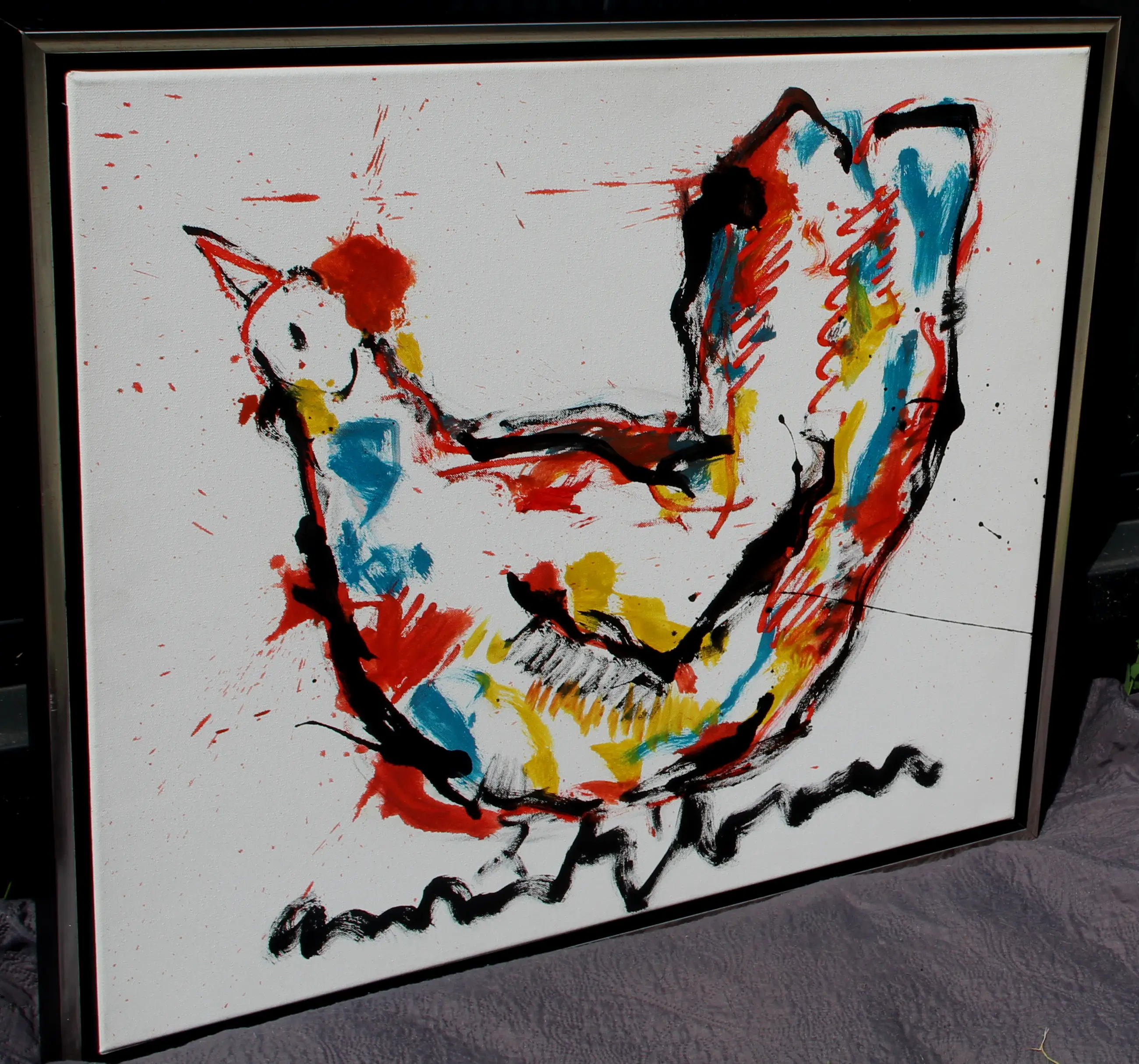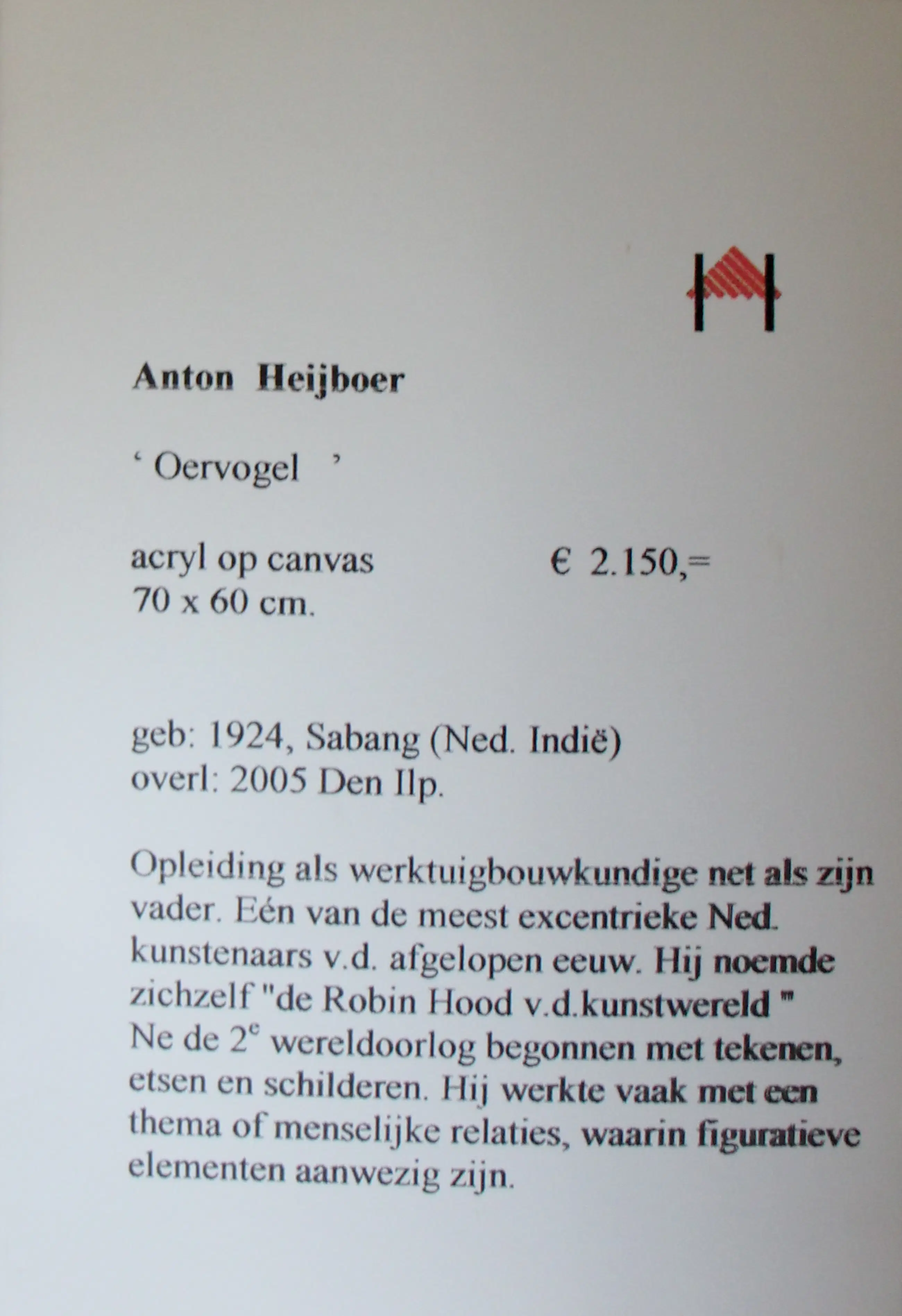 Ingelijste acryl op doek van Anton Heyboer. Jaar: 1984. Afmetingen incl lijst: H x bcm. Afmetingen voorstelling: H70 x b60cm. Het werk is, onderaan, gesigneerd door de kunstenaar. De authenticiteit van het aangeboden werk wordt volledig gegarandeerd. Een certificaat van echtheid kan, op aanvraag, worden gemaild. De factuur van Hoeve Rijlaarsdam is bevestigd op de achterzijde. Aankoopprijs: 2.100 euro.