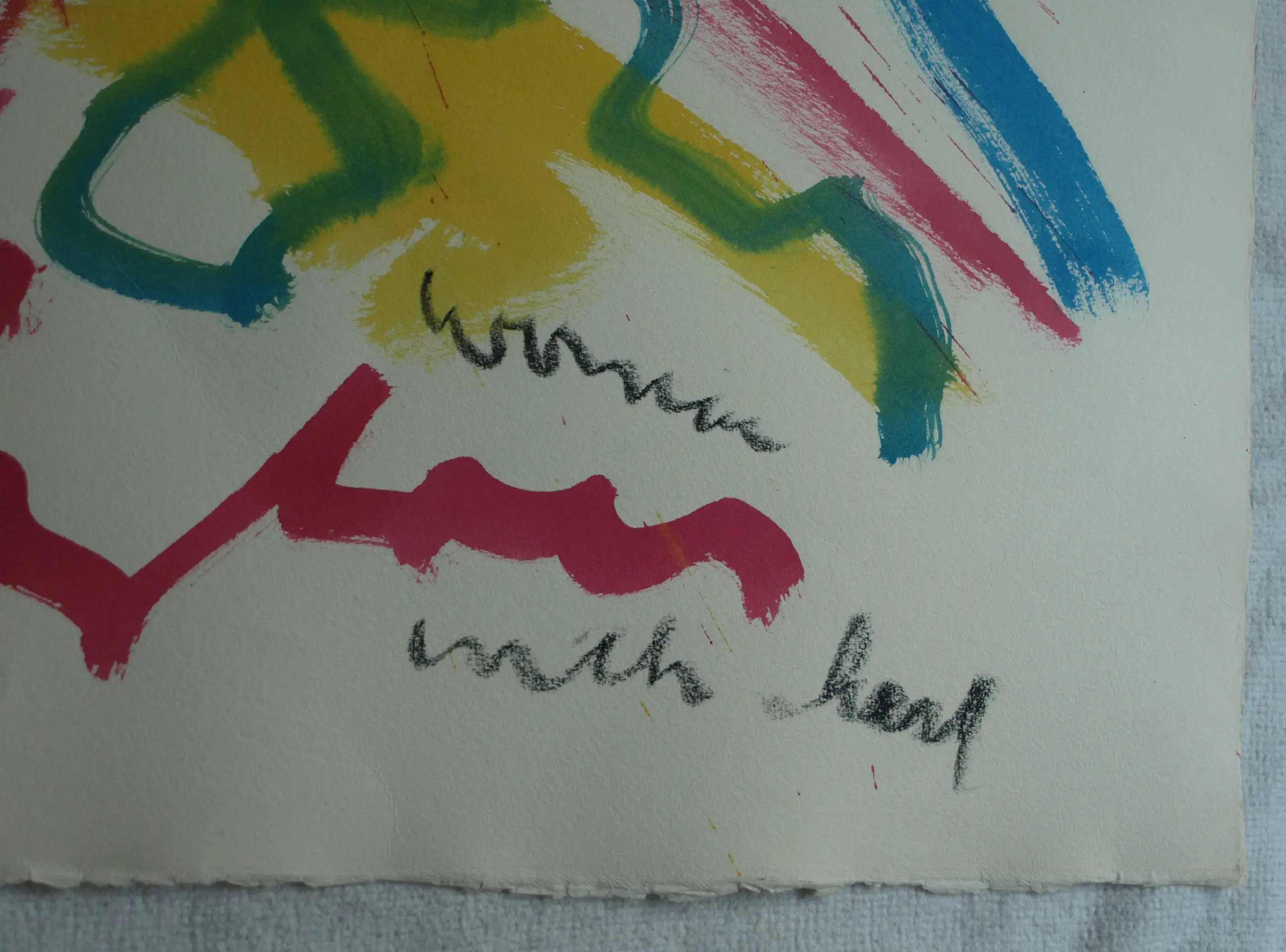 Een groot werk van de Nederlandse kunstenaar Anton Heyboer (1924-2005). -Acrylverf op geschept ‘Hahnemühle’-papier. -Gesigneerd middenonder. -Niet ingelijst en ook nooit ingelijst geweest. -Afmetingen: Blad, 107 x 79 cm. -Herkomst: Uit een nalatenschap. Het werk is destijds verkregen via de kunstenaar. -Conditie: In goede staat. Het papier heeft lichte kreukjes aan de randen. Zie ook de foto’s voor een eigen indruk.