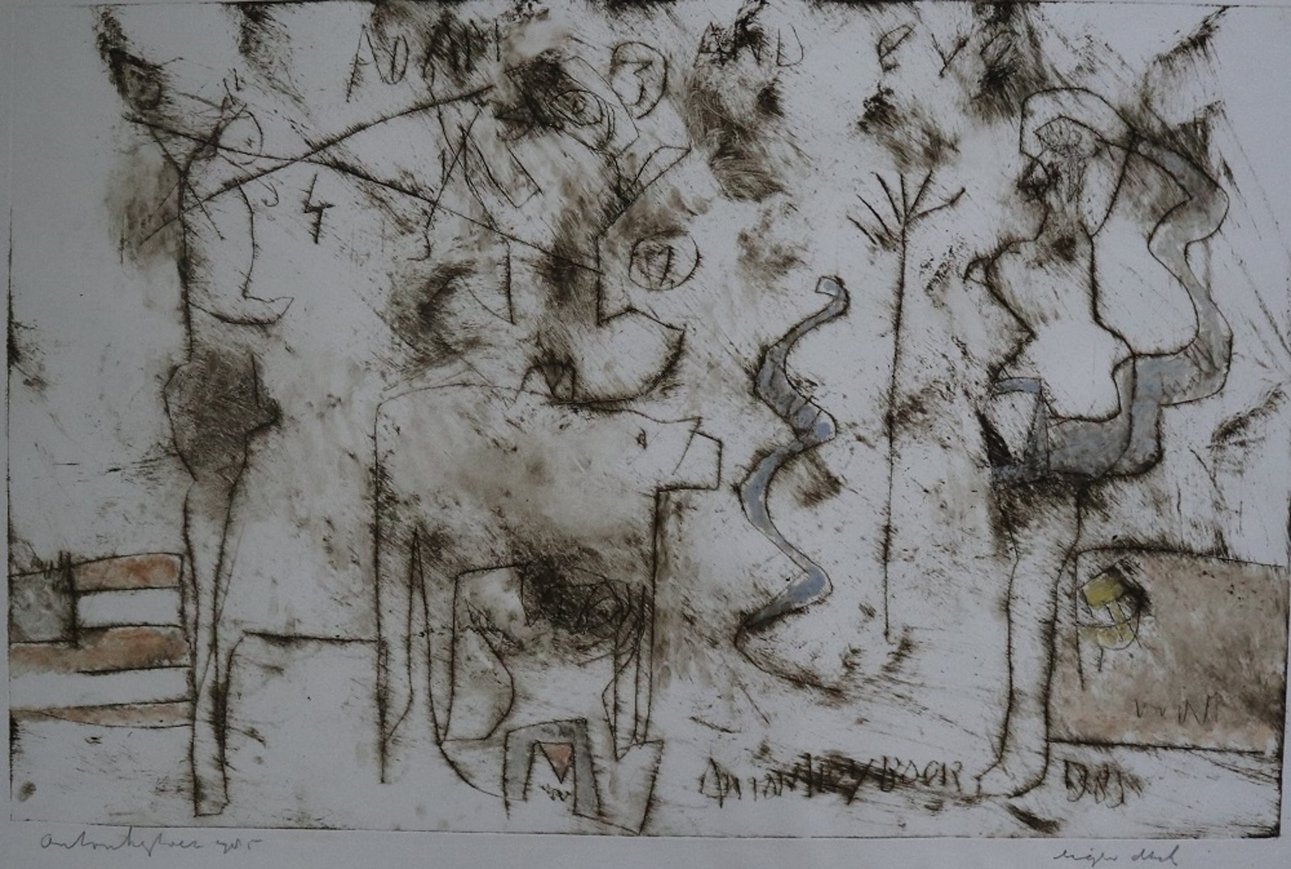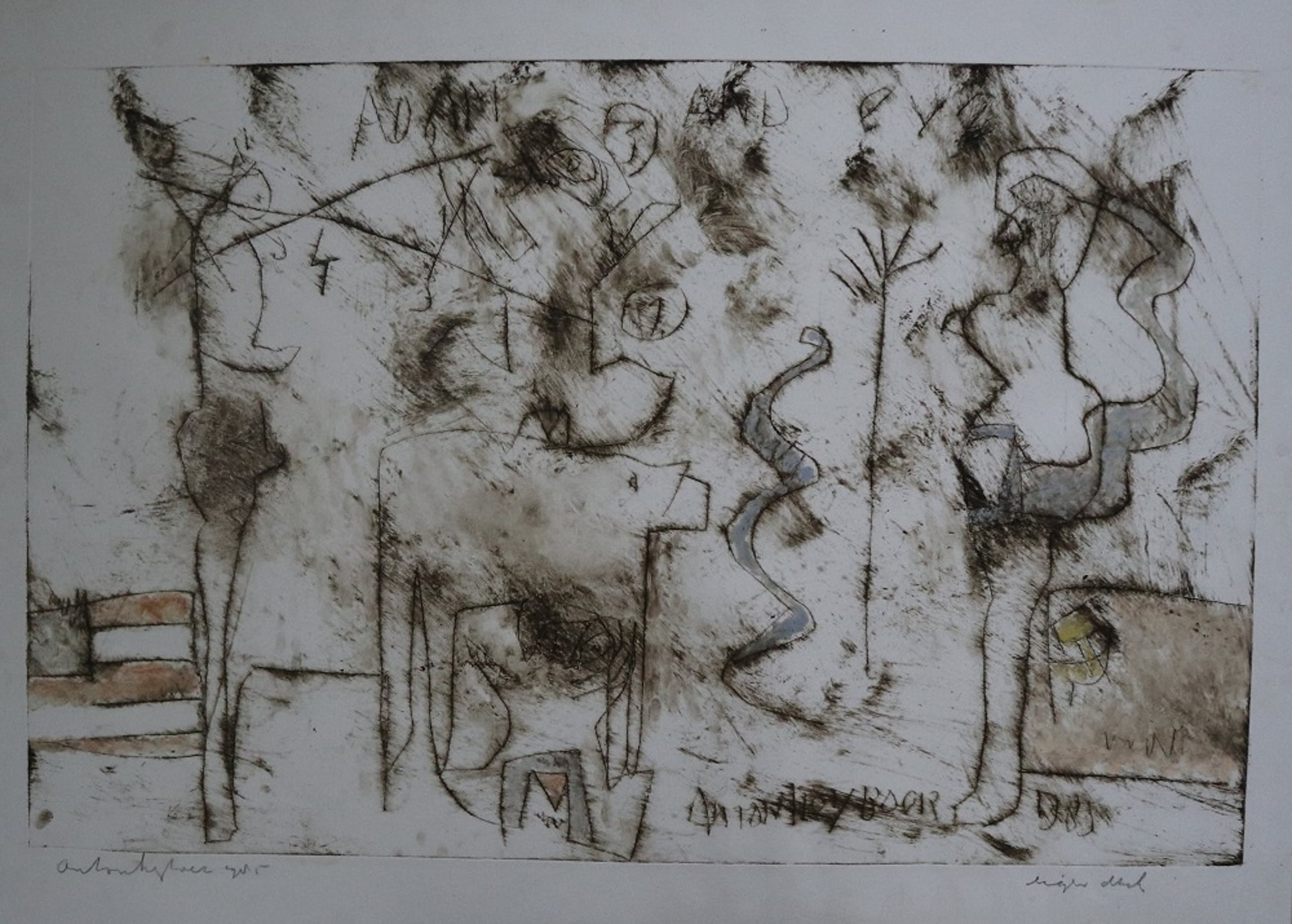 Kleurenets, in potlood gesigneerd en gedateerd 1985 links onder. Titel: Adam & Eva, in de ets geschreven. Nogmaals gesigneerd in de ets. Eigen druk in potlood rechts onder.