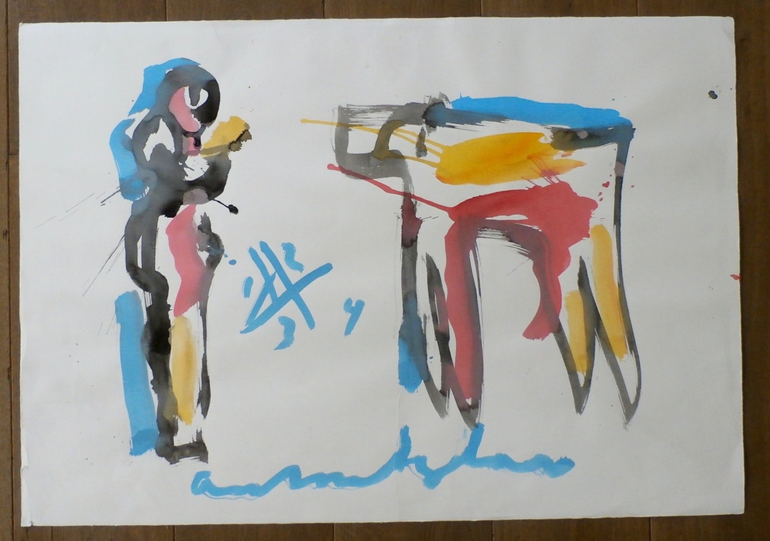 Aquarel van Anton Heyboer. Titel: Mens en Oerdier/Systeem. Afmetingen werk: H70 x b100 cm.