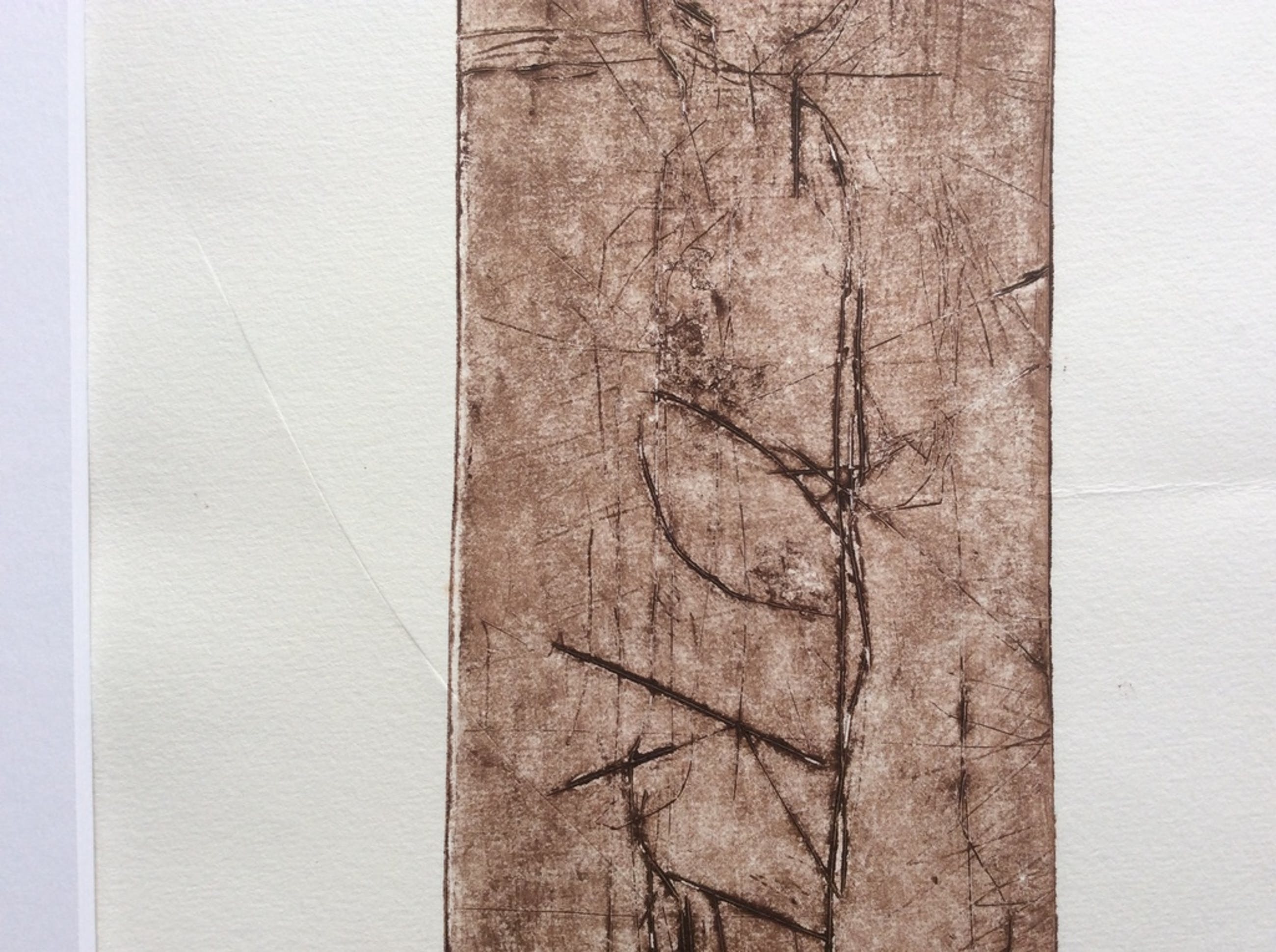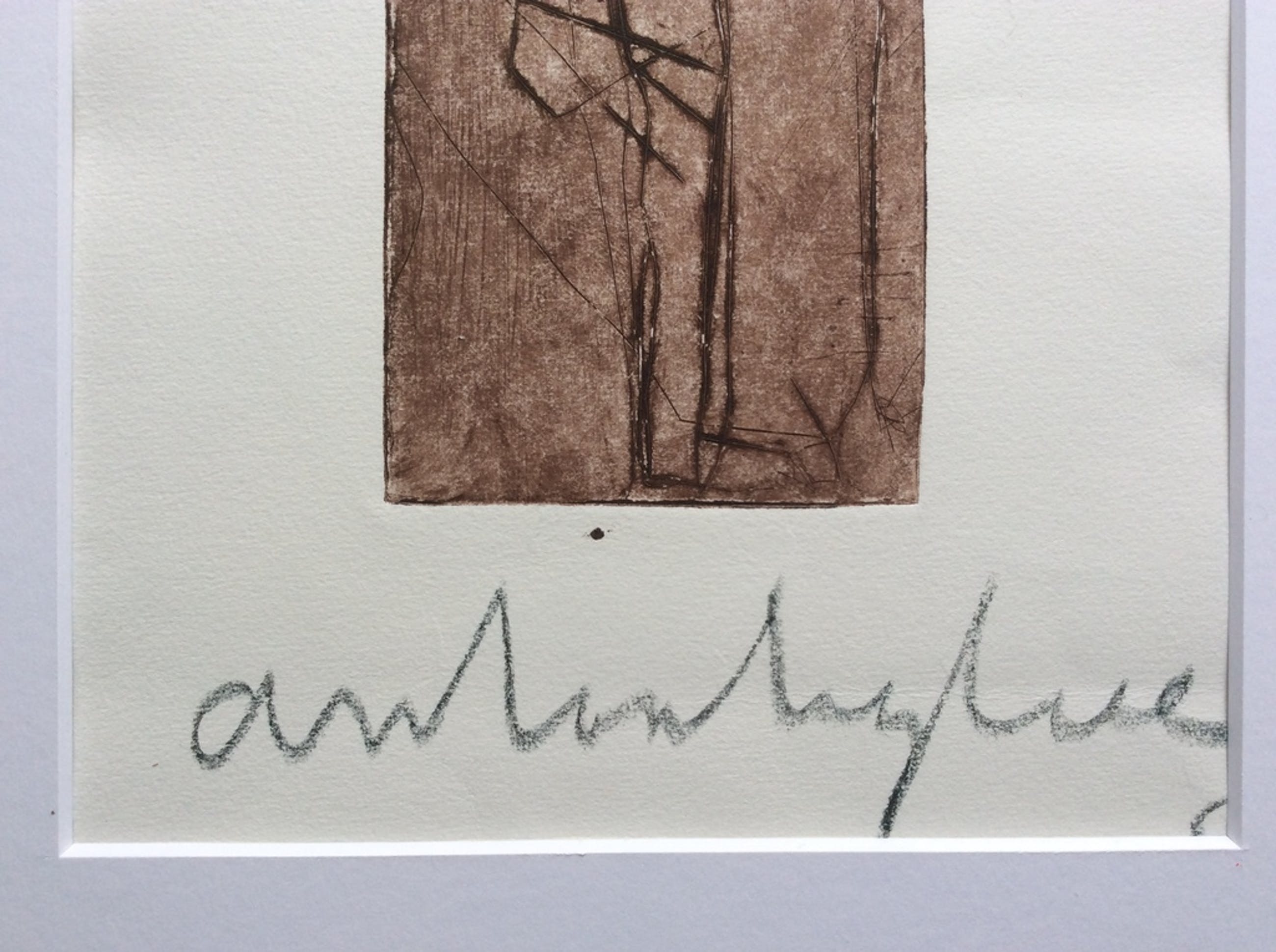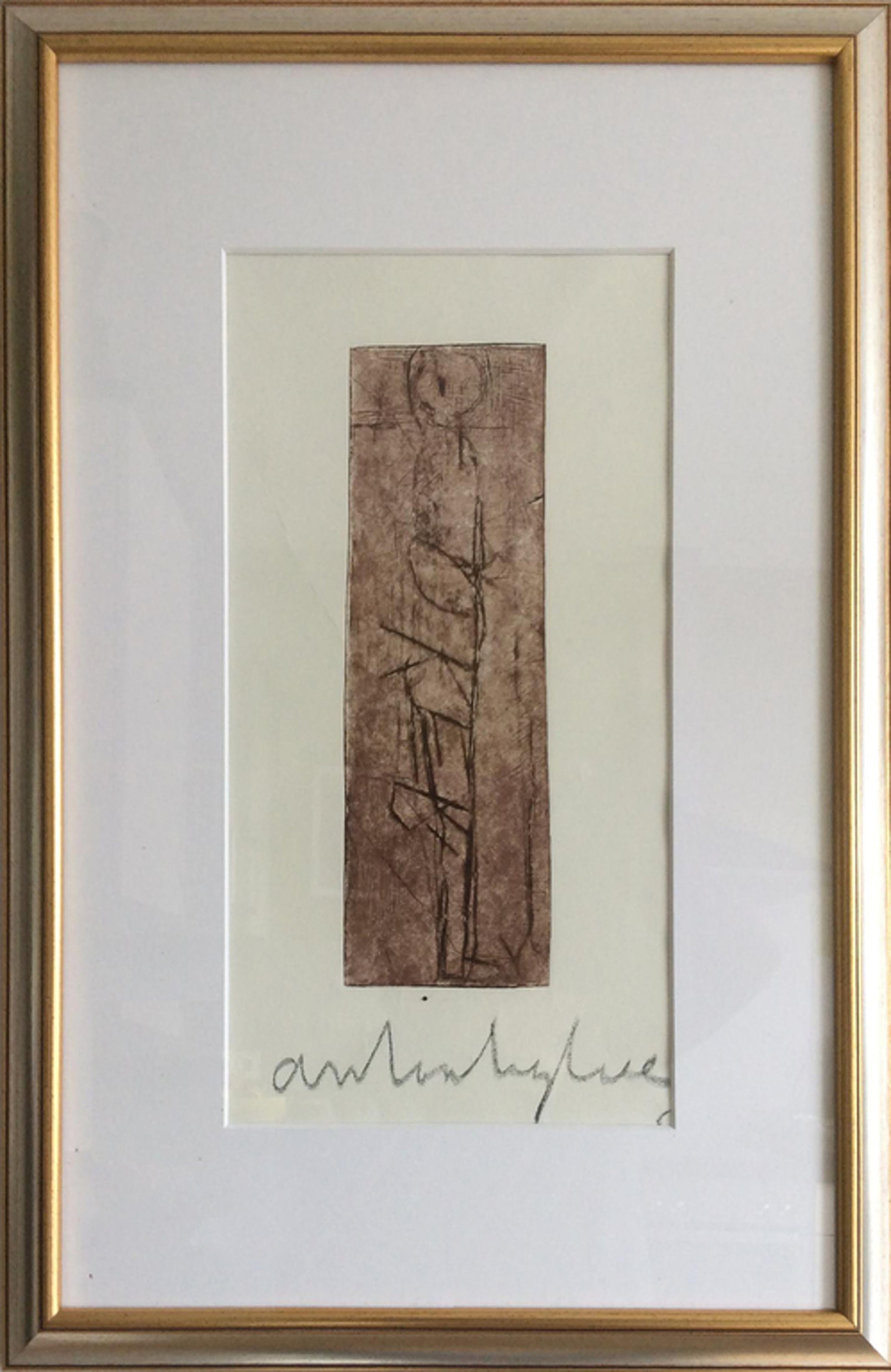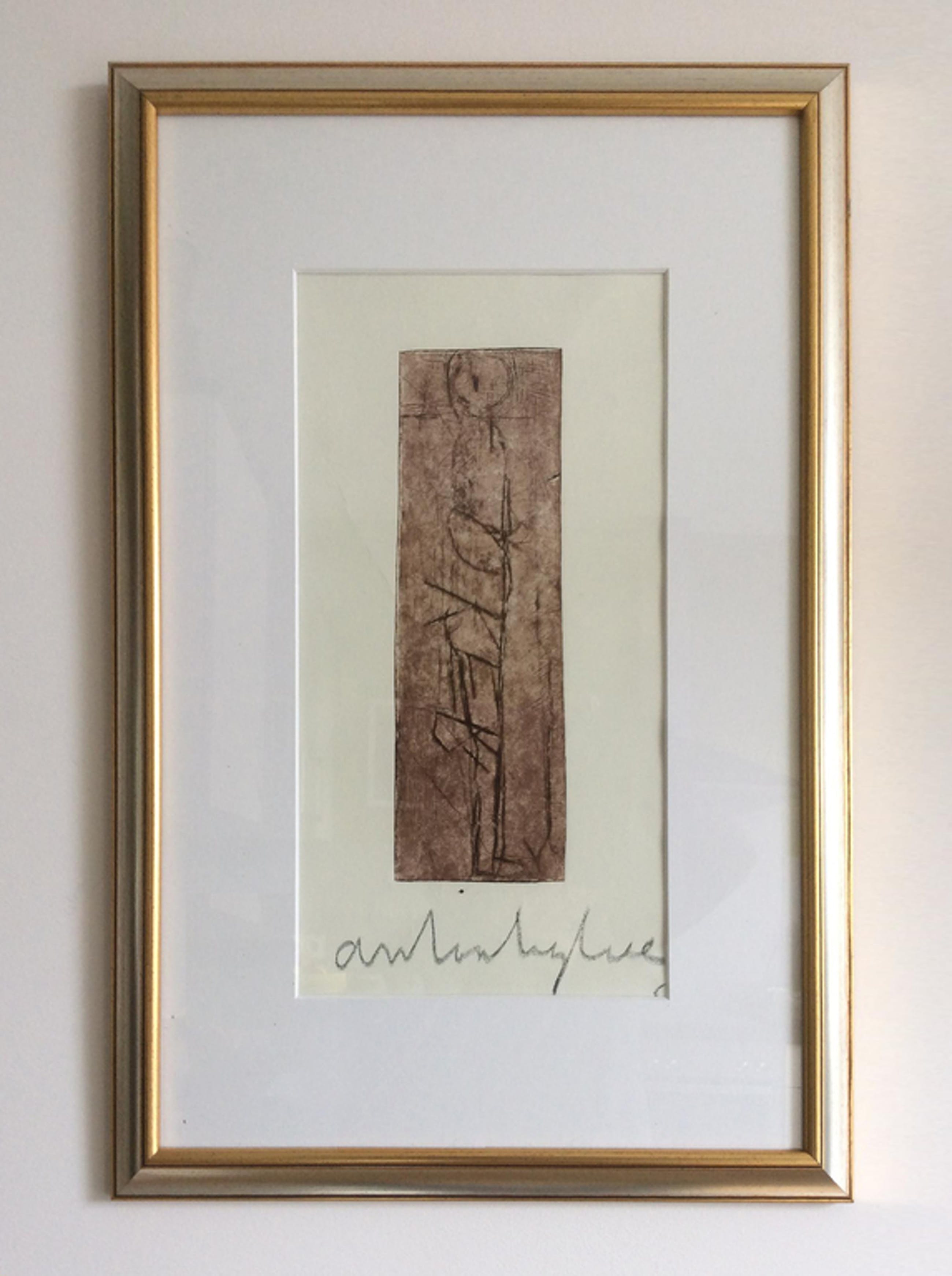 Bijzondere ets van Anton Heyboer uit 1987: Staande Man. Formaat incl. 45 x 64 cm, ets grootte 10 x 31 cm. Potlood gesigneerd en '87 gedateerd onder de ets. In het papier enkele lichte niet storende vouwen. In fraaie houten vergulde lijst.