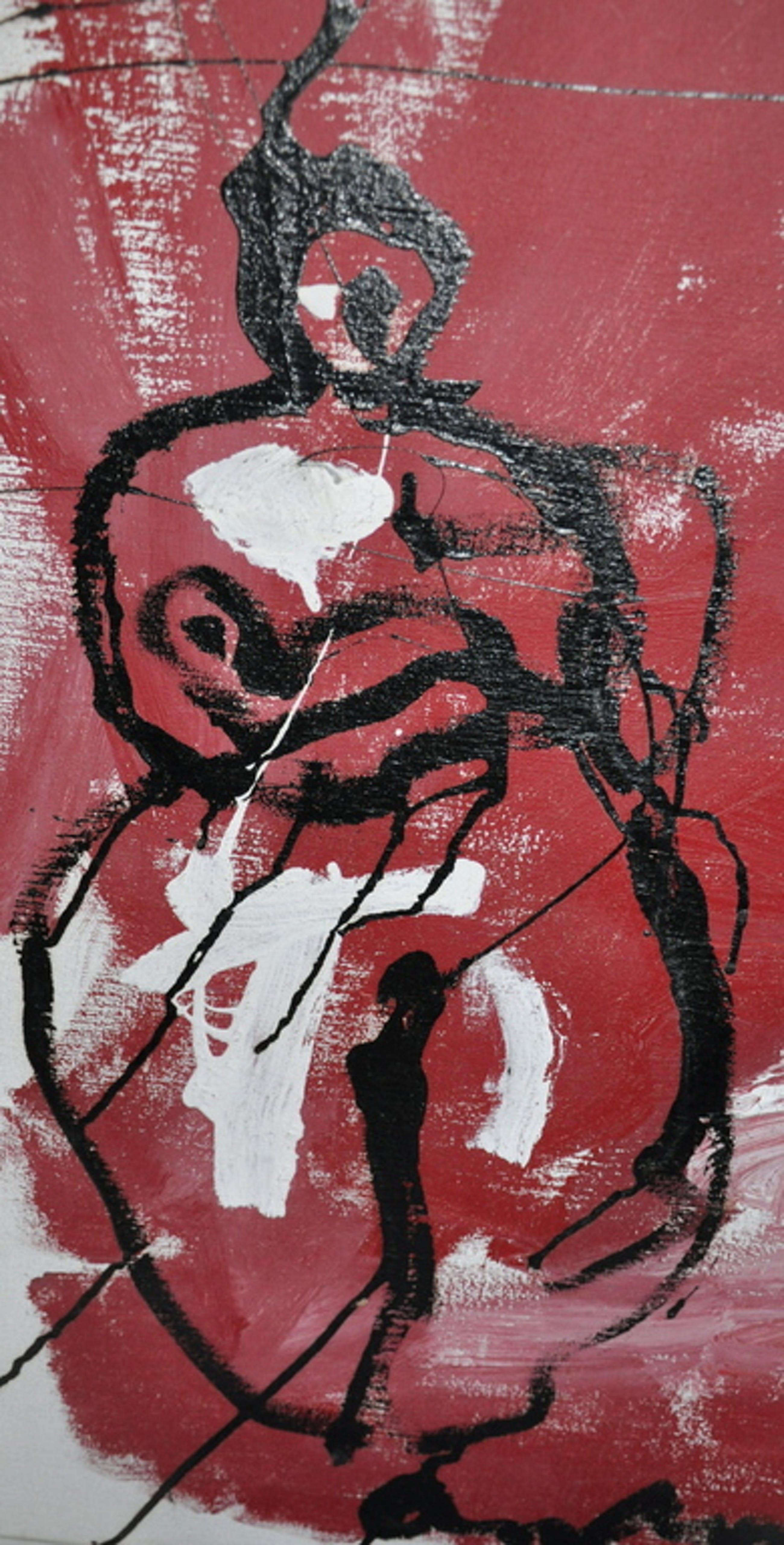 Doek met de 3 symbolen van de kunstenaar t.w. motherhood, christ en animal.