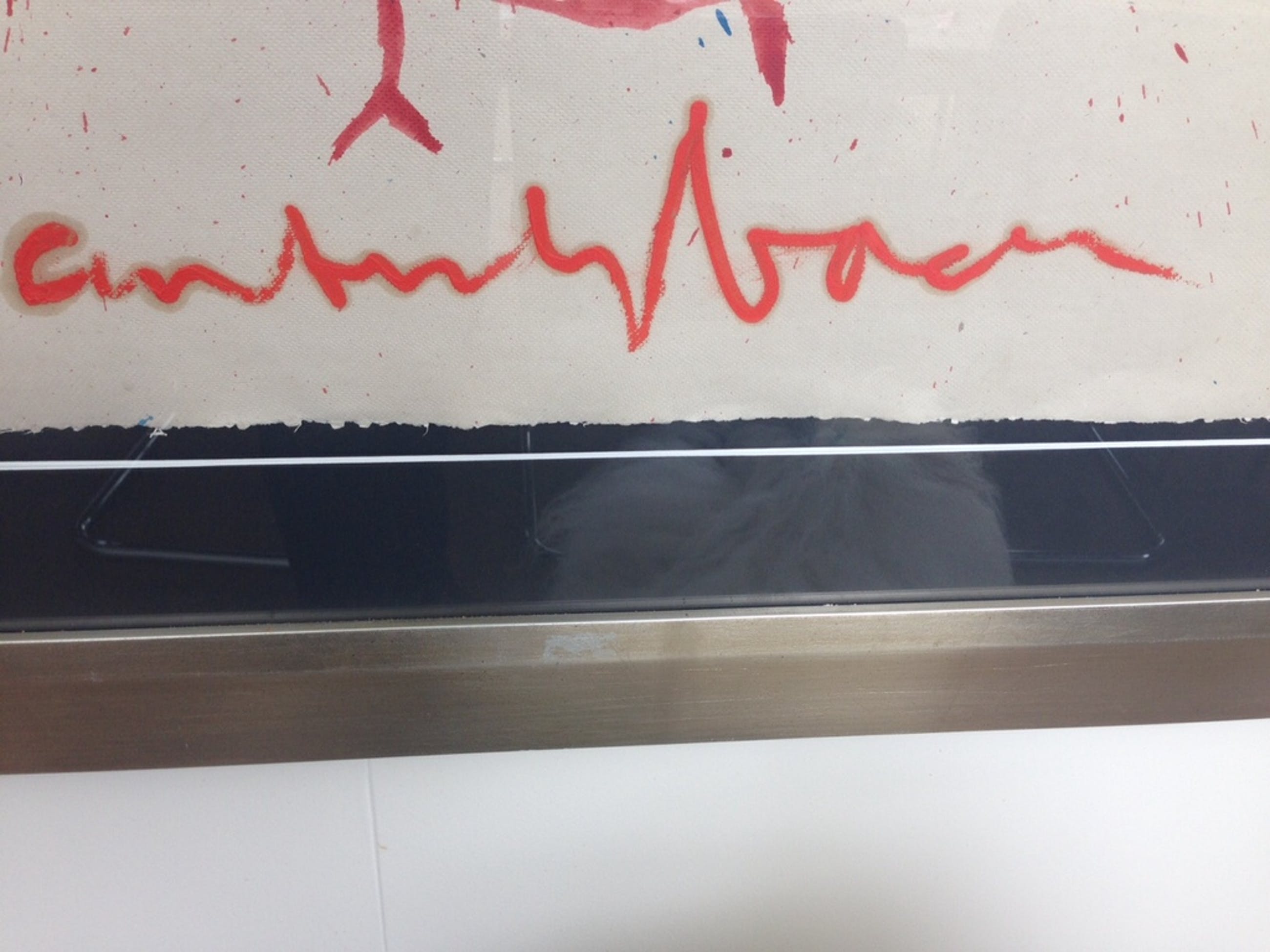 Mooi, zwevend ingelijst achter glas, in zwart passe-partout met witte bies.
