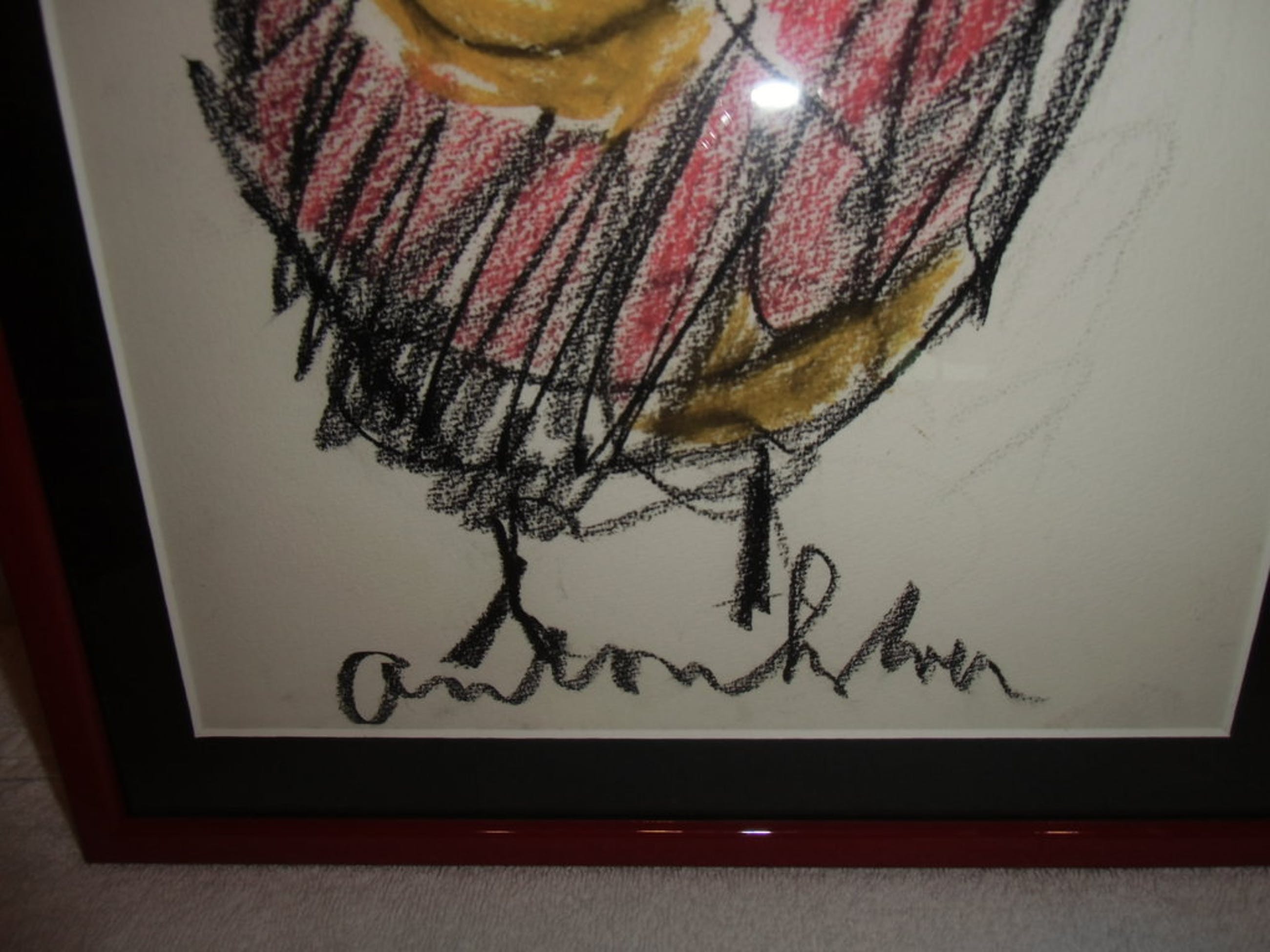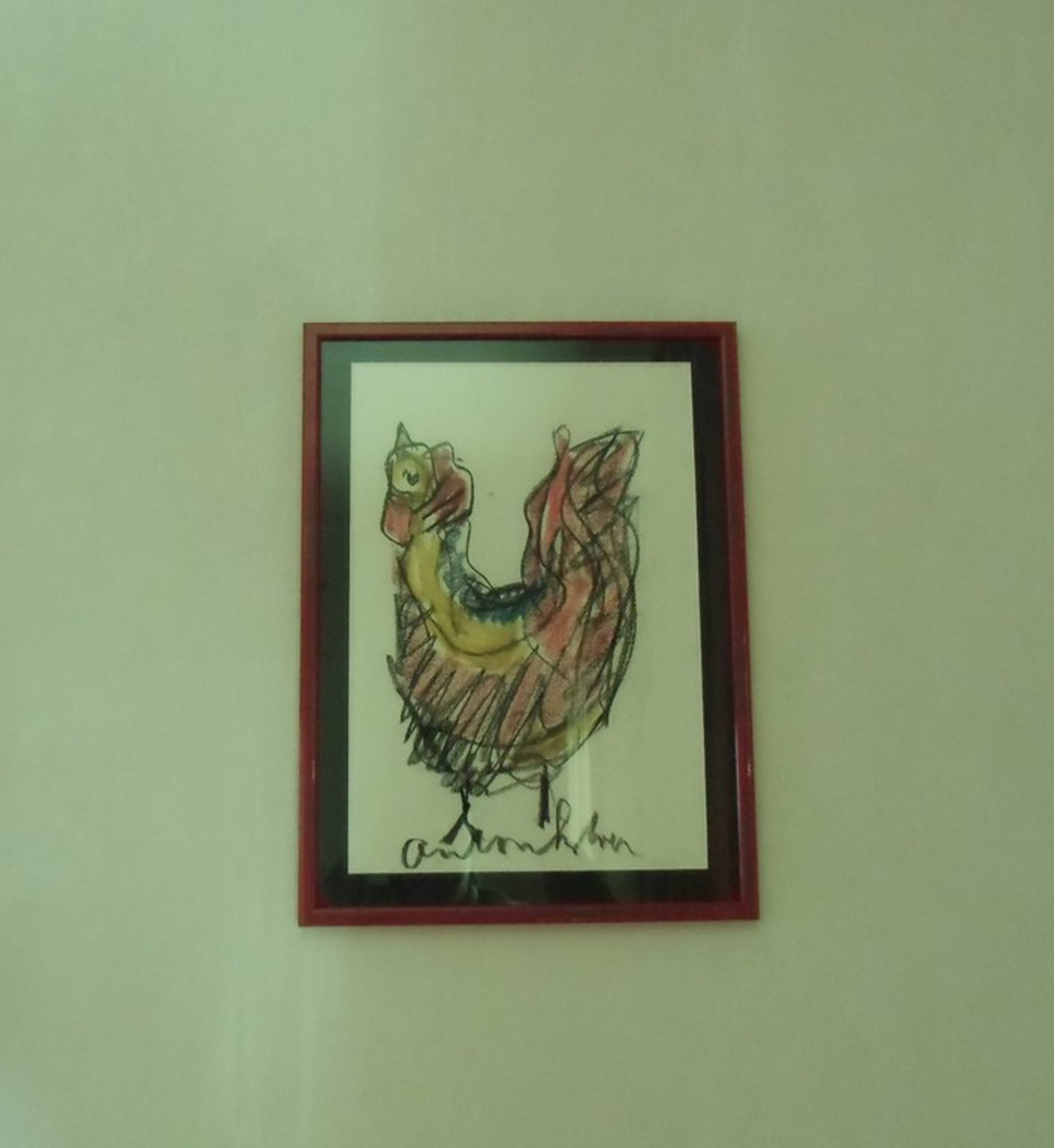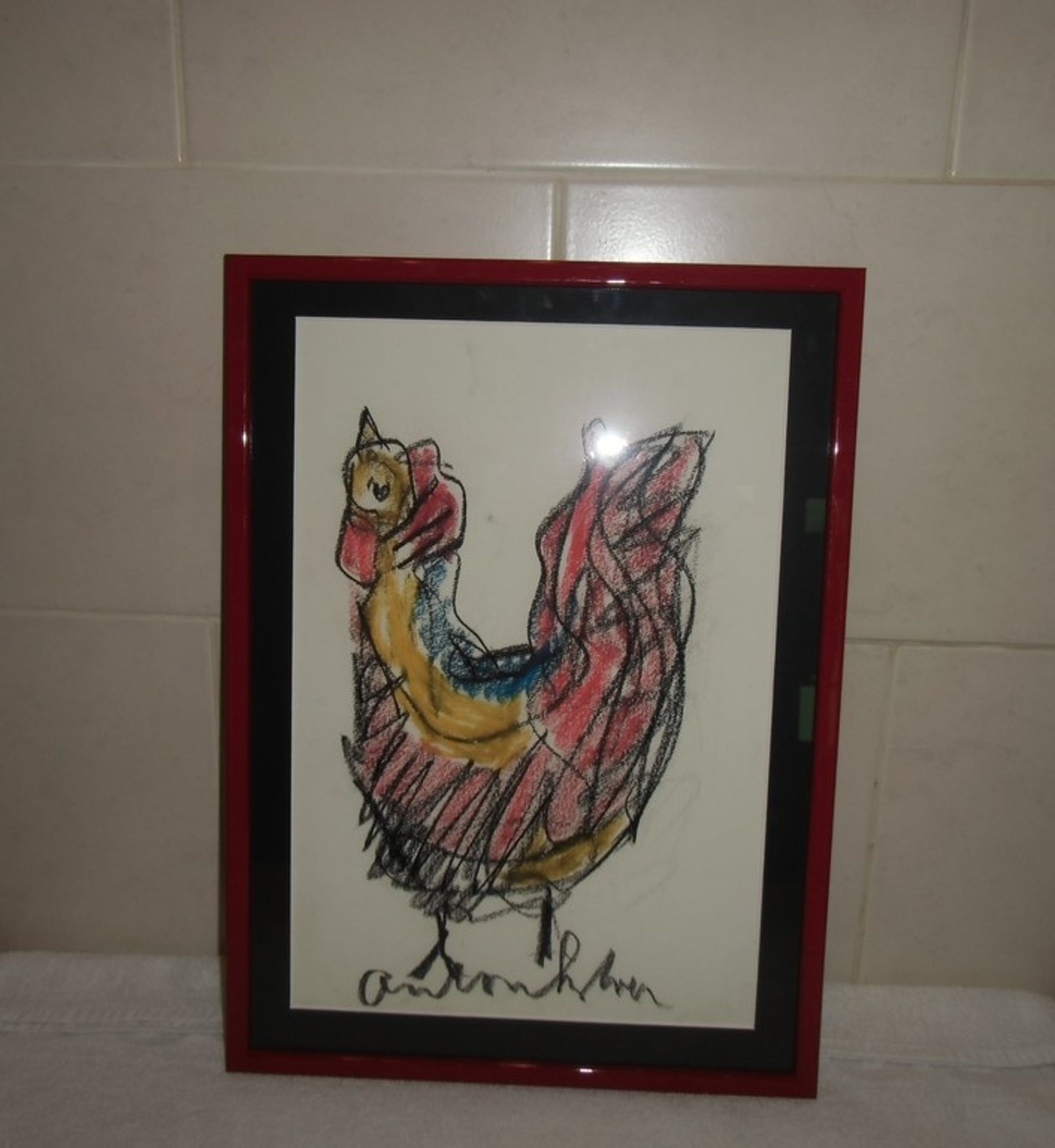 Mooie getekende kip gemaakt met vetstiften (wasco). Afmeting tekening 39cm. x 26cm.. Ingelijst 46cm. x 34cm.