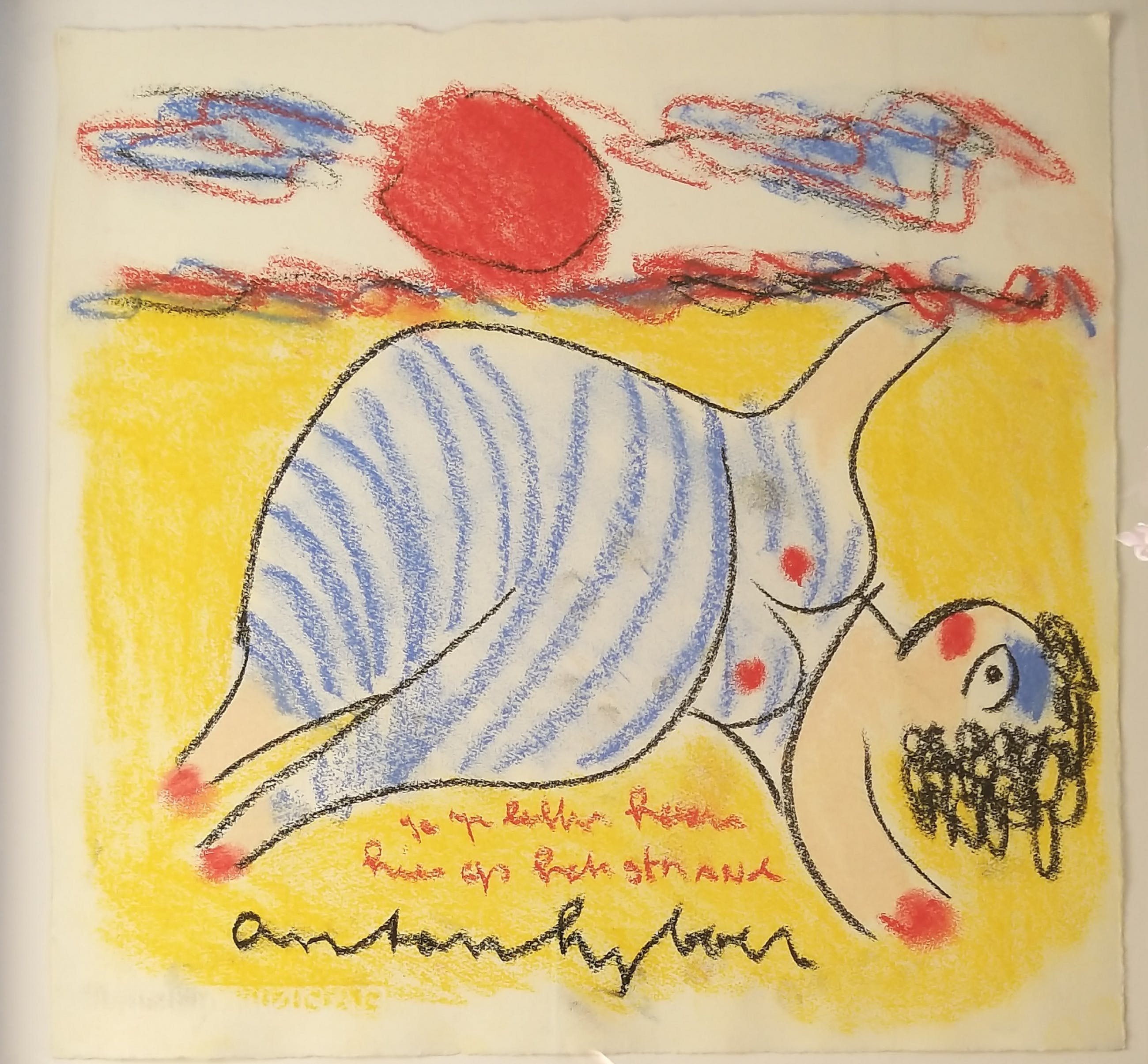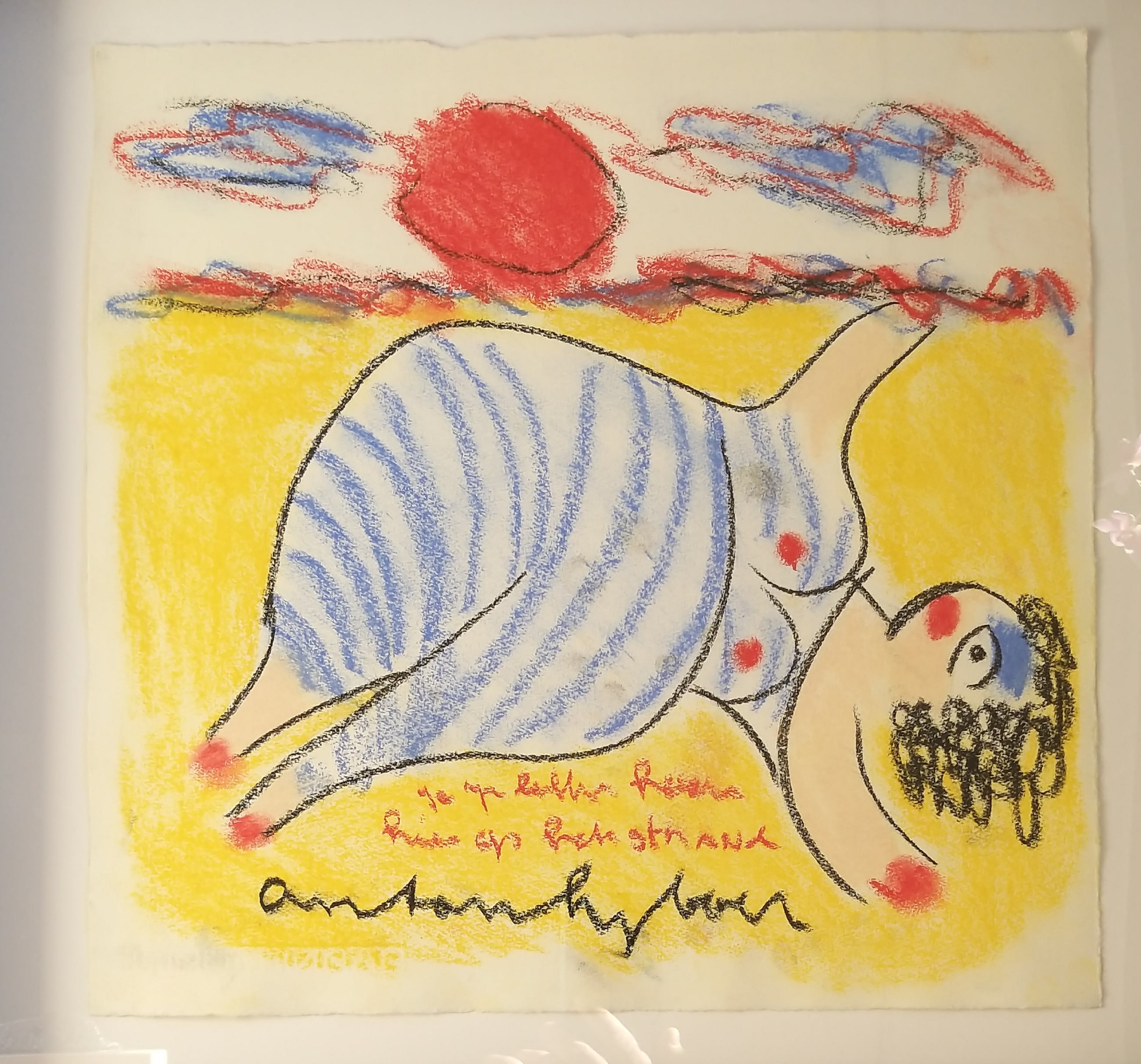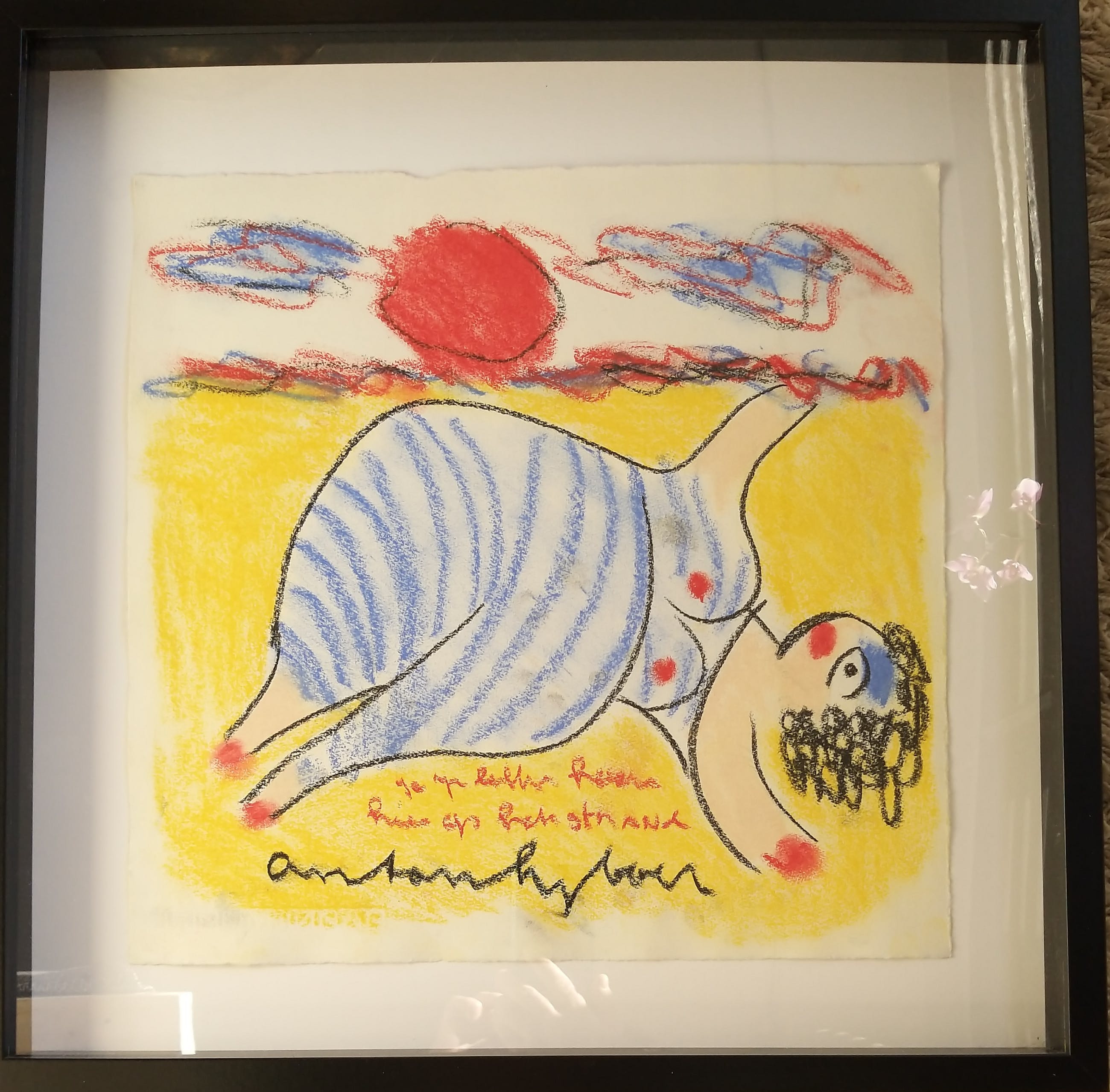 Anton Heyboer Baddame op het strandMidden onder gesigneerd en met de tekst 1e regel .................2e regel : Huis op het strand Ingelijst met diepte, passepartout ligt achterin de lijst Afmeting +/- 40x30 cm