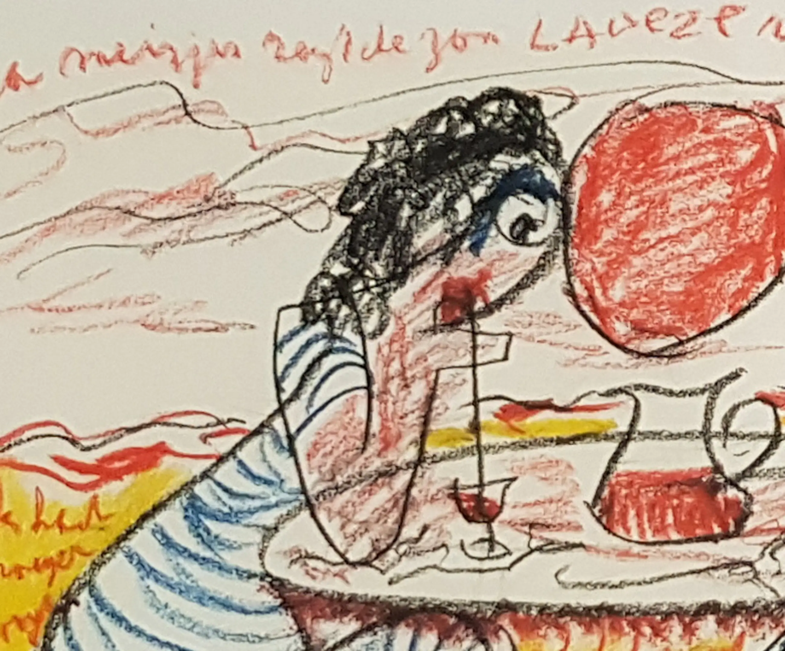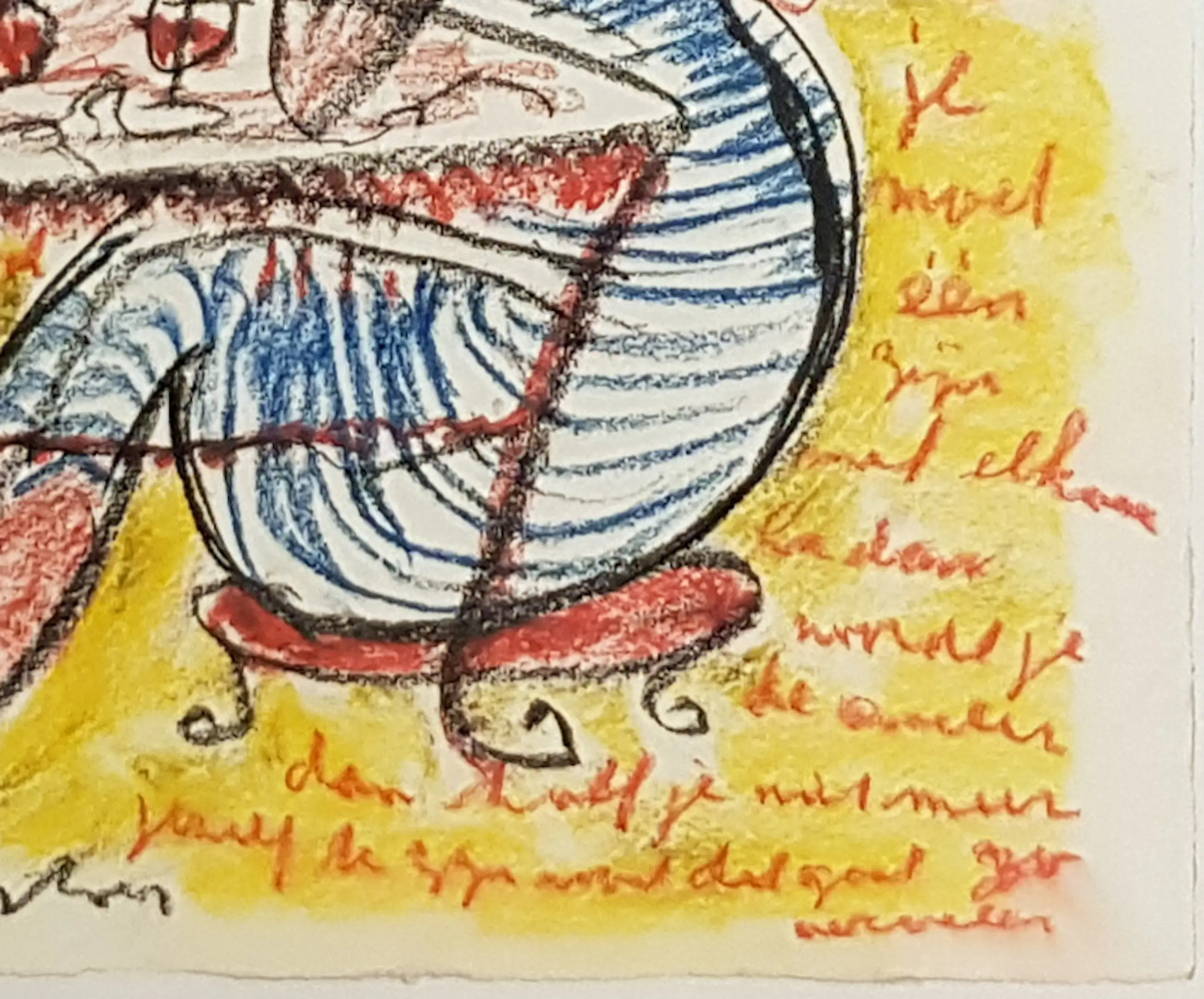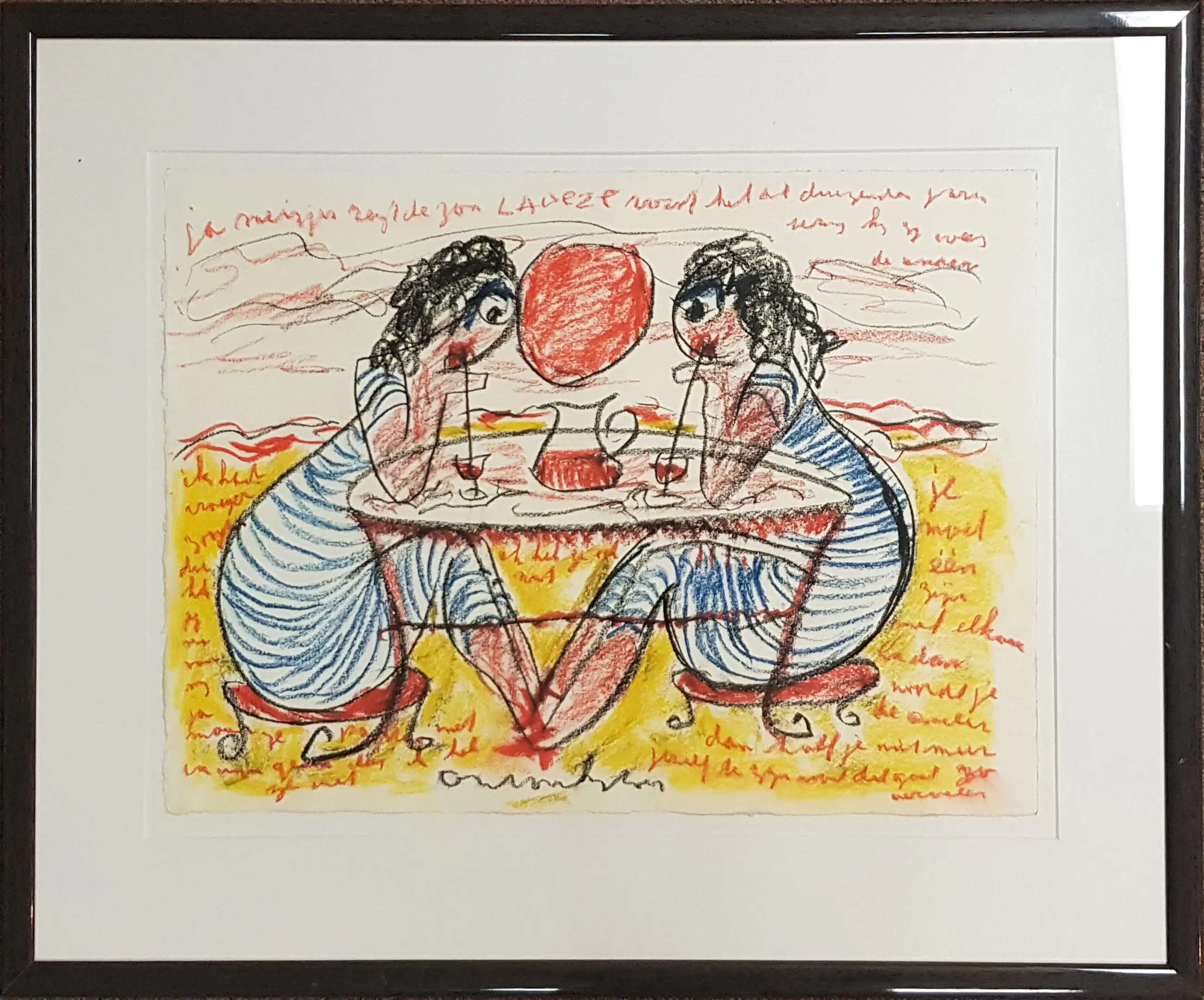 "Meisjes drinken ranja" is een prachtige gouachetekening van Anton Heyboer. Dit unieke kunstwerk is gemaakt op handgeschept papier en rijkelijk geïllustreerd met teksten. Het papier heeft een afmeting van 53 x 50 cm, terwijl de lijst een afmeting heeft van 73 x 62 cm.