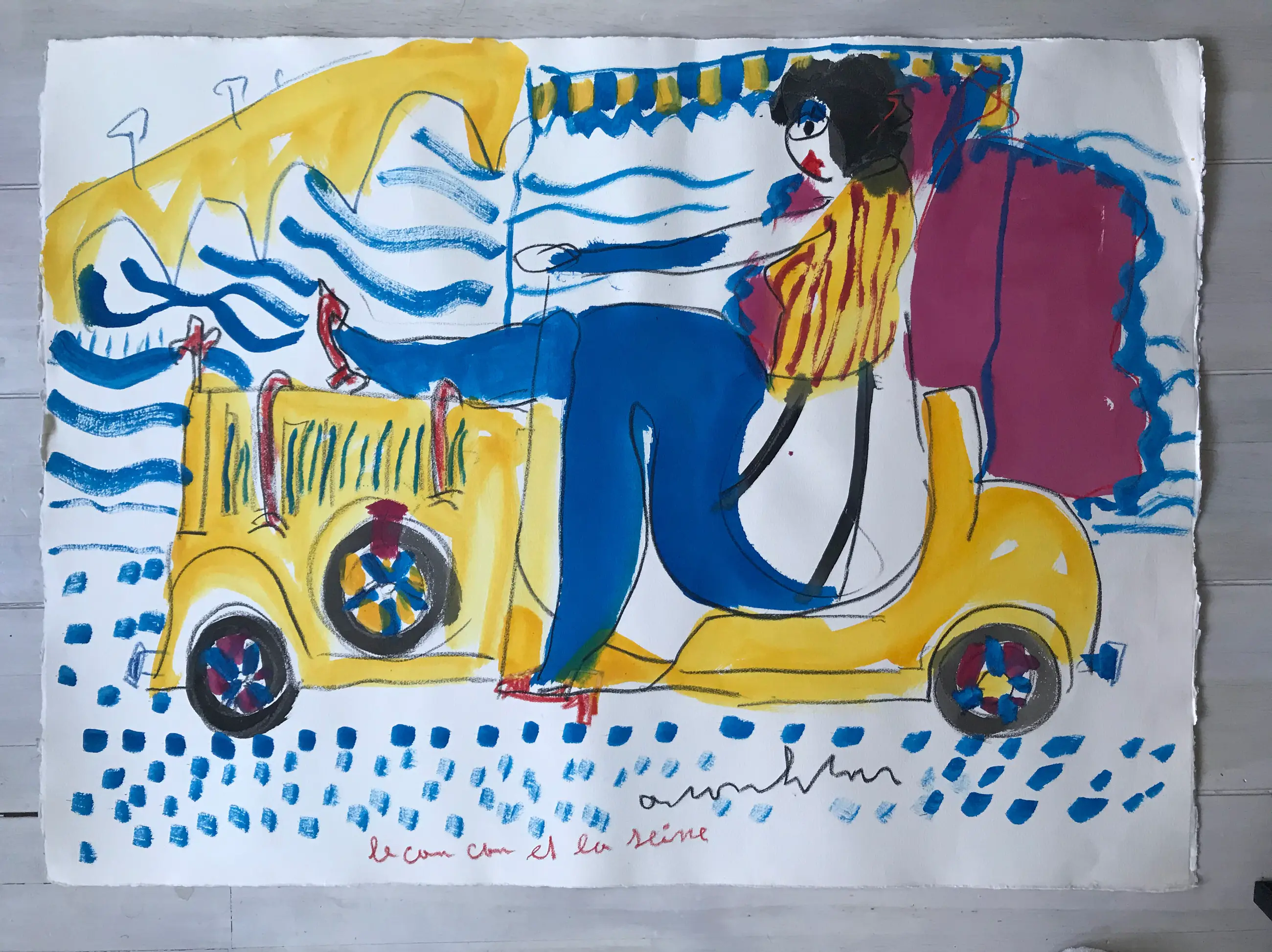 Cancan danseres in een auto met teksten Zeer bijzonder groot kunstwerk Afmeting is plus minus Gesigneerd midden onder