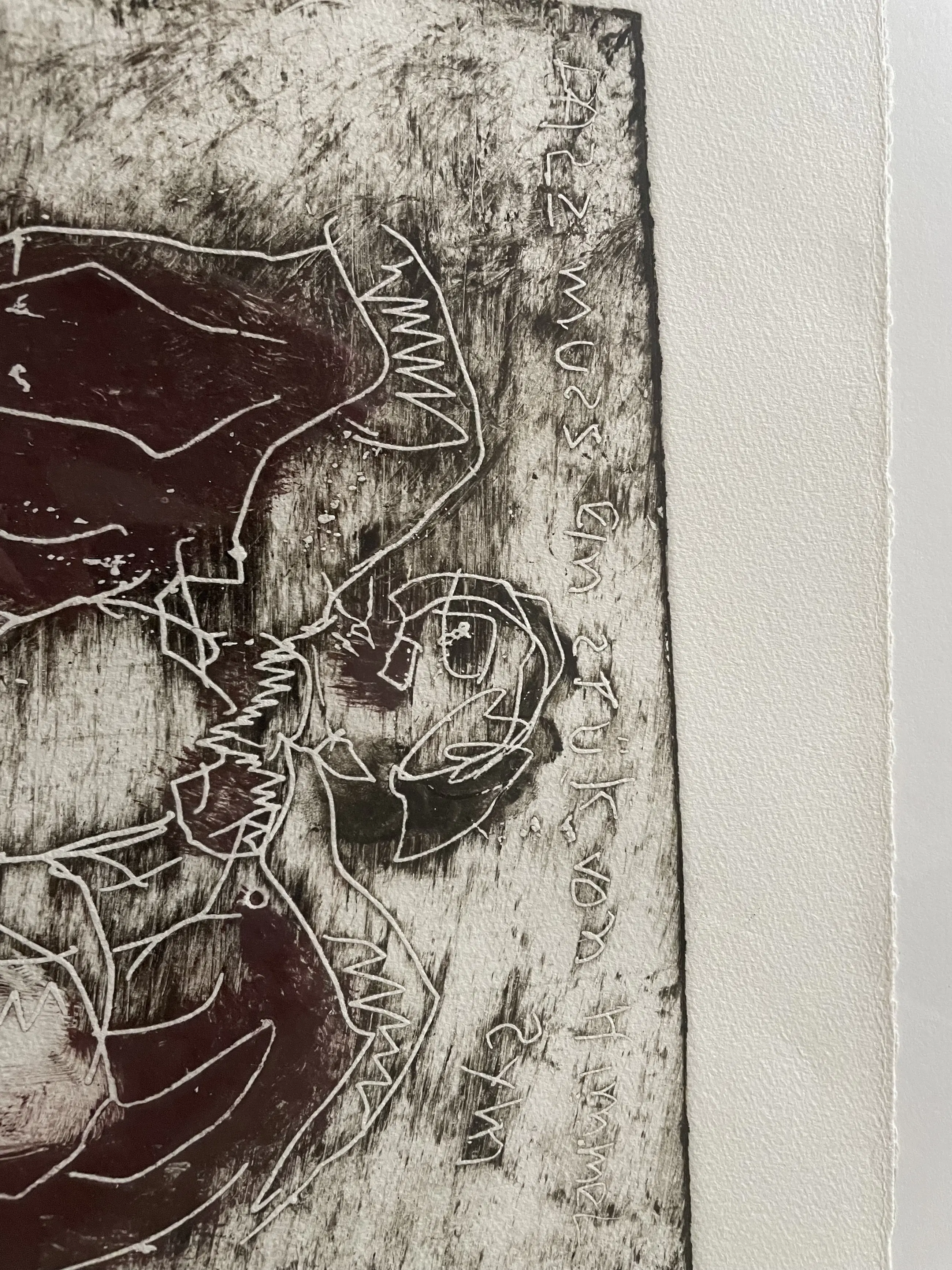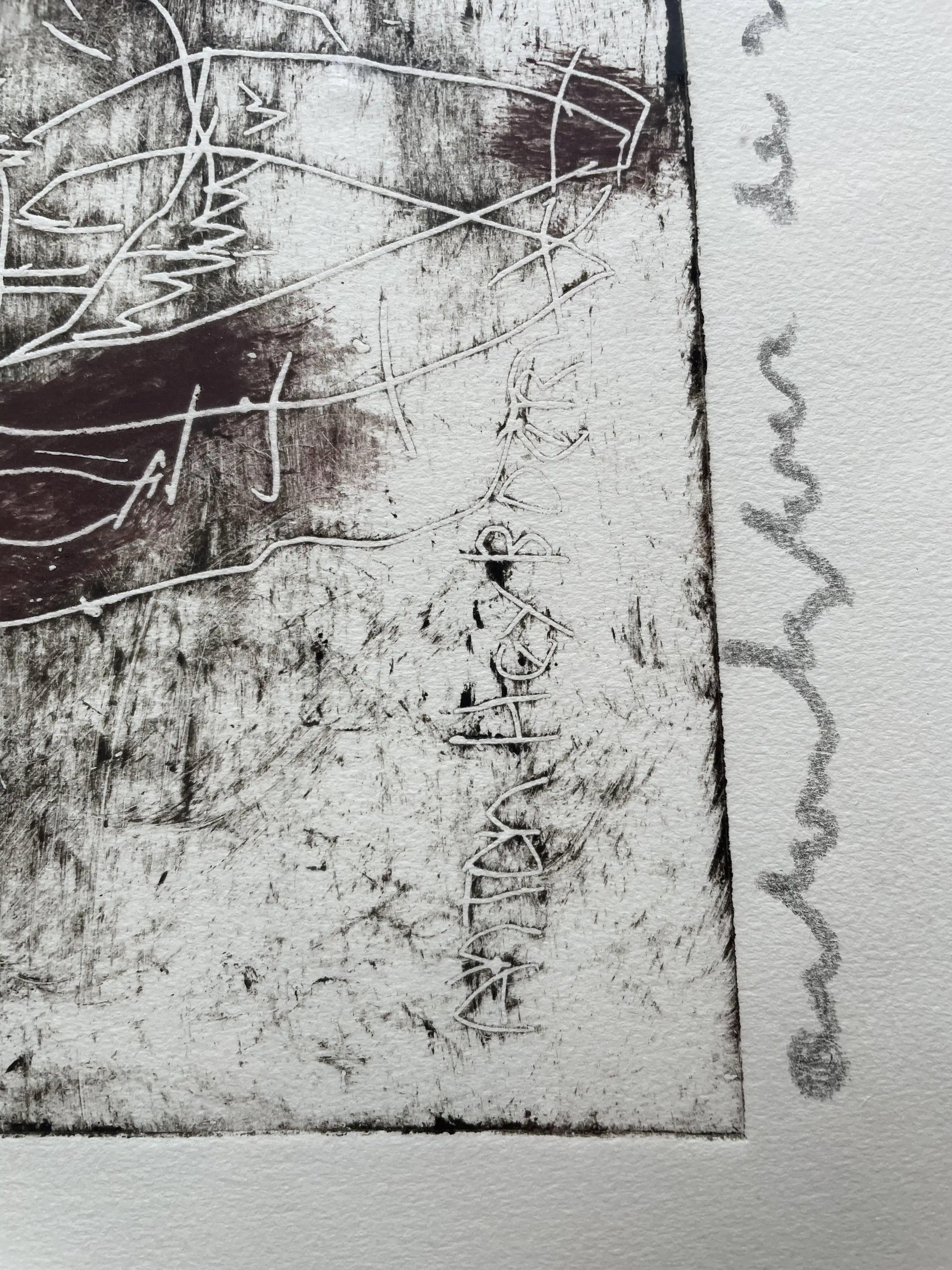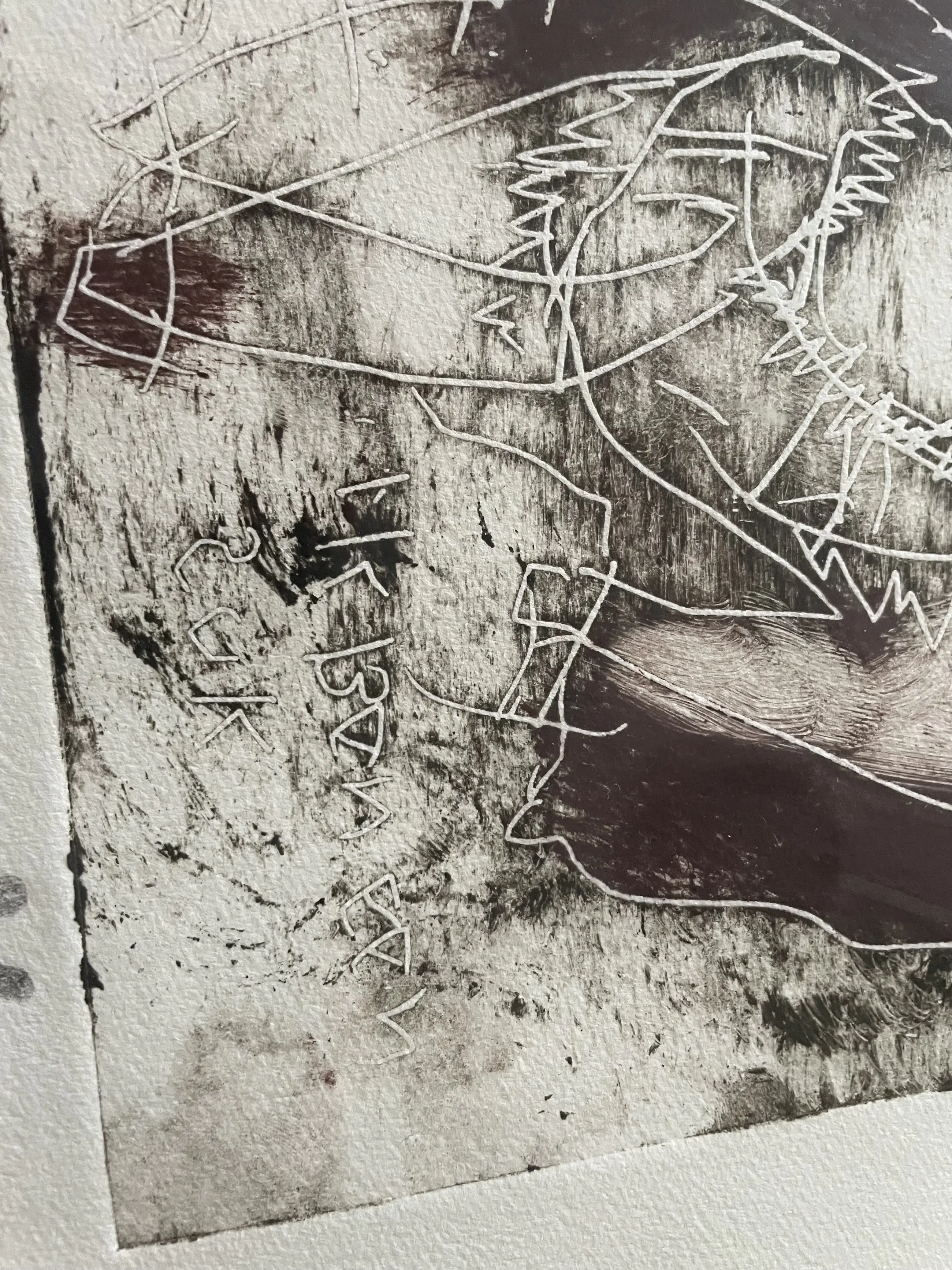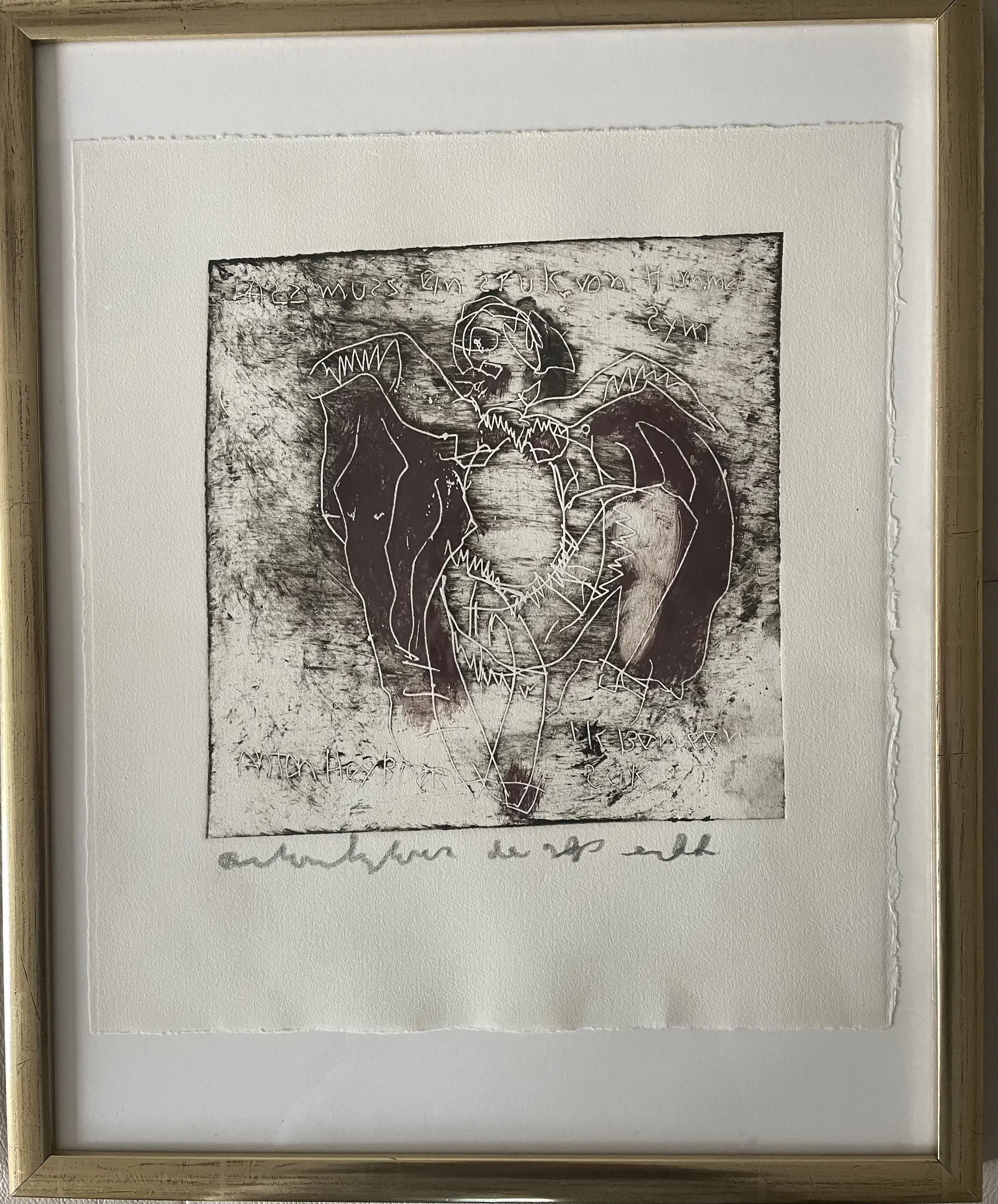 Originele ets van Anton Heyboer, met de typerende expressieve lijnvoering en symbolische beeldtaal. Boven in de plaat staat de tekst “Das muss ein Stück von Himmel sein”, een veelzeggende titel die mooi past binnen Heyboers spirituele en filosofische oeuvre. Het werk is zowel in potlood als in de plaat gesigneerd, wat de authenticiteit bevestigt. De ets is professioneel ingelijst en verkeert in perfecte staat.