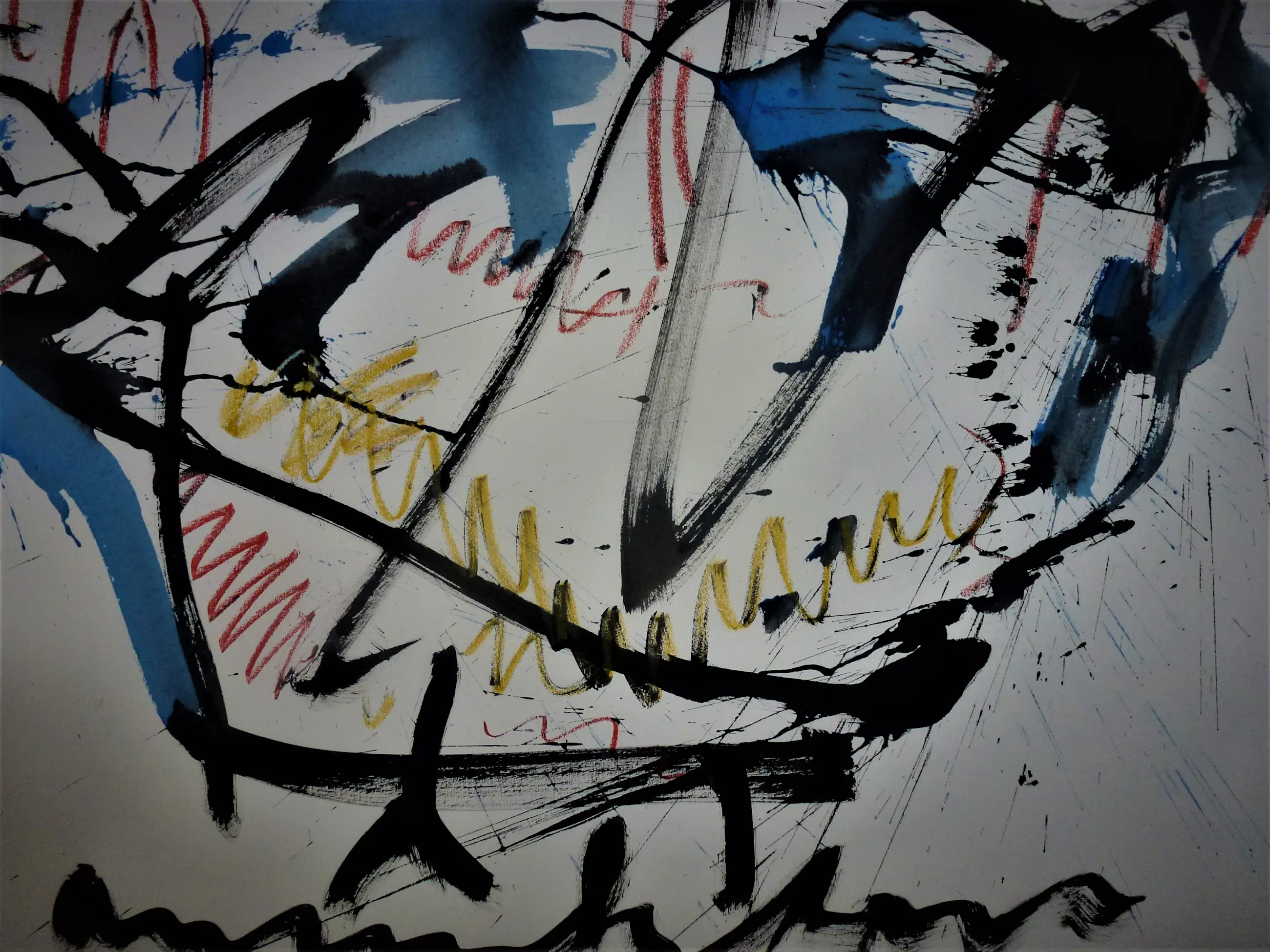 Geschilderd door Anton Heyboer in 1988 met acrylverf en oostindische inkt en getekend met wasco op Hahnemühle papier . Afmetingen : 78 cm x 108 cm . Voorstelling : De oer vogel . Mooie krachtige sierlijke kleurige schildering van de oer vogel . Conditie : Zo goed als nieuw . Herkomst : Gekocht in 1988 van Anton Heyboer.