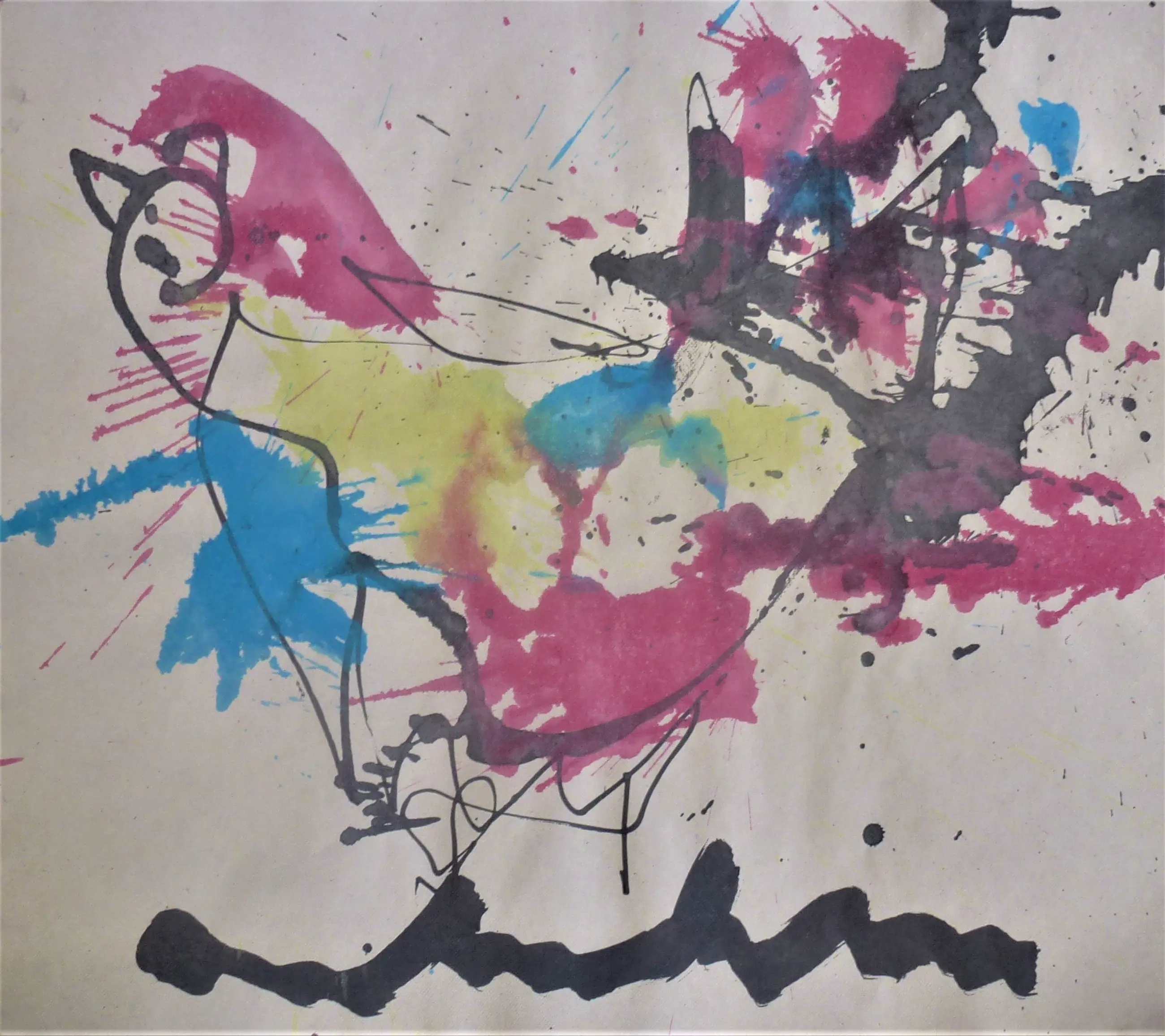 Geschilderd door Anton Heyboer in 1988 met acrylverf en oostindische inkt op hand geschept papier . Papier gemaakt door papiermolen de Schoolmeester te Westzaan van lompen . Afmetingen : 64 cm x 72 cm Voorstelling ; De oervogel . Mooie krachtige sierlijke kleurige schildering . Conditie : Zo goed als nieuw . Herkomst : Gekocht in 1988 van Anton Heyboer . Wordt aangetekend verzonden .