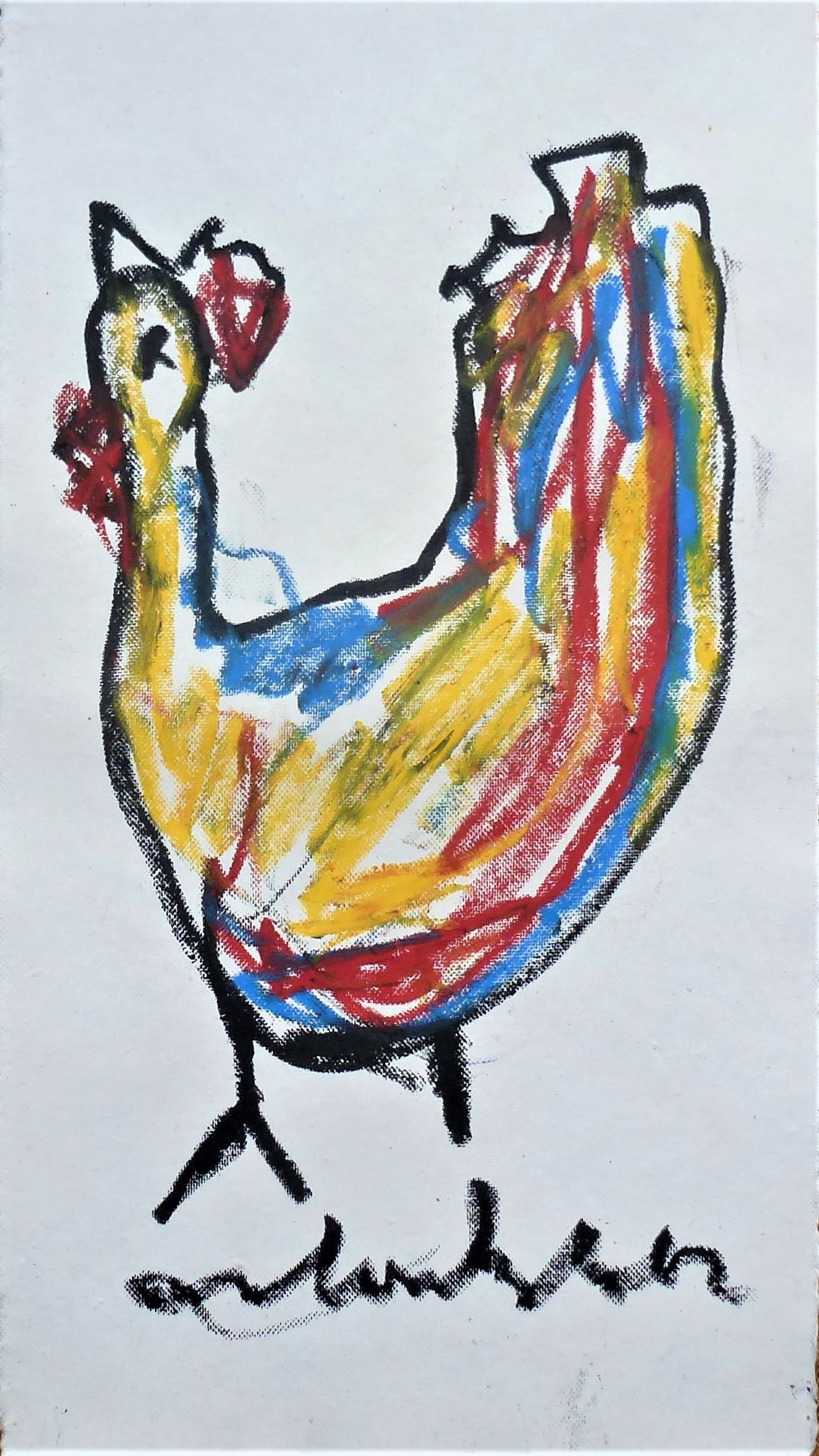 Getekend door Anton Heyboer in 1988 met olie vetkrijt op handgeschept papier . Papier gemaakt door papiermolen de Schoolmeester te Westzaan van lompen . Afmetingen : 62,5 cm x 34,5 cm . Voorstelling : De oervogel . Conditie : Zo goed als nieuw . Herkomst : Gekocht in 1988 van Anton Heyboer . Wordt aangetekend verzonden .