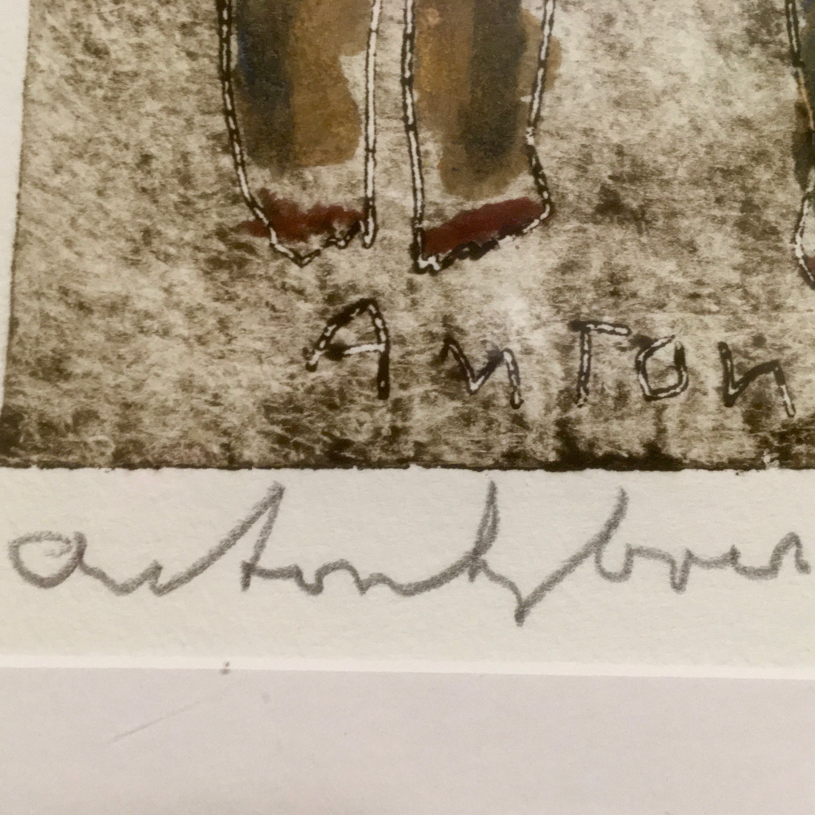 Zeldzame kleurenets (eigen druk) van Anton Heyboer uit het midden van de negentiger jaren van de vorige eeuw. In 1996 aangekocht bij Petra, de vijfde bruid, in het huisje annex winkeltje in Den Ilp, tegenover het onderkomen van de maker zelf en z’n vier vrouwen. Het werk is zowel in de plaat als in potlood gesigneerd. Volgens de kunstenaar viel de prijs wat hoger uit ’omdat er geel in zit’.
