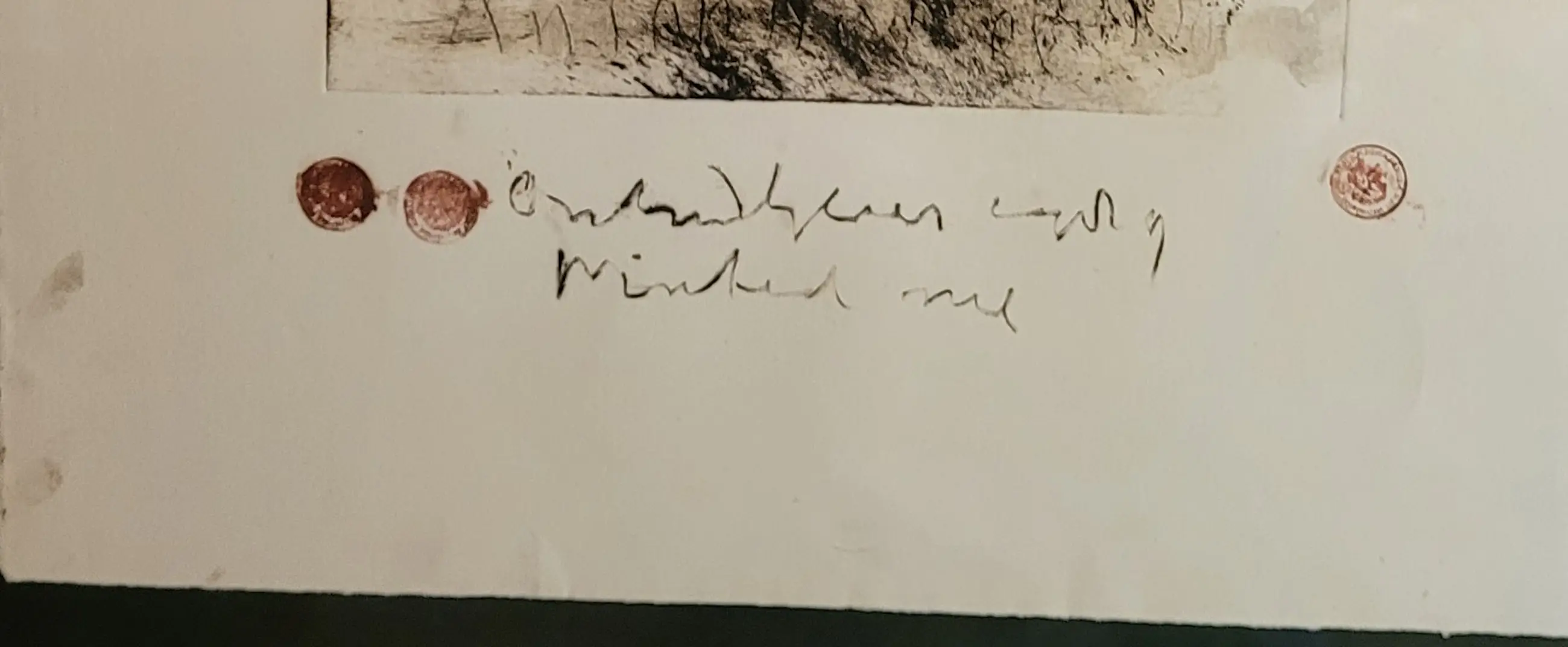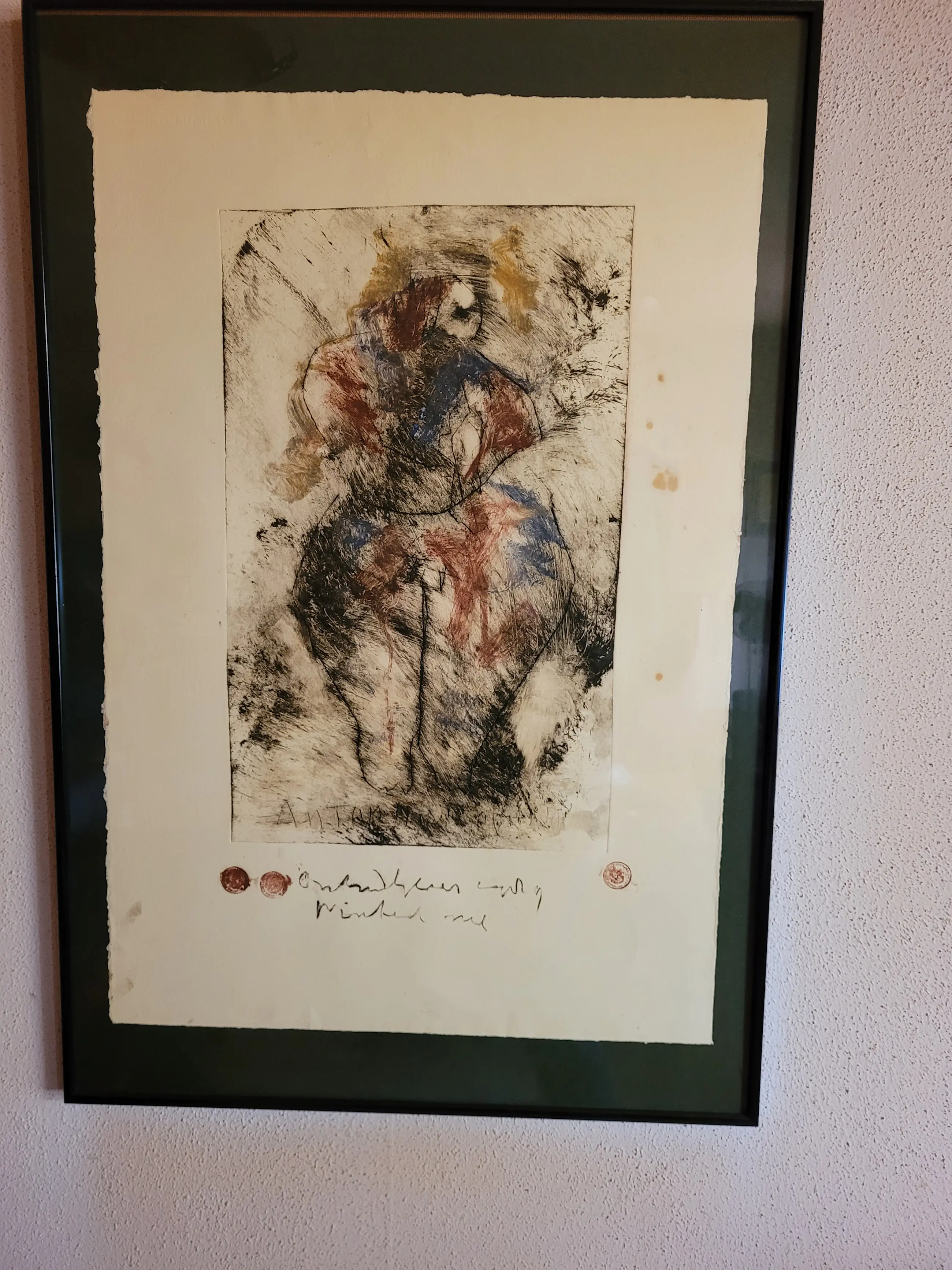Uit erfenis verkregen, ingelijste ets in rood, blauw en geel. Titel onbekend. Gesigneerd met muntafdrukken